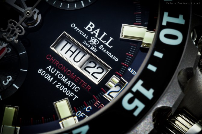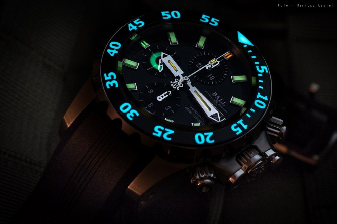 Na prostej tarczy (w kolorze czarnym lub niebieskim – w zależności od wybranego przez klienta wariantu kolorystycznego) dominują duże i proste w formie indeksy godzinowe. Uzupełniają je elementy podziałki sekundowej. Sub-tarcze chronografu ułożono w układzie pionowym. Na godzinie 9 umieszczono sub-tarczę tzw. „małej sekundy”. Tarczki położone na godzinie 6 i 12 odpowiadają za zliczanie godzin (do 12) i minut (do 30), gdy uruchomiony jest stoper. W zegarkiu zamontowano 21 rureczek wypełnionych gazem, dzięki czemu zarówno wskazówki jak i indeksy godzinowe są doskonale widoczne np. przez całą noc. Ciekawym rozwiązaniem jest podział kolorystyczny elementów: indeksy godzinowe świecą na zielono, wskazówki na żółto, a indeks na godzinie 12 emituje barwę pomarańczową. Cyferblat chroni grube na 3,7mm szkło szafirowe, które pokryto warstwą antyrefleksyjną. Całość uzupełnia datownik umieszczony na godzinie 3. Pomimo sporej ilości wskazań, tarcza jest czytelna. Jako osoba wykonująca zdjęcia, które wiążą się z oglądaniem przedmiotów w dużych powiększeniach, muszę przyznać, że niewiele firm produkuje czasomierze z tak czystymi tarczami. Są one zupełnie wolne od jakichkolwiek pyłków, co wcale nie jest tak oczywiste jak mogło by się wydawać. Dla zobrazowania sytuacji dodam, że każdy nawet naprawdę mały element mam okazję w trakcie wykonywania zdjęć i obróbki oglądać powiększony do naprawdę sporych rozmiarów, więc żadna ewentualna skaza nie ma szans zostać niezauważona. W zegarkach firmy Ball powierzchnia cyferblatu oraz znajdujących się na jego powierzchni elementów jest wzorowo czysta.