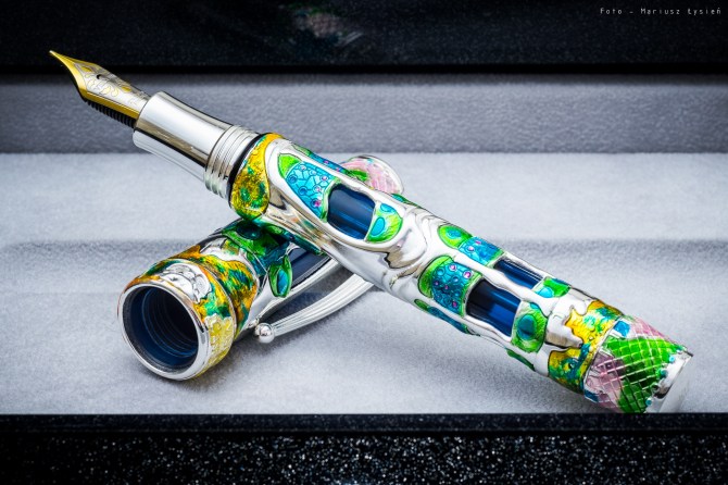 Jeżeli chodzi o zastosowane materiały to jest to przede wszystkim srebro połączone z żywicą. Z tego ostatniego materiału wykonano głównie transparentne niebieskie elementy, przez które możemy obserwować stalówkę czy pozostałą ilość atramentu wewnątrz korpusu pióra. Skuwkai jak i korpus są tak ukształtowane, że przypominają umieszczone w Casa Batlló okna, przez które możemy zajrzeć do wnętrza.