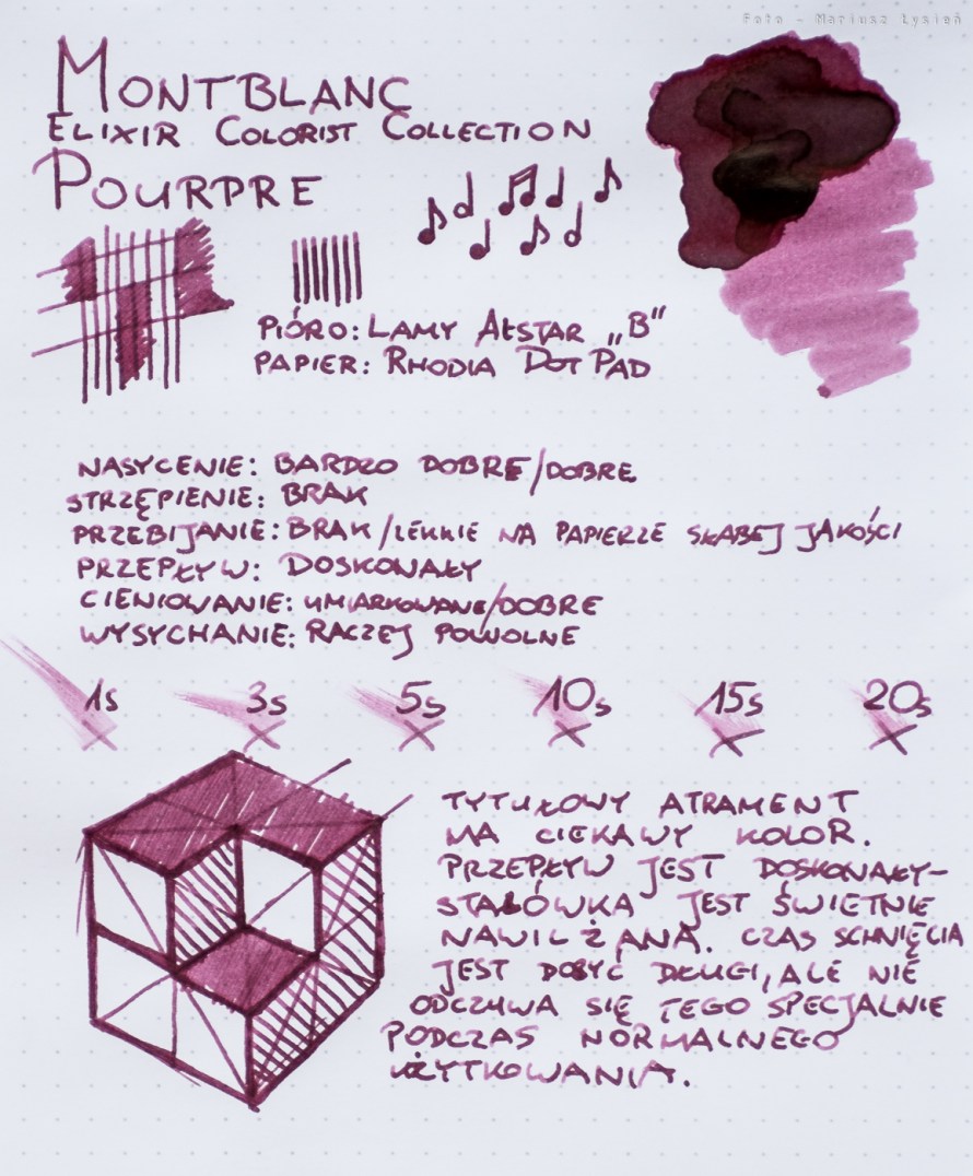 Montblanc Elixir Colorist Collection – Pourpre jest dla mnie niemałym, lecz bardzo pozytywnym zaskoczeniem. Pierwotnie wydawało mi się, że będzie to najmniej ciekawy atrament z całej trójcy o nazwie Elixir. Po przetestowaniu wszystkich kolorów uważam, że jest on właśnie najciekawszą propozycją. Zdecydowanie polecam wszystkim miłośnikom barw purpurowych. Atrament wyceniono na około 80 Euro, co u nas przekłada się na ceny w okolicach 310-340zł. Czy atrament ten jest wart tej ceny? Myślę, że każdy musi odpowiedzieć na to pytanie indywidualnie. Ekskluzywne produkty producentów z segmentu premium rządzą się własnymi prawami, a linia Elixir zdecydowanie do produktów premium się zalicza. Ja Elixir Pourpre zdecydowanie polecam.