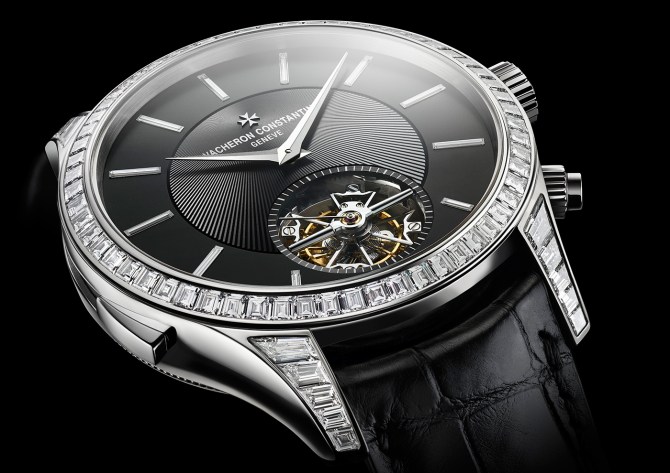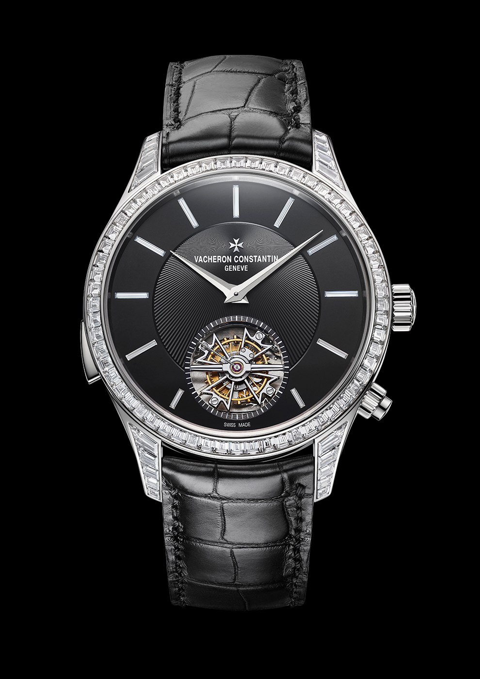 Na głównej tarczy umieszczono wskazanie bieżącego czasu. Czarna powierzchnia cyferblatu została w centralnej części ozdobiona giloszowanym wzorem. Na zewnętrznym pierścieniu umieszczono indeksy godzinowe, które wykonano z diamentów. Ponad całością przesuwają się wskazówki wyprodukowane z białego złota. Na godzinie 6 umieszczono wycięcie przez którą widoczny jest moduł obiegowego wychwytu, który połączony jest z tzw. małą sekundą.