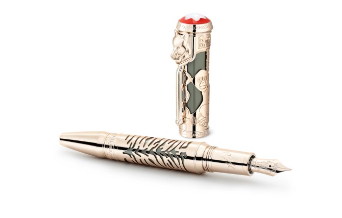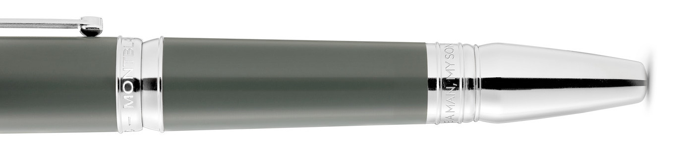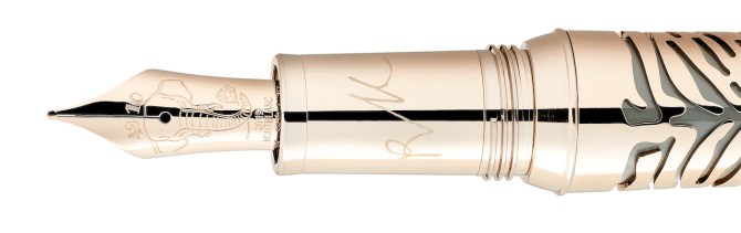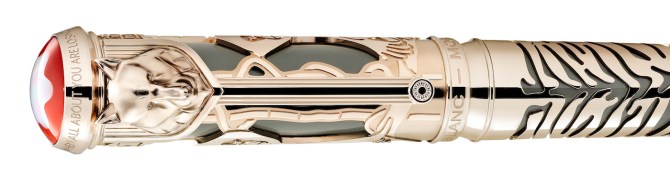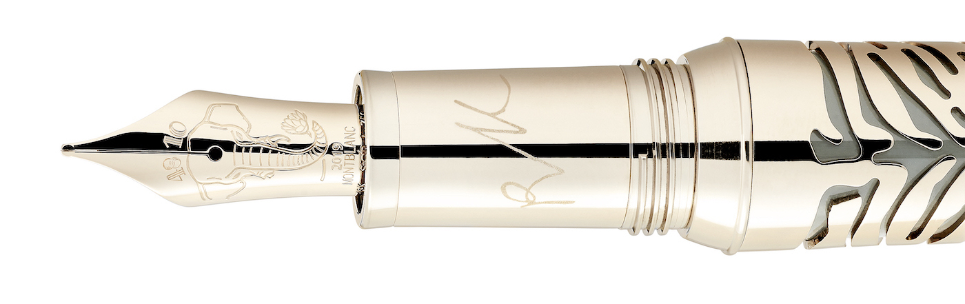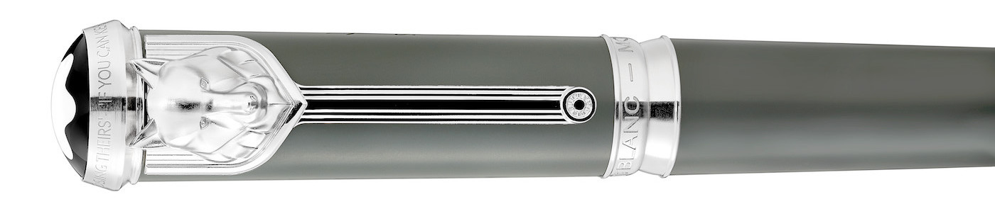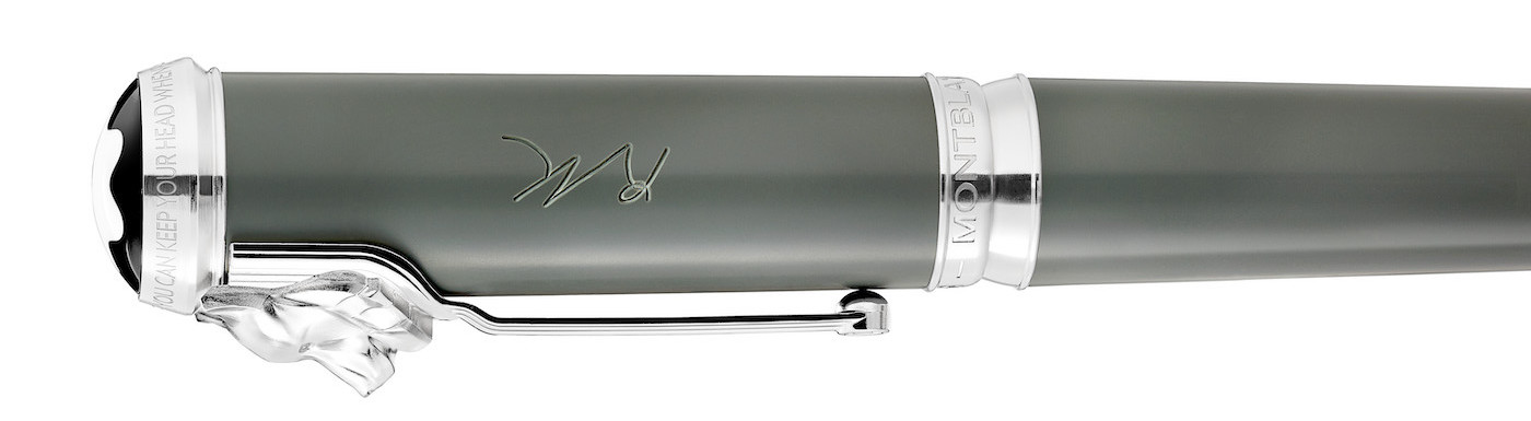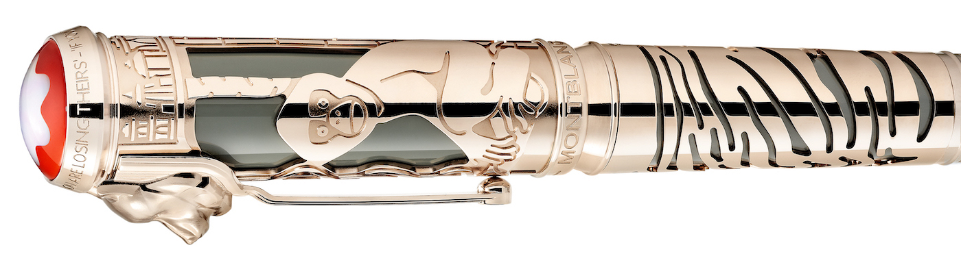Tym, co wydaje się szczególnie warte odnotowania, jest spójność stylistyki oraz przyjętych rozwiązań, niezależnie od tego czy mamy do czynienia z piórem wiecznym bądź długopisem. Wszystkie te rodzaje wyglądają podobnie. Zachowanie tak dużej spójności projektu przy różnych rodzajach przyborów nie jest zadaniem łatwym i rzadko kiedy udaje się tak dobrze jak w tym przypadku. Stosunkowo prosty klips opatrzono szeroką tarczą z głową wilka. To kolejne nawiązanie do wybitnego dzieła Kiplinga. Głowa ta ma symbolizować zwierzę, które znalazło i wychowało Mowgli’ego. Przybory piśmiennicze wieńczy wypukłe, białe logo marki Montblanc, które zostało oprawione w czarną żywicę. Wykonaną z 18 karatowego złota próby 750 stalówkę pokryto rodem. Jej powierzchnię zdobi globus stanowiący symboliczne nawiązanie do podróży Kiplinga.