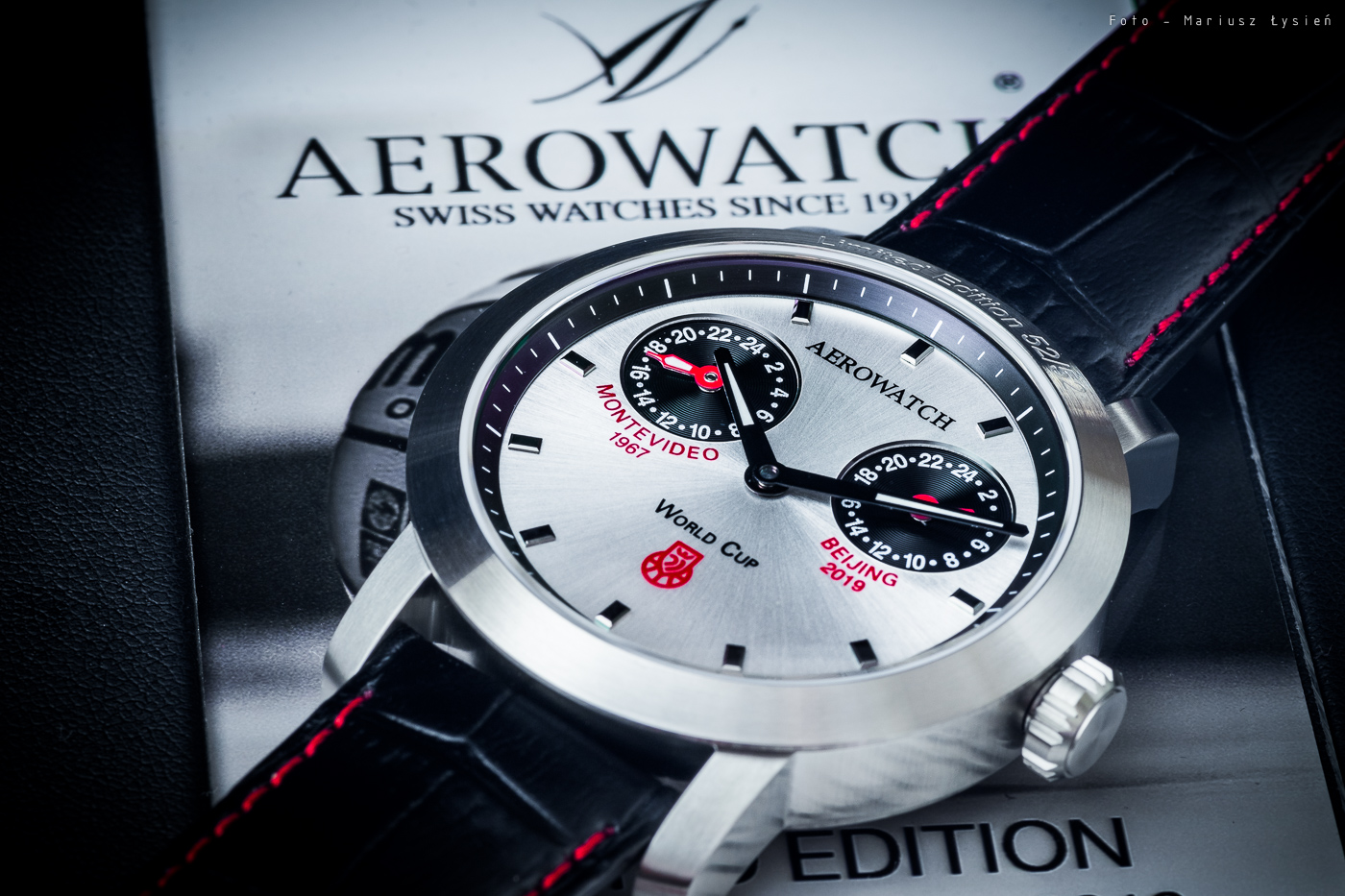 Tarcza ozdobiona szlifem słonecznym wyposażona została w nakładane indeksy godzinowe. Srebrzysta powierzchnia cyferblatu kontrastuje z czerwonymi i czarnymi dodatkami. Poza tłem podziałki minutowej, czarny kolor nadano sub-tarczom oraz centralnie osadzonym wskazówkom. Jeżeli jesteśmy przy wskazówkach, to te wypełniono Super-LumiNovą. Lewa sub-tarcza pokazuje bieżący czas w Montevideo (gdzie ostatni raz grała na MŚ nasza reprezentacja w roku 1967), natomiast prawa wskazuje czas w Pekinie (gdzie odbędą się najbliższe Mistrzostwa Świata). Stosowne informacje oraz daty umieszczono na powierzchni tarczy. Stylistyka zegarka jest nieco surowa i można by napisać, że stonowana jak na zegarek o sportowych powiązaniach.