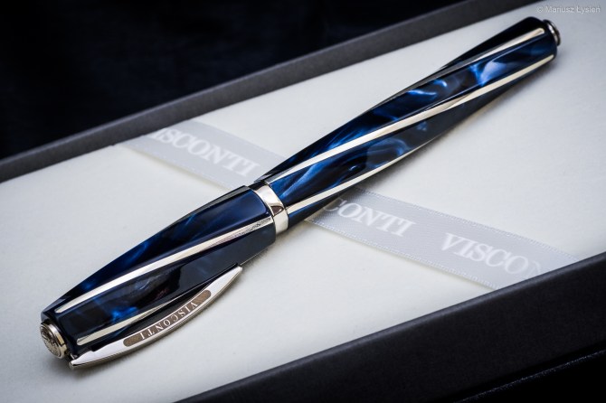 Skuwkę, sekcję i korpus wykonano z żywicy o perłowo-niebieskim odcieniu. Bogactwo przejść tonalnych pomiędzy fragmentami jasnymi i ciemnymi sprawia, że pióro prezentuje się doskonale. Jego ciemna barwa prezentuje się równocześnie naprawdę elegancko. Daje się odczuć, że materiał z którego wykonano produkt jest wysokiej jakości. Skuwkę wieńczy logo producenta. Na skuwce znajdziemy klips w kształcie łuku, który jest tak charakterystyczny dla produktów Visconti.