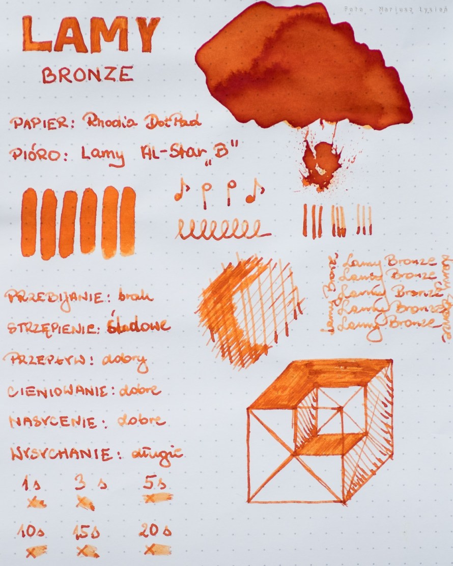 Lamy Bronze jest atramentem, którego nazwa nie do końca oddaje jego barwę, to zdecydowanie bardziej odcień pomarańczowy z nuta brązu, nie brąz. Jeśli kojarzycie Copper Orange od Lamy, to na pewno znajdziecie kolorystyczne podobieństwo między tymi atramentami.