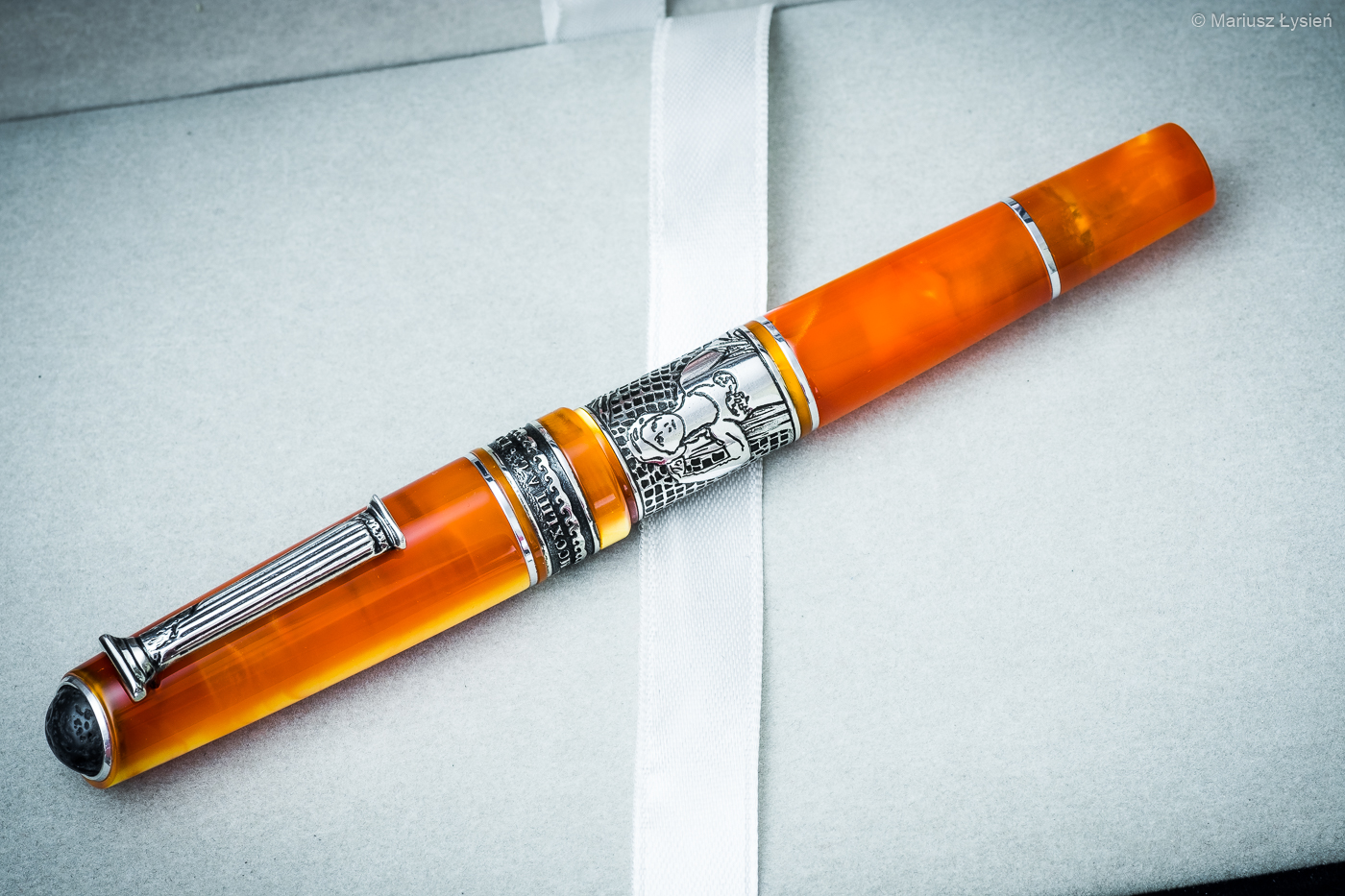 Tytułowe pióro również należy do produktów charakterystycznych dla tego włoskiego producenta. Szeroki pierścień umieszczony na korpusie nie pozostawia złudzeń – większość modeli firmy Marlen taki posiada. Drugim elementem jest rzeźbiarska forma klipsa. Tak w ogromnym skrócie można by je opisać. Produkt oferowany jest w pudełku obleczonym aksamitem, natomiast całość została zapakowana dodatkowo w czarne pudełku z dobrej jakości kartonu.