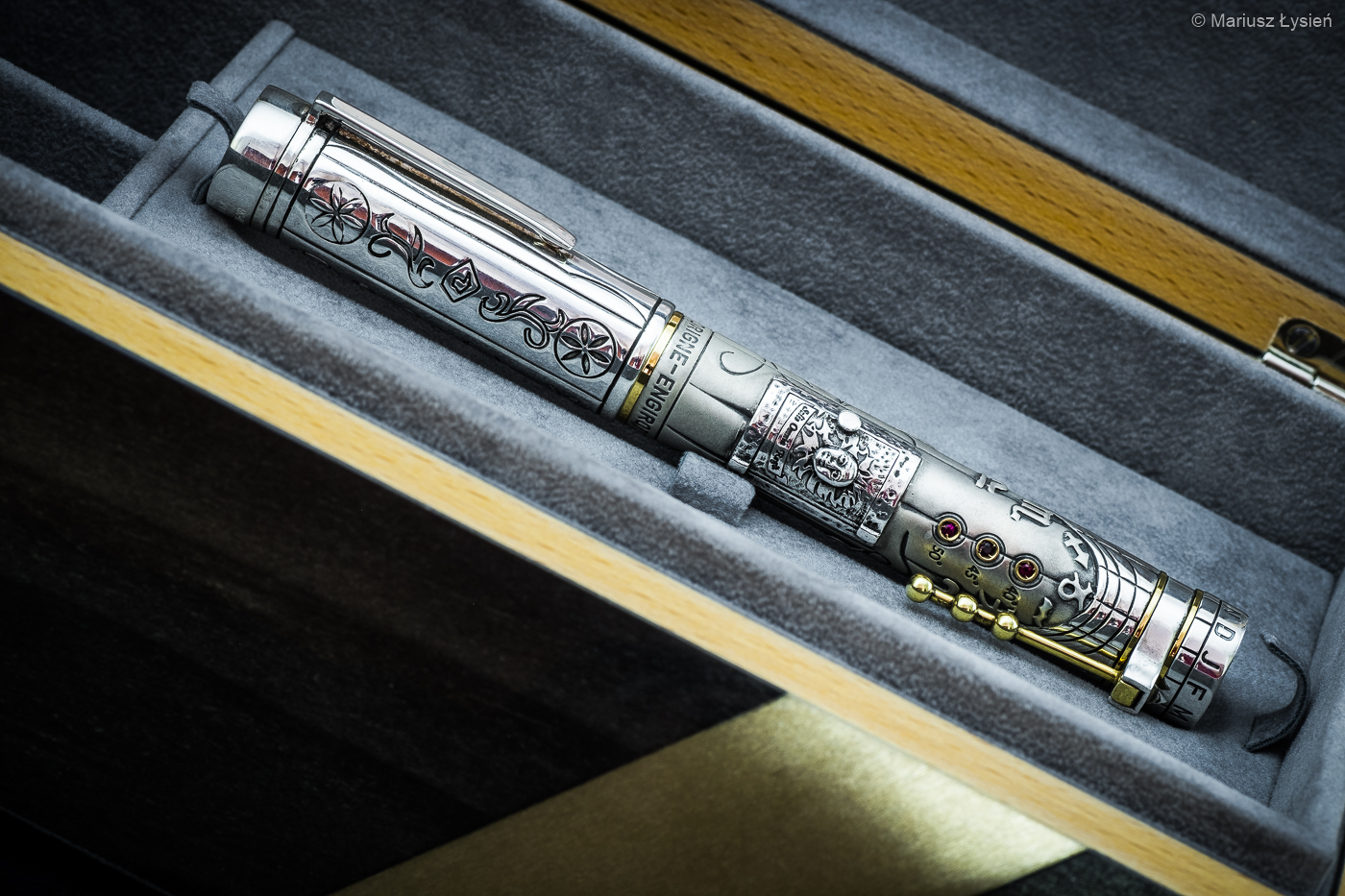 Jakie jednak jest Cadran Solaire w bezpośrednim kontakcie? Na pewno jest majestatyczne. Rozmiary (zarówno średnica jak i długość) w połączeniu z dużą ilością szlachetnego metalu powodują wrażenie obcowania z berłem. Po wzięciu tego modelu do ręki zaczynamy się zastanawiać, „czy tym da się w sensowny sposób pisać?”, ale o tym jednak nieco później… Wracając do zdobień – ich ilość wydaje się być doskonale wyważona. Nietypowe znaki dookoła korpusu wraz z podziałkami przywołują na myśl mityczne runy umieszczone na starożytnym artefakcie. W rzeczywistości motywy ozdobne pełnią w dużej mierze rolę oznaczeń wynikających z konstrukcji tzw. „wertykalnego zegara cylindrycznego”, którego rolę może pełnić to pióro. Narzędzie to było w przeszłości często wykorzystywane przez podróżników, pasterzy oraz pielgrzymów – szczególnie w obszarach Pirenejów. Jednym z elementów funkcjonalnych takiego zegara, jest odchylany element korpusu, który można by potraktować jako dodatkowy klips, którym jednak w rzeczywistości on nie jest. Złoty kolor tego elementu powtarza się na kilku dodatkowych pierścieniach przedzielających srebro, z którego wykonano zarówno skuwkę jak i korpus. Ich powierzchnia została wykończona na kilka różnorodnych sposobów, dzięki czemu ilość detali, które mogą przysłowiowo „cieszyć oko” jest naprawdę spora. Dodatkowe elementy na tej powierzchni nie powodują wrażenia przeładowania. Jest to pod tym względem świetnie zrównoważony projekt. Prosty w formie klips stanowi funkcjonalne, acz nienachalne uzupełnienie całości. Na korpusie umieszczono jeszcze jeden dosyć tajemniczy element – jest nim klapka z wizerunkiem słońca. Po jej otwarciu uzyskujemy dostęp do mechanizmu napełniania pióra. Element ten ozdobiono pokaźnej wielkości rubinem. Te same kamienie szlachetne i ilości trzech, znajdziemy na korpusie. Trzeba przyznać, że firma Marlen wyróżnia się na rynku, jeżeli chodzi o pomysłowość dotyczącą sposobów zasilania pióra. W tym przypadku nie jest inaczej – jest niestandardowo i efektownie.