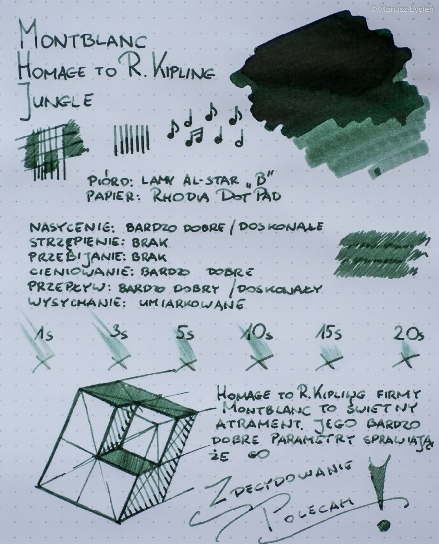 Montblanc Writers Edition, Homage to R. Kipling – Jungle, to świetny atrament, którego doskonałe parametry sprawiają, że mogę go polecać z czystym sumieniem. Parametry to jednak nie wszystko. Dużym atutem jest nietuzinkowy kolor, który wraz z bardzo dobrym cieniowaniem sprawia, że notatki wyglądają atrakcyjnie. Pozytywną niespodzianką jest znaczna odporność atramentu na wodę, co gwarantuje, że nawet w przypadku niespodziewanego zalania notatek, uda się odczytać ich treść.