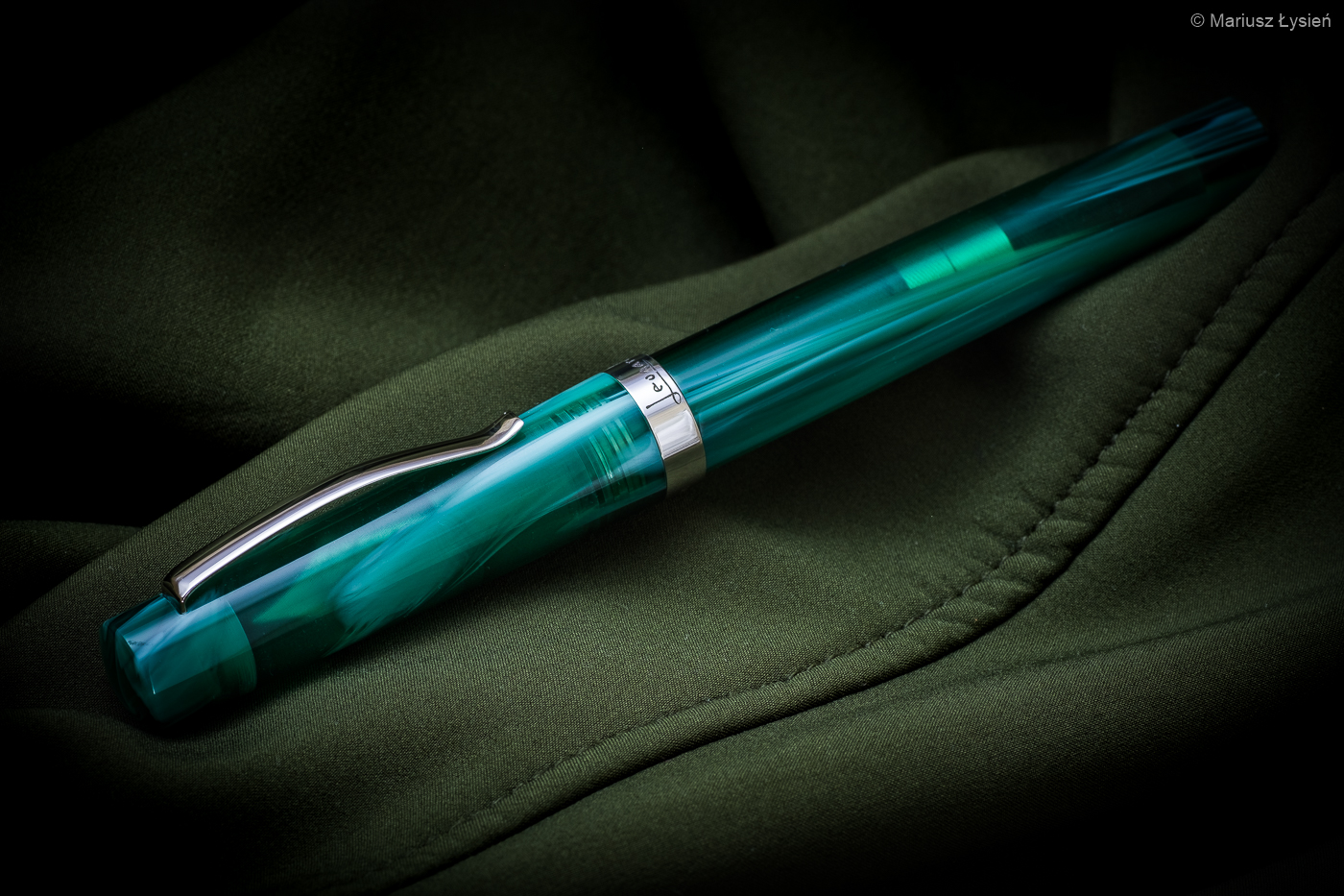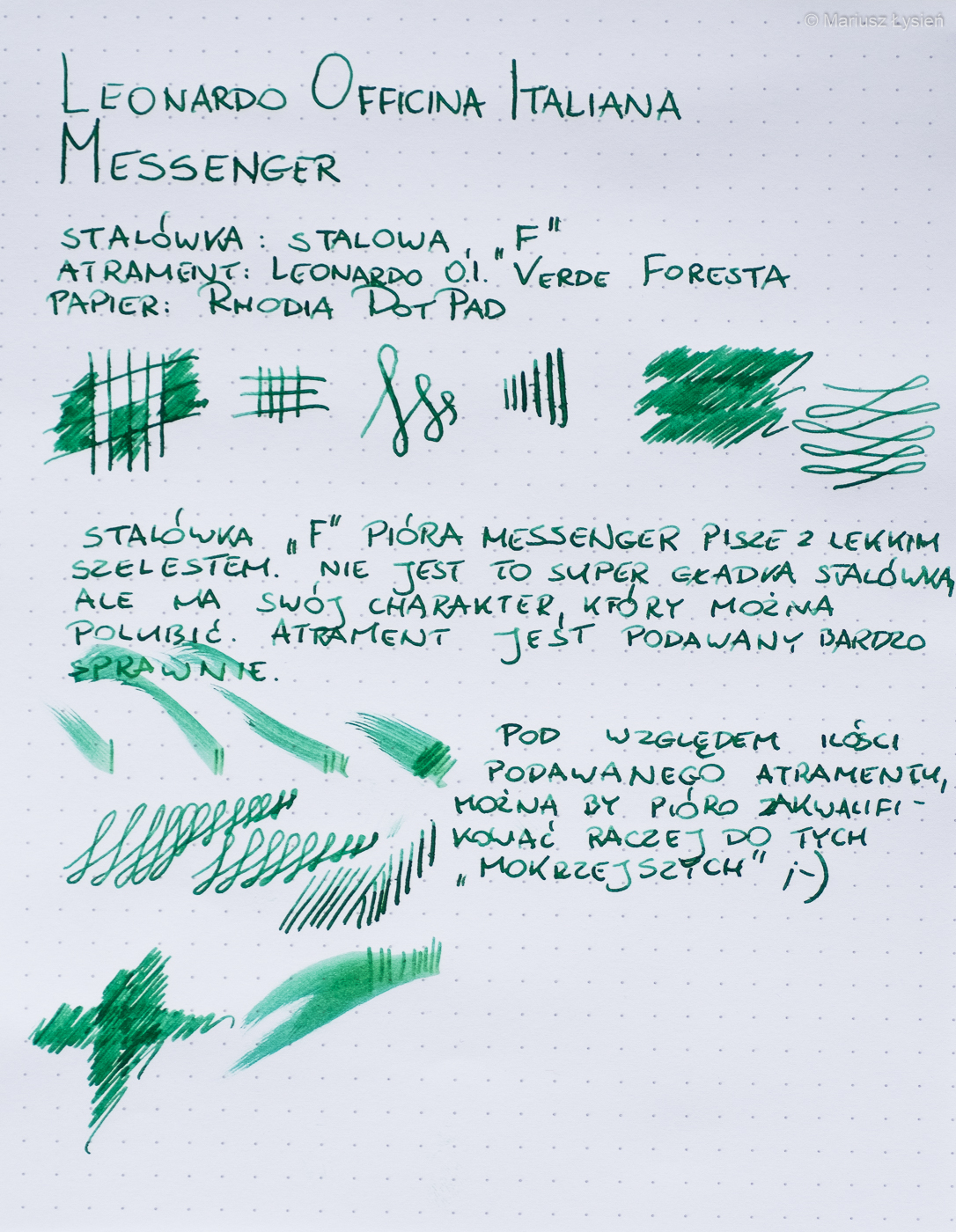 W testowanym przez nas egzemplarzu zamontowano stalówkę wykonaną ze stali nierdzewnej. W przypadku szerokości „F” linia jest wąska – można by ją określić jako „prawdziwe F”, lub w wybranych przypadkach coś z pogranicza F i M”. Ze względu na zastosowany materiał, nie jest ona elastyczna, chociaż w określonych przypadkach uda nam się nieco wpłynąć na szerokość uzyskiwanej kreski. Do testu wybrałem atrament Verde Foresta tego samego producenta. Stalówka pracowała bardzo poprawnie, chociaż nie wydała mi być oszlifowaną szczególnie gładko. Zamiast tego sunęła po papierze z wyraźnym, acz przyjemnym szelestem. Nie miałem żadnych problemów ze startem czy przerywaniem – wszystko było tak, jak być powinno. Jeżeli chodzi o ilość podawanego atramentu, to trzeba przyznać, że linia była solidnie nasączona – widać to na arkuszu np. w miejscu gdzie rozcierając celowo poszczególne fragmenty, rozmazaniu uległ również napisany chwilę wcześniej tekst.
