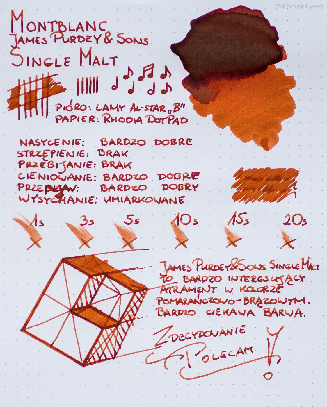 Montblanc James Purdey & Sons, Single Malt to bardzo dobry atrament, który zdecydowanie mogę polecić każdemu – zarówno miłośnikom atramentów brązowo-pomarańczowych, jak i tym, którzy chcieliby taki kolor wypróbować w swoim piórze. Świetne właściwości idące w parze z atrakcyjnie prezentującym się opakowaniem sprawiają, że używanie tego atramentu jest przyjemnością. Kolor uzyskiwany na papierze sprawia, że nasze notatki zdecydowanie wyróżniają spośród wielu bardziej typowych odcieni atramentów.