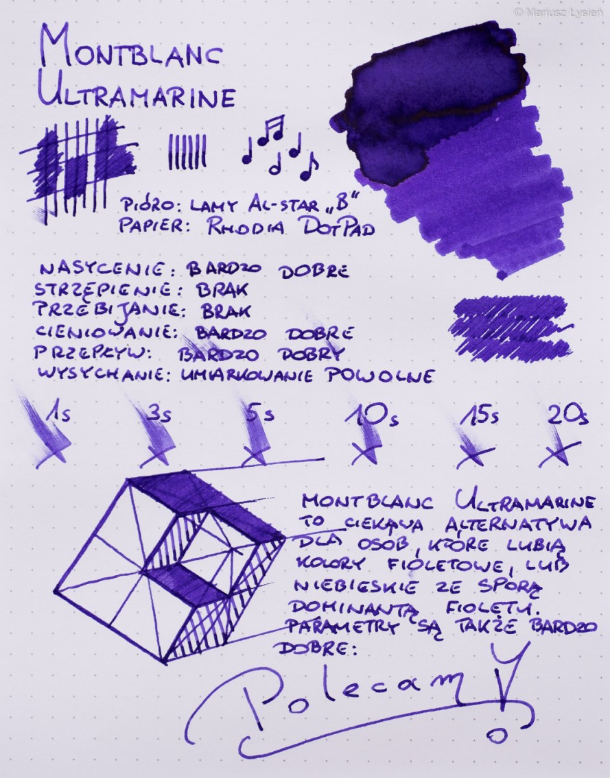 Montblanc Ultramarine to bardzo dobry atrament, który polecam wszystkim osobom lubiącym tego typu odcienie. Opisywany Ultramarine prezentuje się na papierze bardzo elegancko – kolor z pewnością będzie odpowiedni do podpisywania czy uzupełniania oficjalnych dokumentów.