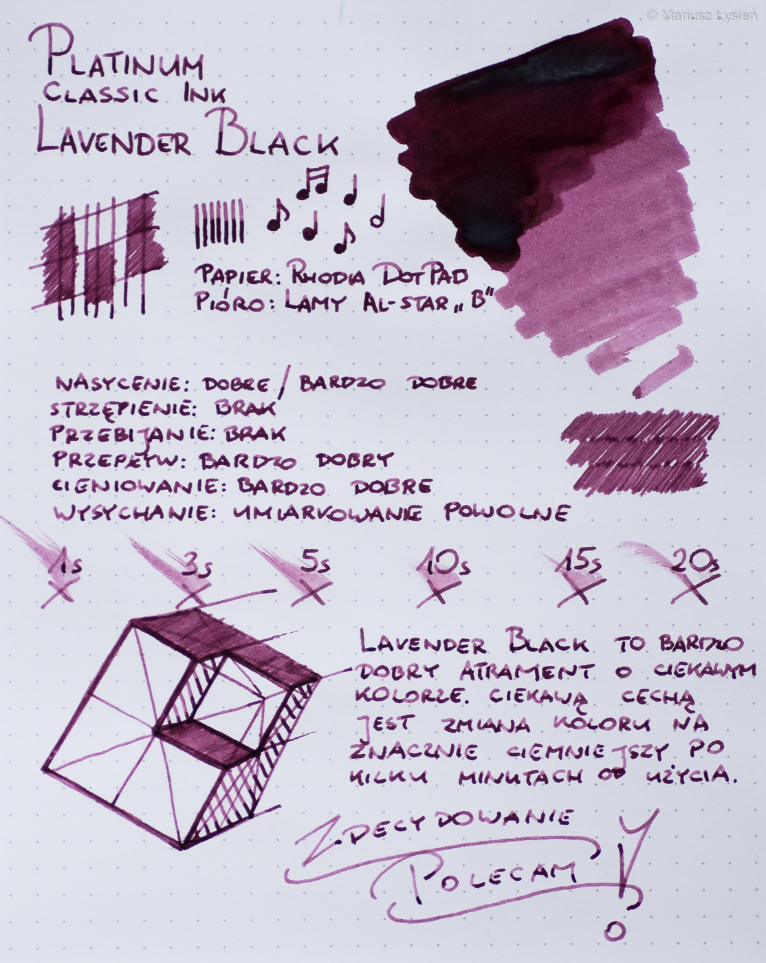Platinum Classic Ink – Lavender Black to bardzo dobry atrament, który zdecydowanie mogę polecić. Ciekawy kolor i bardzo dobre właściwości (wraz z dużą wodoodpornością) sprawiają, że właściwie każdy będzie z niego zadowolony.