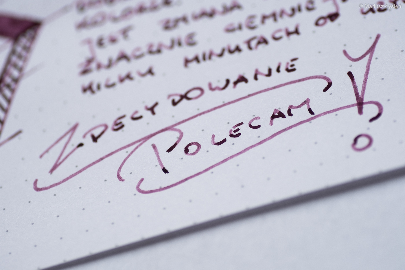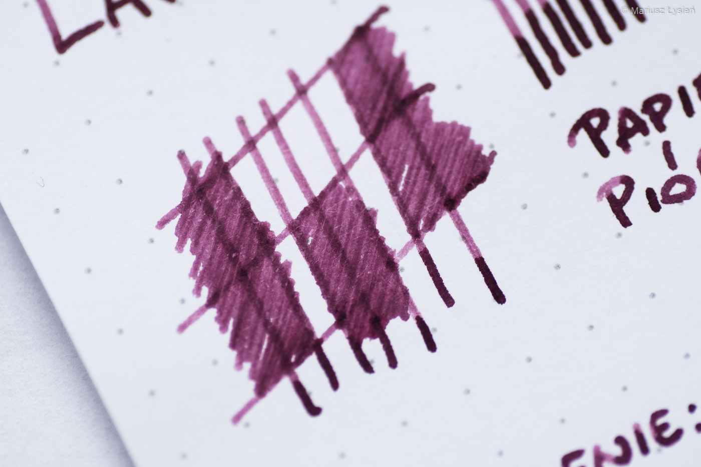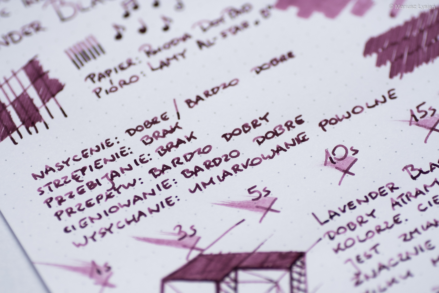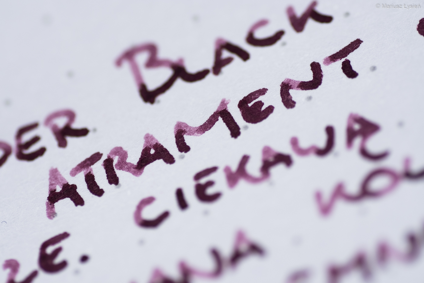 Lavender Black to atrament o kolorze różowo-fioletowym. Początkowo kolor jest dosyć jasny, jednak wraz z upływem czasu mocno ciemnieje. Efekt jest ciekawy i z pewnością dla wielu miłośników atramentów żelazowo-galusowych jest to jeden z podstawowych atutów. Nasycenie oceniam pomiędzy dobrym, a bardzo dobrym – dlaczego? Kolor jest wyraźny i z pewnością bardzo dobrze nasycony jednak dopisek „black” w nazwie przekłada się także na nieco mniej intensywny kolor – barwa jest jakby składową różu, fioletu i odrobiny czerni. Kolor jest ciekawy i bardzo elegancki.