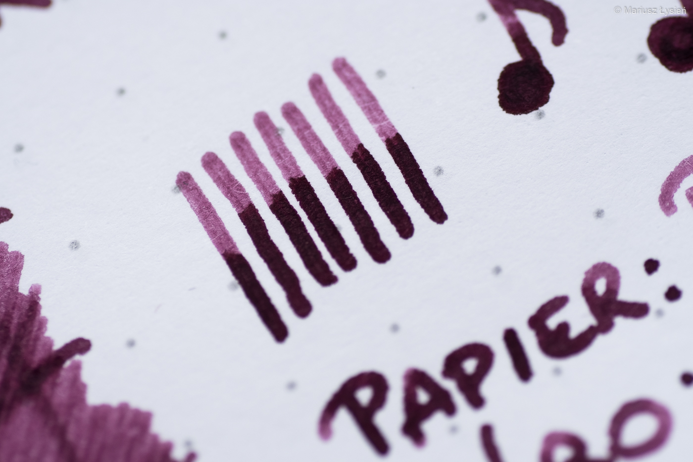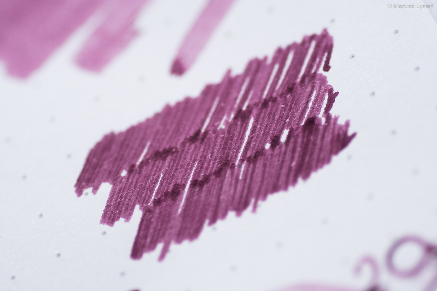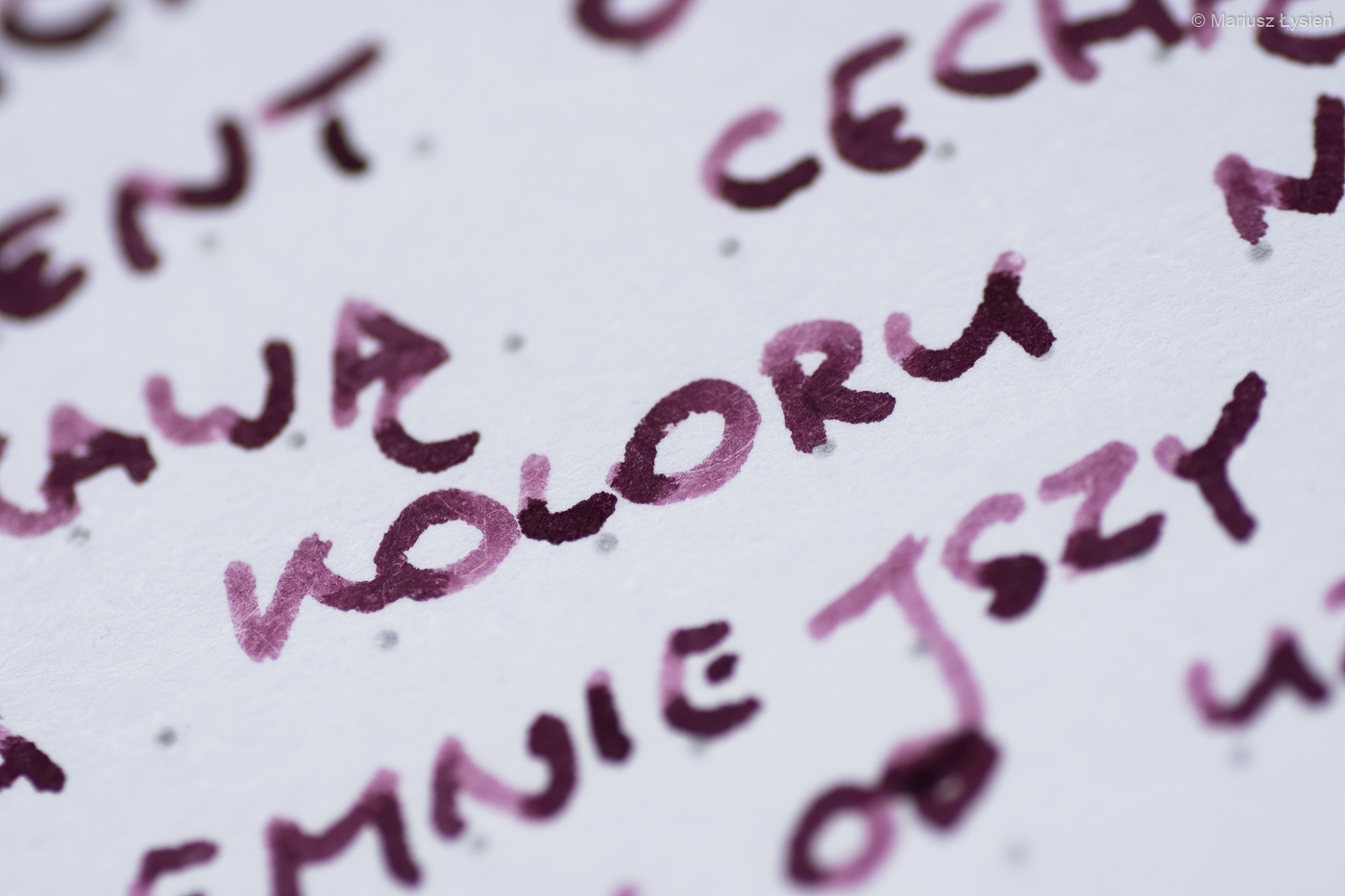 Lavender Black to atrament o kolorze różowo-fioletowym. Początkowo kolor jest dosyć jasny, jednak wraz z upływem czasu mocno ciemnieje. Efekt jest ciekawy i z pewnością dla wielu miłośników atramentów żelazowo-galusowych jest to jeden z podstawowych atutów. Nasycenie oceniam pomiędzy dobrym, a bardzo dobrym – dlaczego? Kolor jest wyraźny i z pewnością bardzo dobrze nasycony jednak dopisek „black” w nazwie przekłada się także na nieco mniej intensywny kolor – barwa jest jakby składową różu, fioletu i odrobiny czerni. Kolor jest ciekawy i bardzo elegancki.