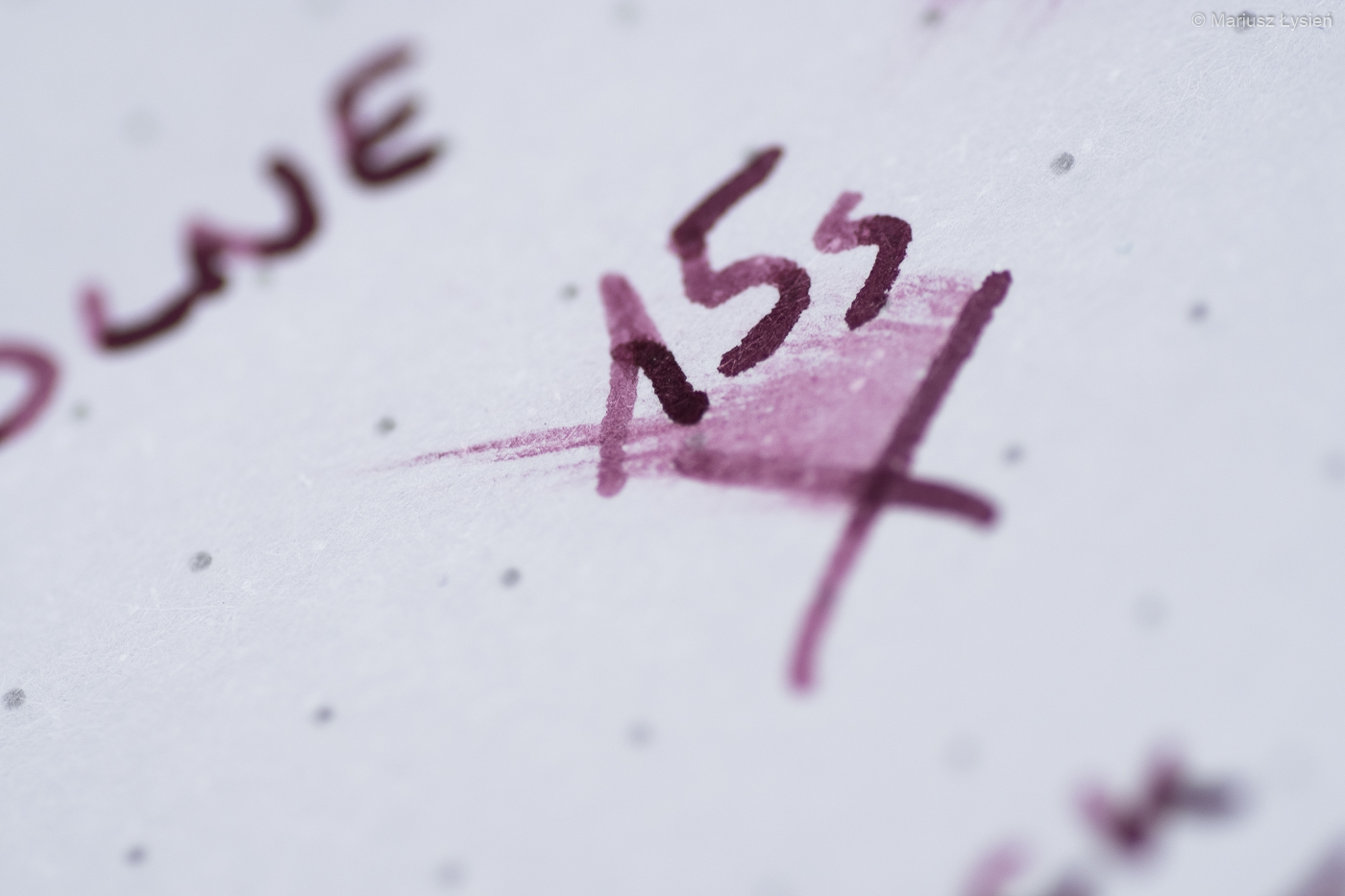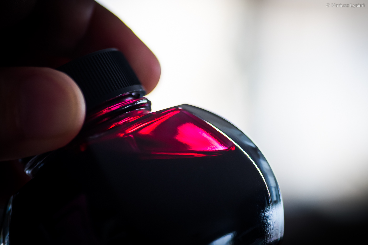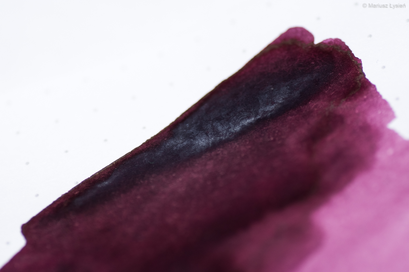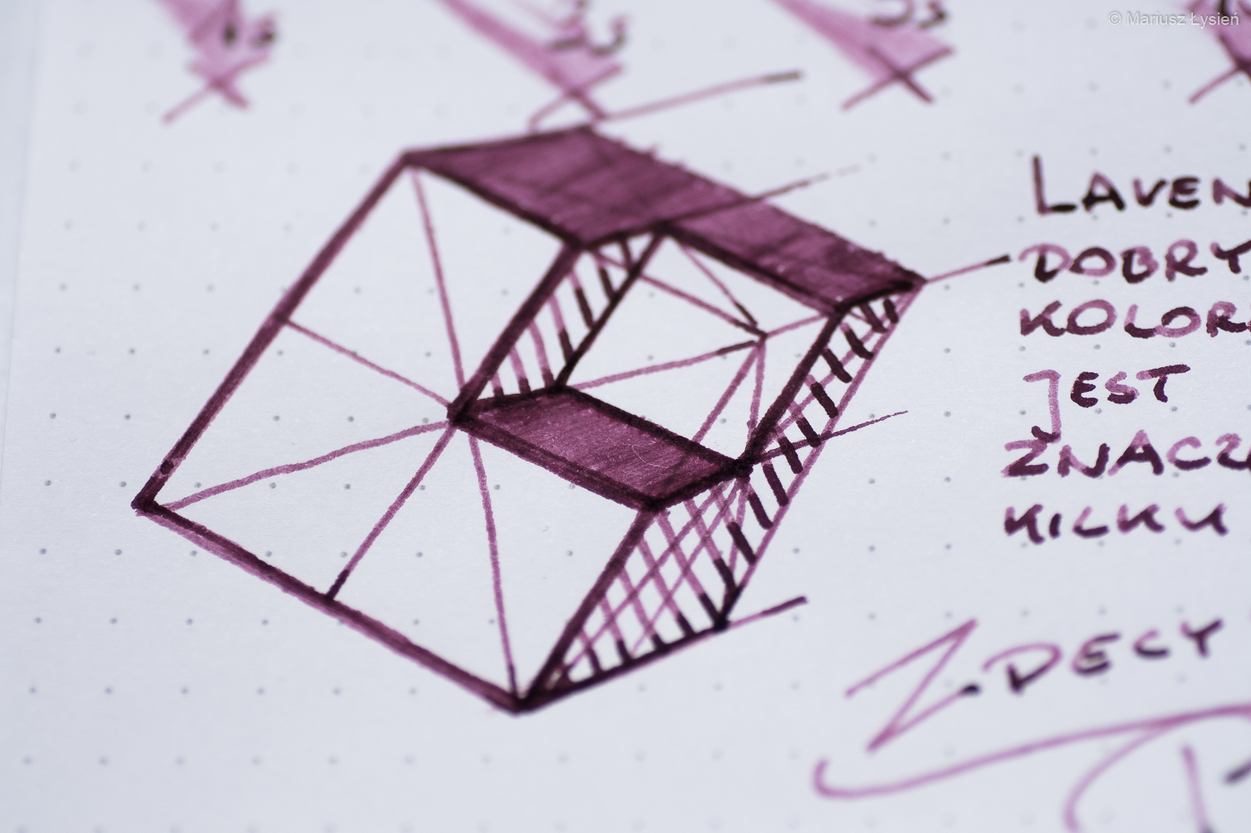 Lavender Black to atrament o kolorze różowo-fioletowym. Początkowo kolor jest dosyć jasny, jednak wraz z upływem czasu mocno ciemnieje. Efekt jest ciekawy i z pewnością dla wielu miłośników atramentów żelazowo-galusowych jest to jeden z podstawowych atutów. Nasycenie oceniam pomiędzy dobrym, a bardzo dobrym – dlaczego? Kolor jest wyraźny i z pewnością bardzo dobrze nasycony jednak dopisek „black” w nazwie przekłada się także na nieco mniej intensywny kolor – barwa jest jakby składową różu, fioletu i odrobiny czerni. Kolor jest ciekawy i bardzo elegancki.