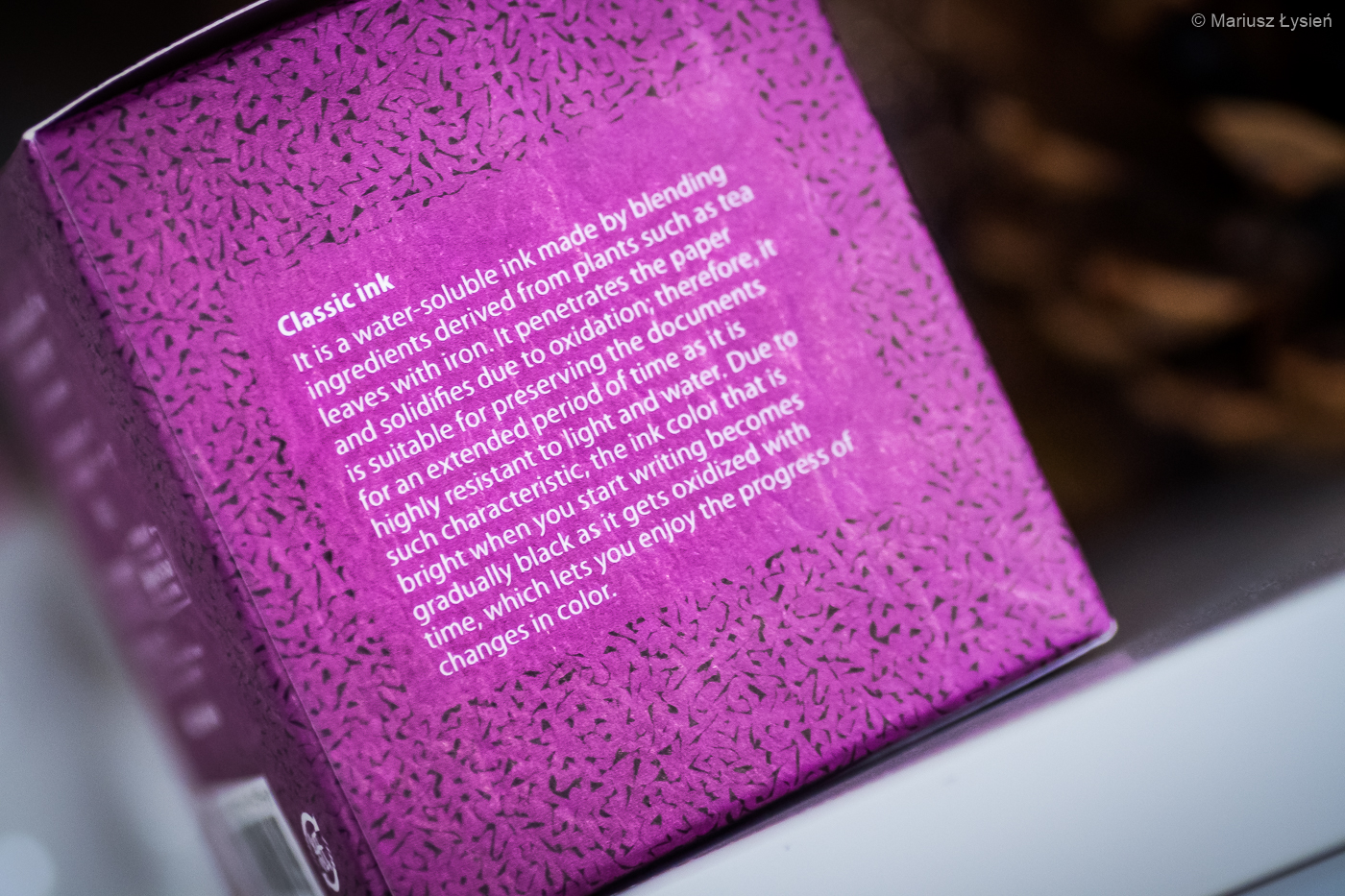 Firma Platinum jest jedną z niewielu, która nadal produkuje atramenty w oparciu o tradycyjne formuły. Linia Classic Ink należy do takich właśnie produktów. Zgodnie z informacją umieszczoną przez producenta na opakowaniu, atrament zawiera składniki pochodzenia naturalnego pozyskiwane między innymi z liści herbaty czy żelaza. Dzięki temu możemy inkausty te klasyfikować jako tzw. „żelazowo-galusowe”, które charakteryzują się dobrą wodoodpornością i nie blakną. Ciekawą właściwością jest także zmiana koloru (na ciemniejszy) wraz z upływem czasu, co związane jest z procesem utleniania.