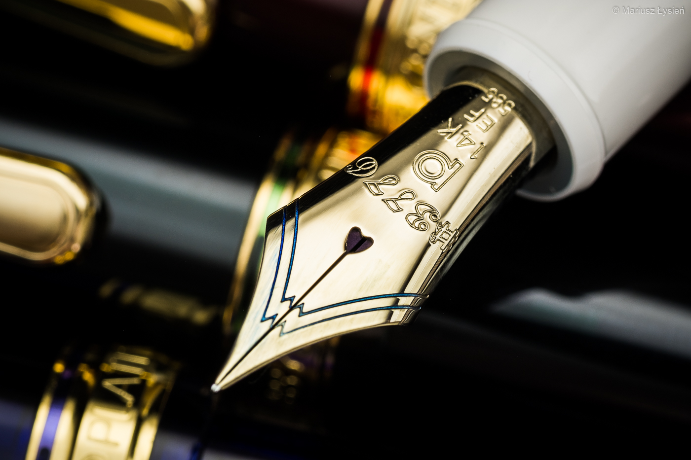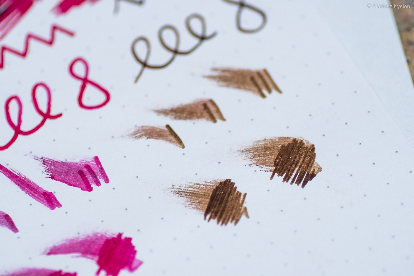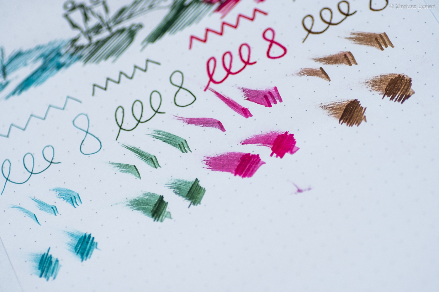 Wszystkie opisywane stalówki wykonano z 14 karatowego złota próby 585. Są one sztywne i wraz ze zmianą siły nacisku raczej nie uda nam się specjalnie zwiększyć szerokości linii. W tym przypadku sztywność nie jest wadą a jedynie cechą charakterystyki pracy tego elementu. Wspominam o tym, bo wszystkie szerokości pisały bardzo dobrze. Stalówki oferujące bardziej precyzyjną kreskę (EF czy M) wydają charakterystyczny, aczkolwiek przyjemny dla ucha szelest. Końcówki mokrzejsze (C czy Music) suną po powierzchni papieru gładziej, ale w ich przypadku ma na to wpływ znacznie większe ziarno jak i ilość cieczy jaką za sobą pozostawiają.