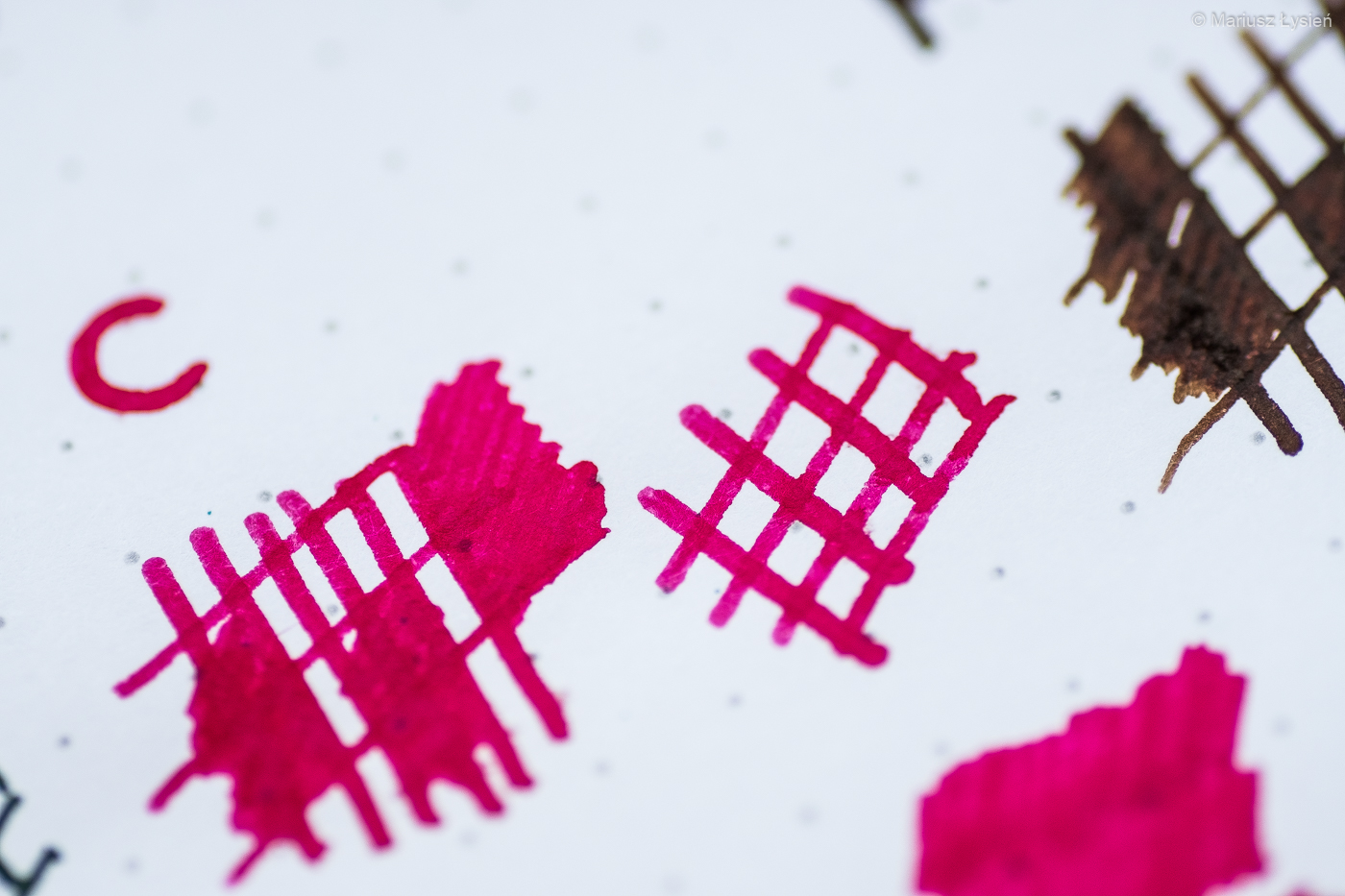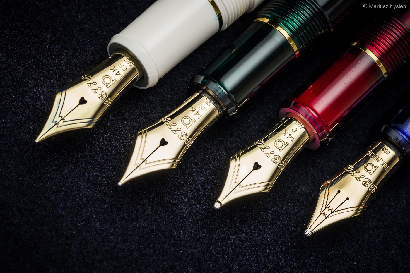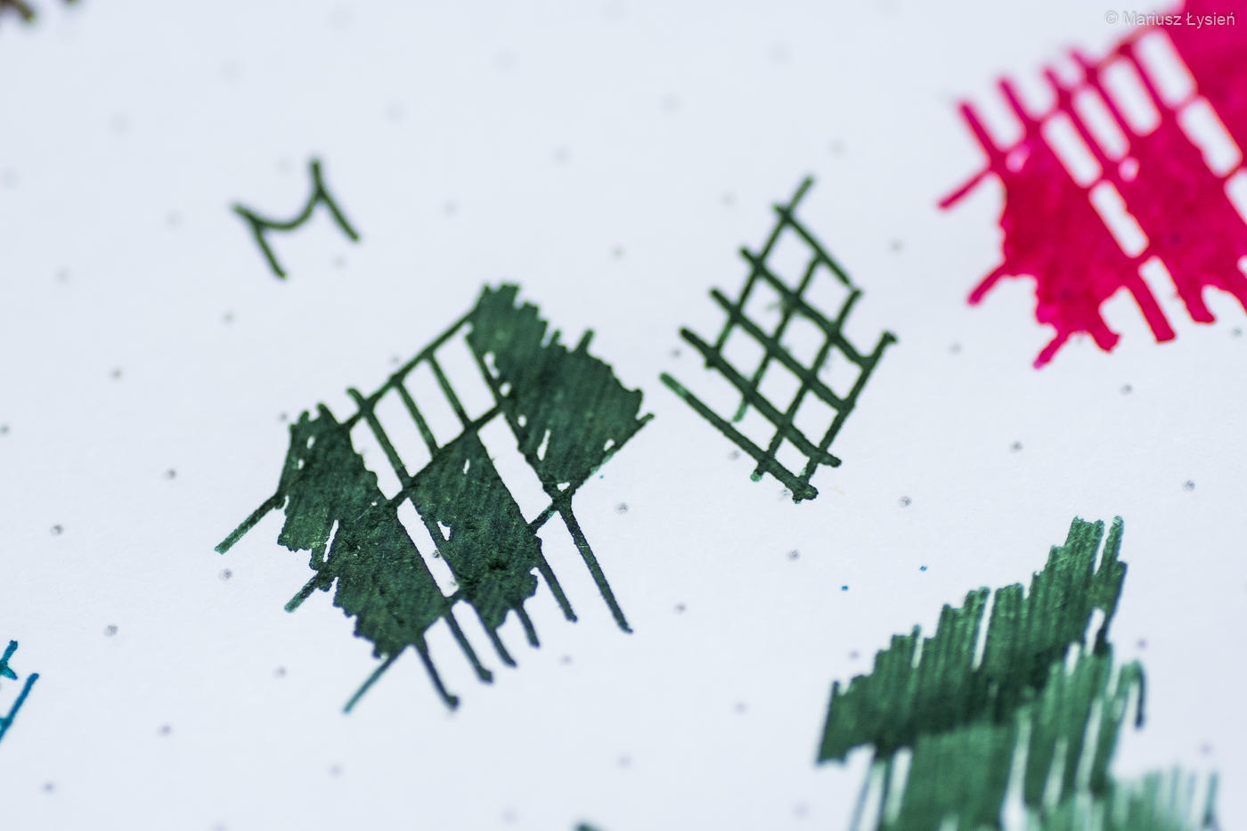 Wszystkie opisywane stalówki wykonano z 14 karatowego złota próby 585. Są one sztywne i wraz ze zmianą siły nacisku raczej nie uda nam się specjalnie zwiększyć szerokości linii. W tym przypadku sztywność nie jest wadą a jedynie cechą charakterystyki pracy tego elementu. Wspominam o tym, bo wszystkie szerokości pisały bardzo dobrze. Stalówki oferujące bardziej precyzyjną kreskę (EF czy M) wydają charakterystyczny, aczkolwiek przyjemny dla ucha szelest. Końcówki mokrzejsze (C czy Music) suną po powierzchni papieru gładziej, ale w ich przypadku ma na to wpływ znacznie większe ziarno jak i ilość cieczy jaką za sobą pozostawiają.