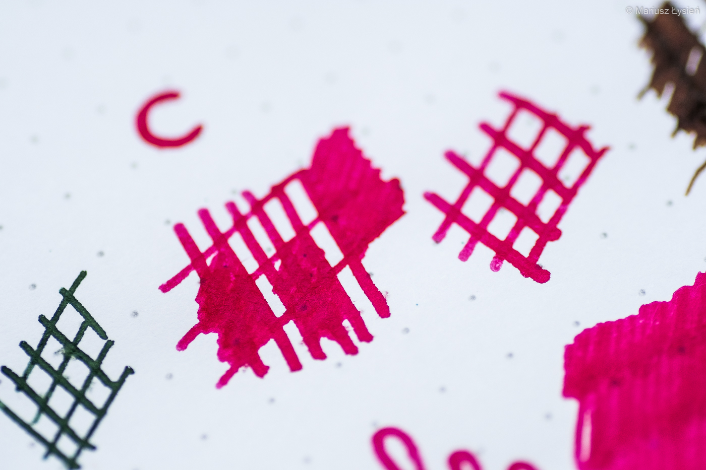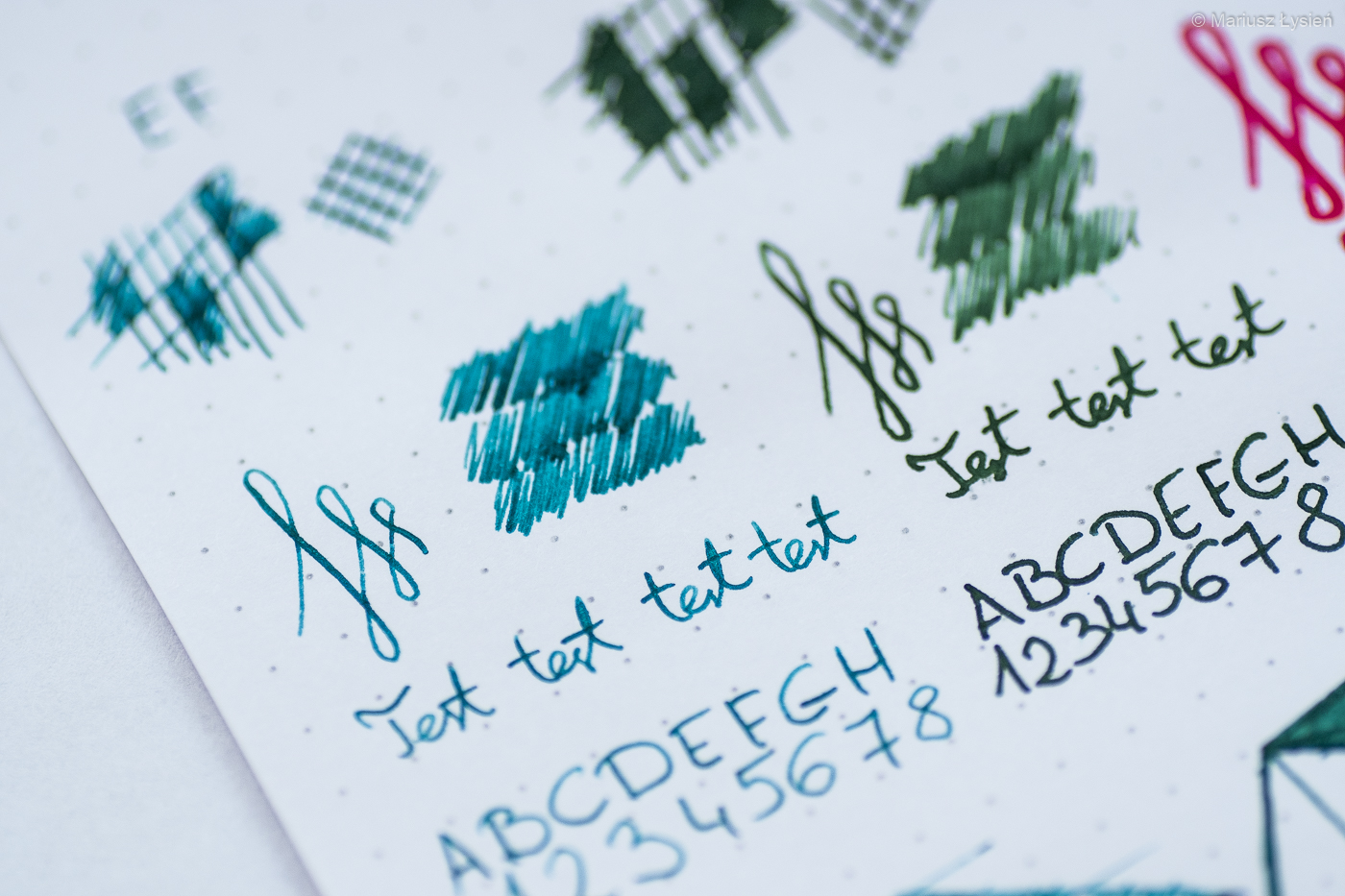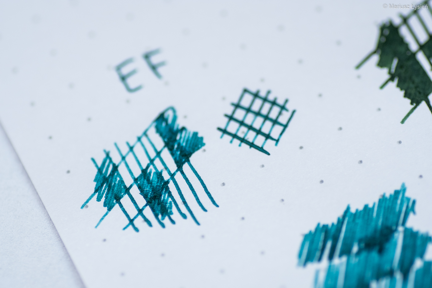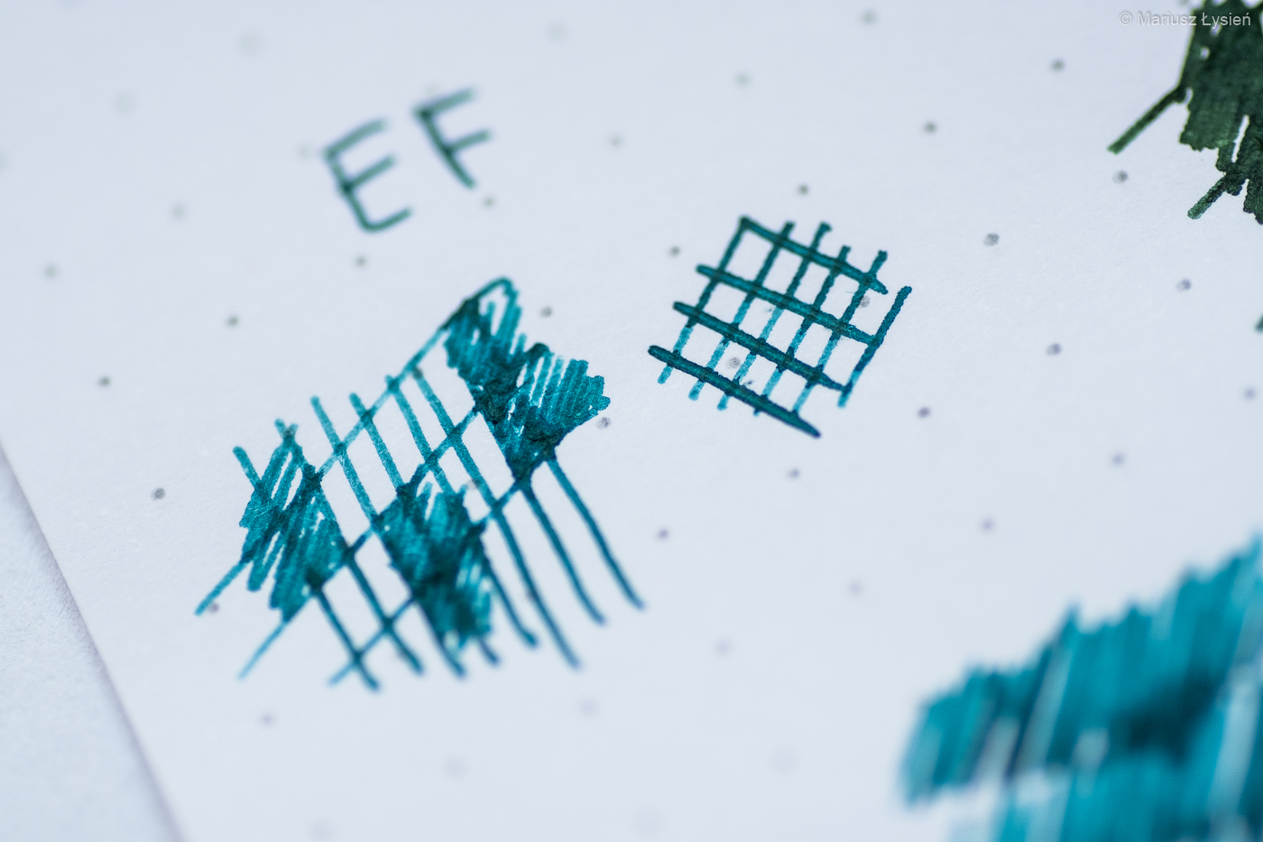 EF: oferuje bardzo wąską i niezwykle precyzyjną linię. Wydała mi się ona nieco „sucha”, aczkolwiek osobiście preferuję zdecydowanie szersze stalówki. Taka EF będzie idealna dla ludzi piszących z użyciem drobnych liter, czy też wypełniających formularze pełne niewielkich „okienek”. Precyzja EF przewyższy wtedy zdecydowanie jakikolwiek długopis, który otrzymamy w przysłowiowym „urzędzie”.