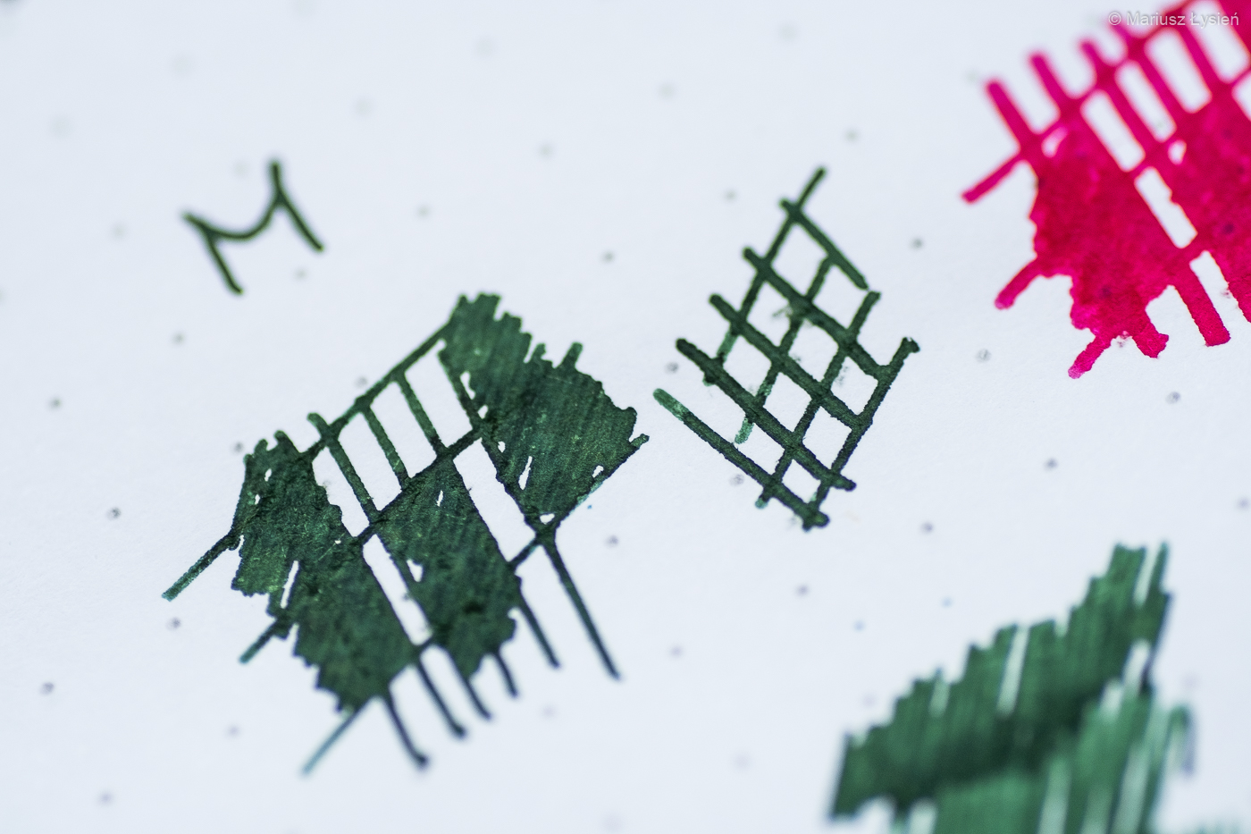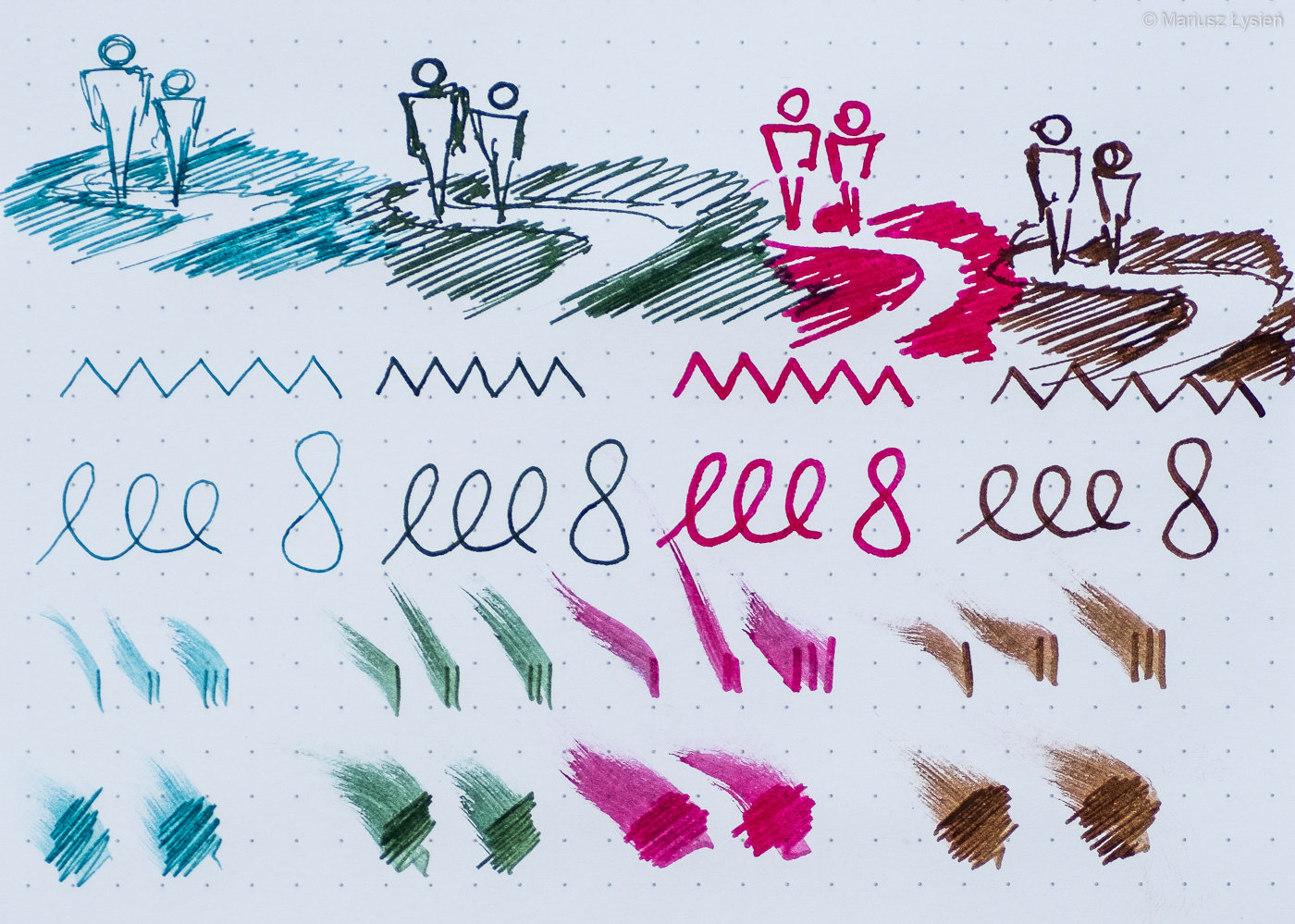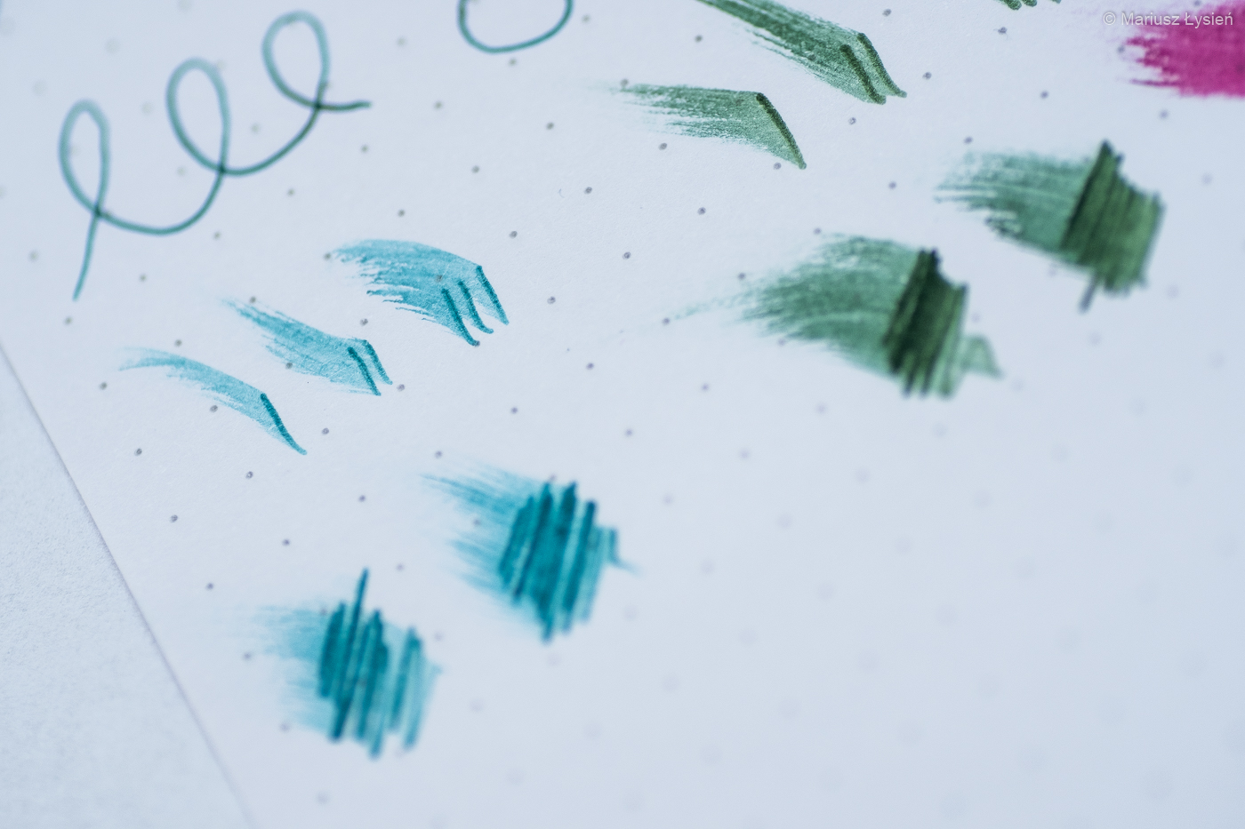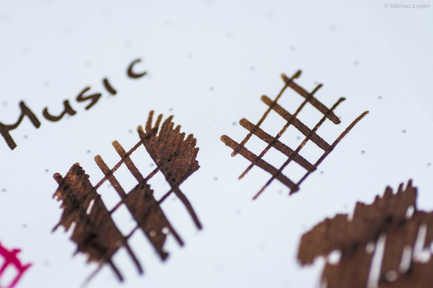 Music: pomimo, że jest bona bardziej odmienna z racji nazwy od np.: C, to jej codzienne użytkowanie jest w pełni możliwe. Można by ją określić jako coś spomiędzy stub a italic. Oferuje dobrą precyzję a jednocześnie nie jest tak wymagająca jak typowa stalówka italic. Dodatkowo posiada ona dwa nacięcia, które mają zapewniać wydajniejsze podawanie atramentu, które jest zresztą nienaganne. Szerokość linii zmienia się wraz z kierunkiem prowadzenia pióra. Z testowanej czwórki to właśnie na nią postawiłbym, gdybym miał wybrać jedną dla siebie.