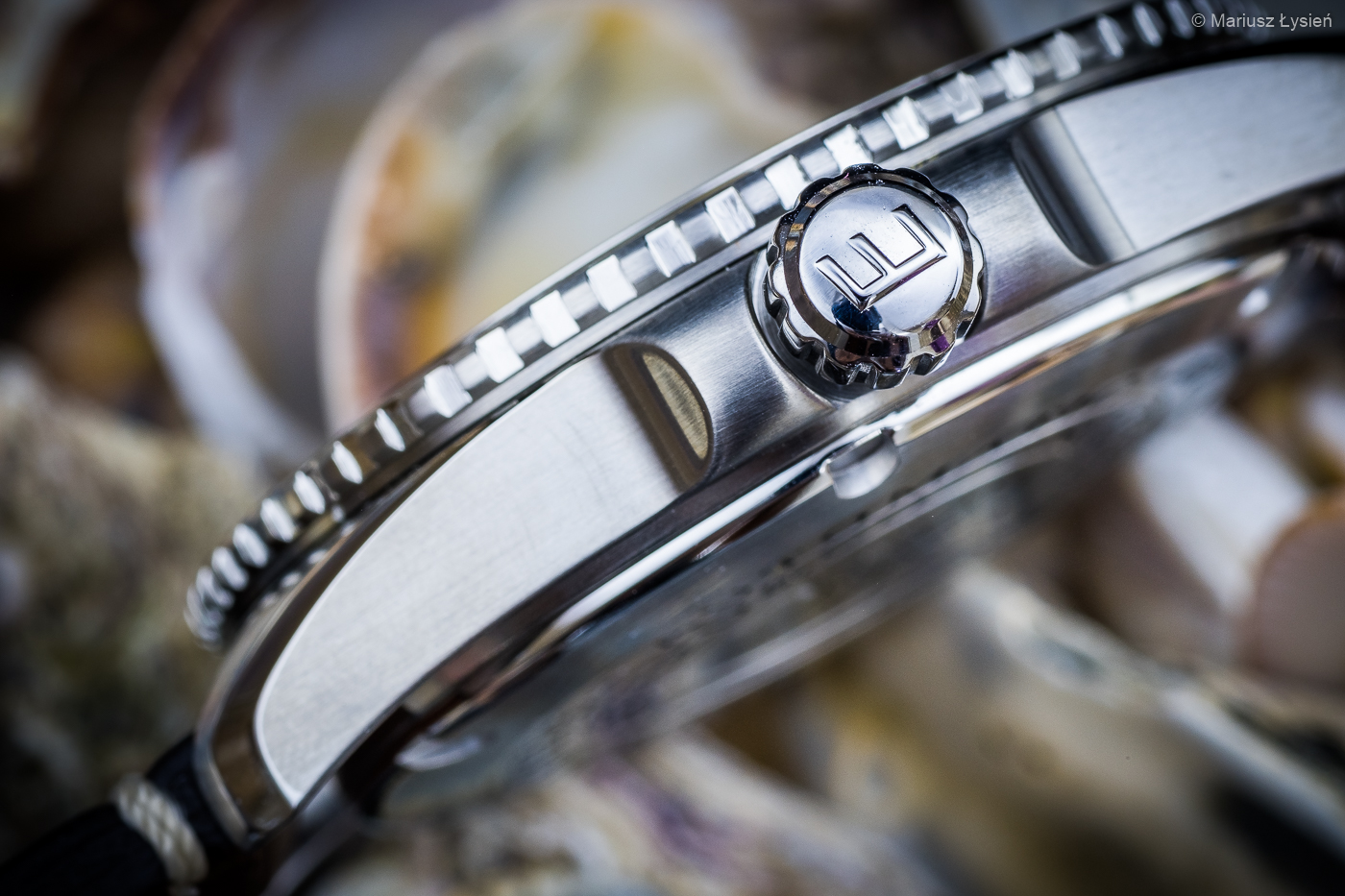 Oznaczenia na wykonanym z ceramiki pierścieniu lunety, jak i przeważająca część oznaczeń na tarczy, utrzymana została w kolorystyce ecru. Całości dopełniają nakładane ramki indeksów godzinowych oraz utrzymane w podobnej stylistyce wskazówki. Indeksy godzinowe są bardzo wydatne, dzięki czemu czytelność wskazań utrzymana jest na bardzo wysokim poziomie. Duża ilość materiału luminescencyjnego sprawia, że nawet w niesprzyjających warunkach oświetleniowych zegarek radzi sobie bardzo dobrze. Jednym słowem – tak jak powinno to mieć miejsce w przypadku profesjonalnego narzędzia, które nie może zawodzić nawet, gdy warunki nie są korzystne. Oczywiście także w codziennym użytkowaniu będzie to zaleta. W takich domowo-biurowych zastosowaniach przyda się zlokalizowany na godzinie 3 datownik ze wskazaniem aktualnego dnia miesiąca. Szkoda jedynie, że tarcza datownika nie jest utrzymana „w negatywie”. Czarne tło mniej odróżniałoby się od reszty cyferblatu, co w tym przypadku nieco osłabiałoby czytelność datownika, jednak mniej zaburzałoby nieco epokowy klimat całego projektu. Mimo to całość wygląda bardzo atrakcyjnie.