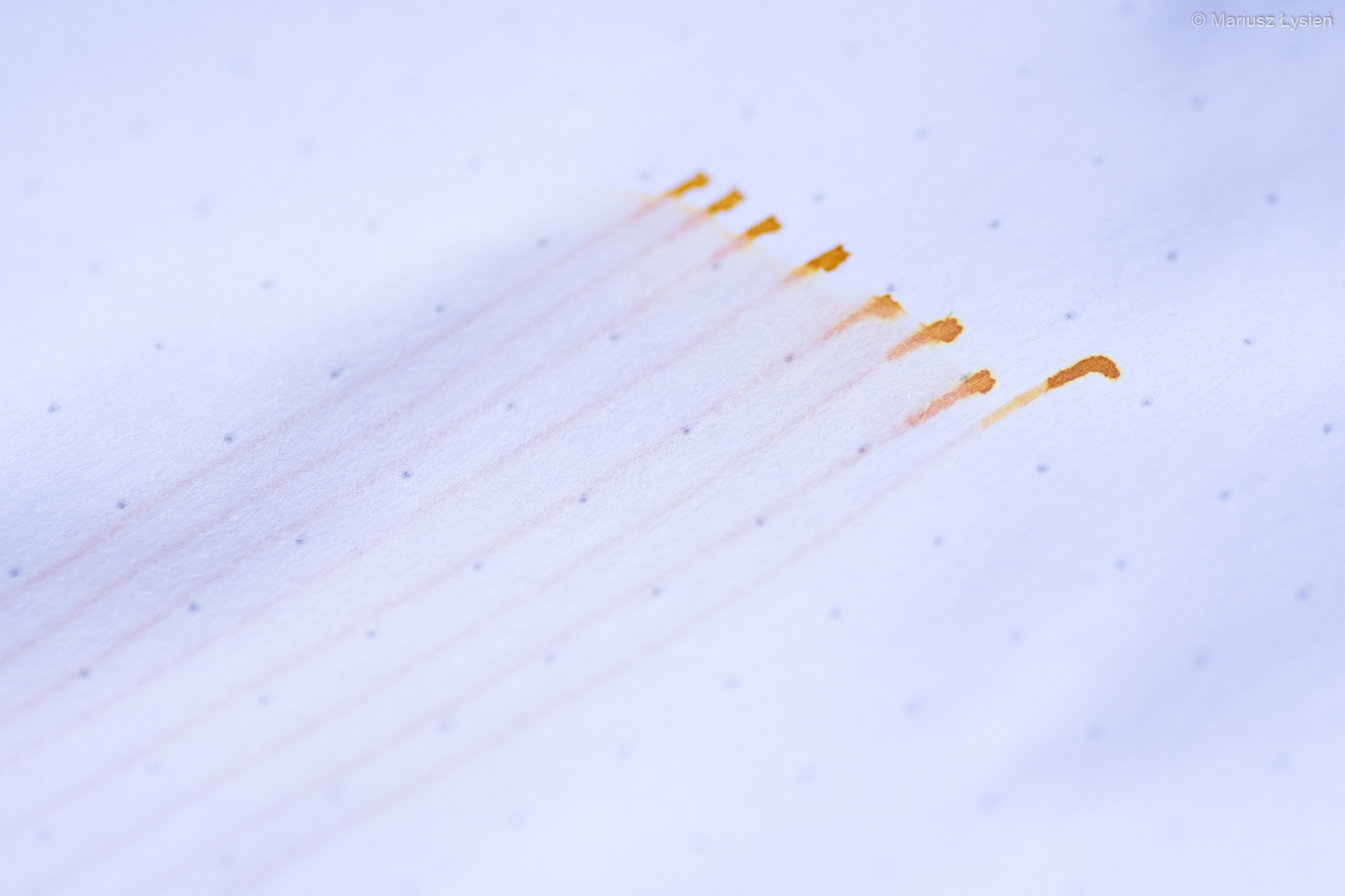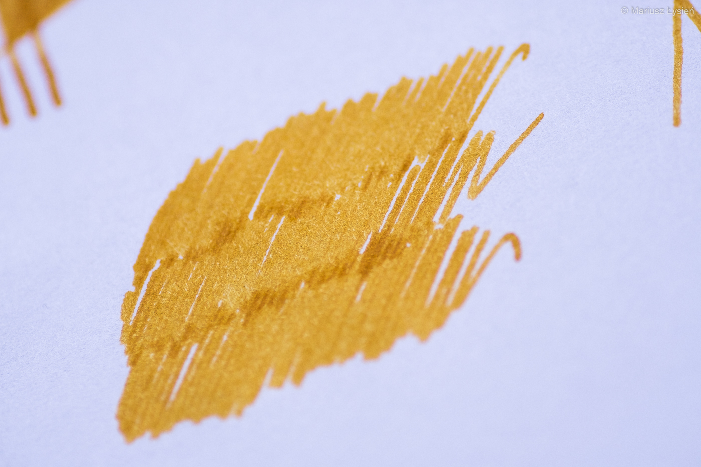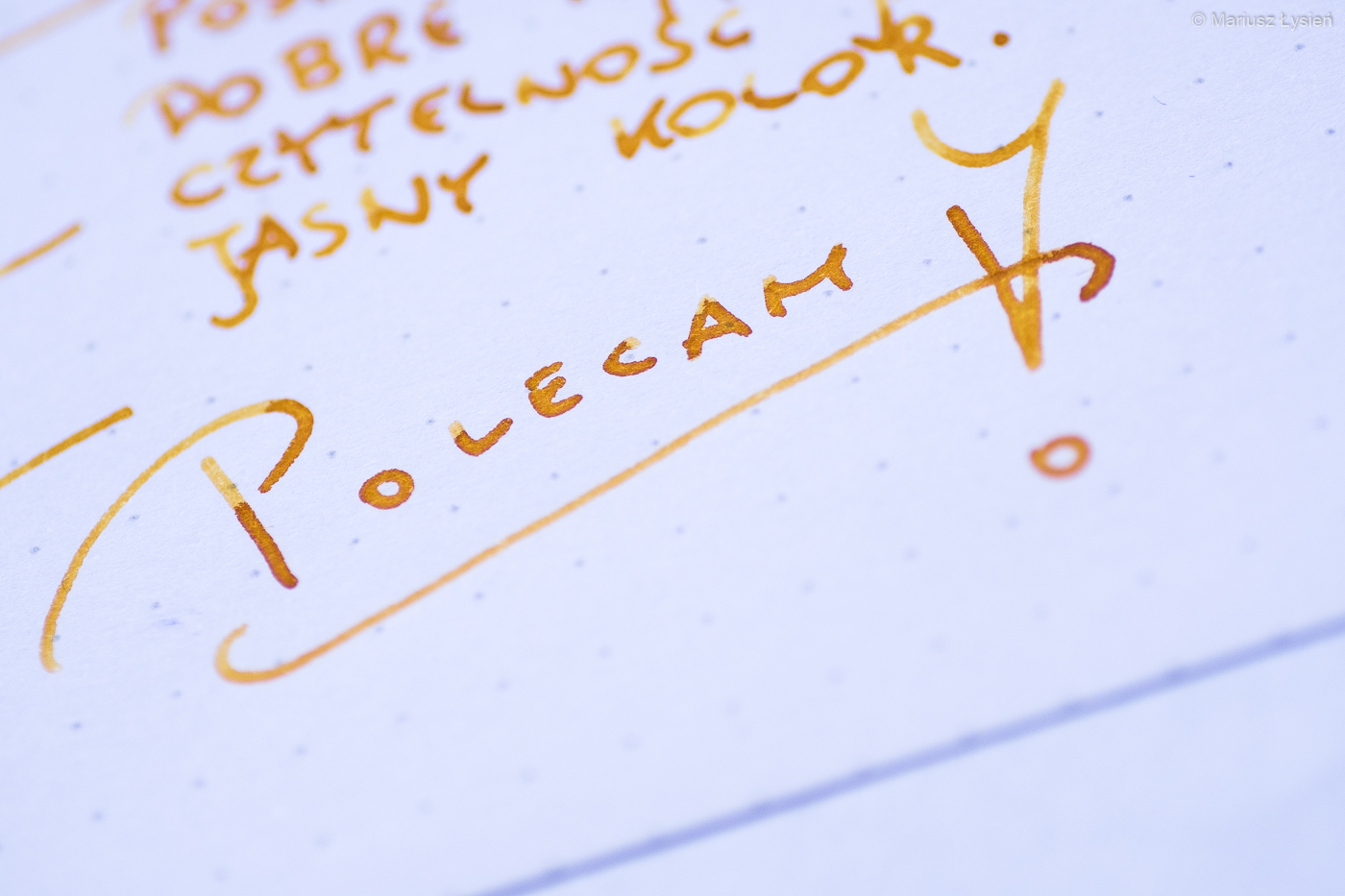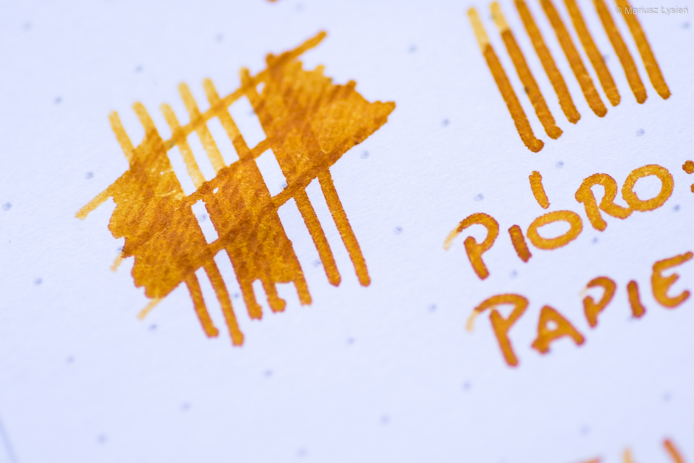 Barwa faktycznie jest pomarańczowo-brązowa. W cieńszych stalówkach kolor przełamuje się w stronę ciemnożółtego z domieszką pomarańczy. Kolor prezentuje się na papierze ciekawie. Nasycenie jest bardzo dobre.