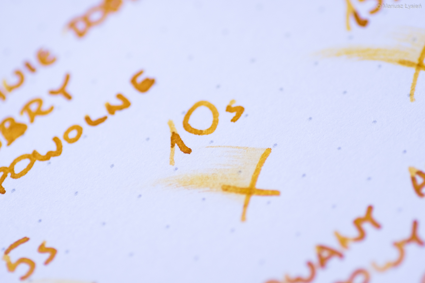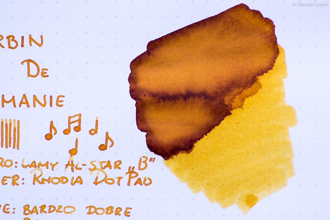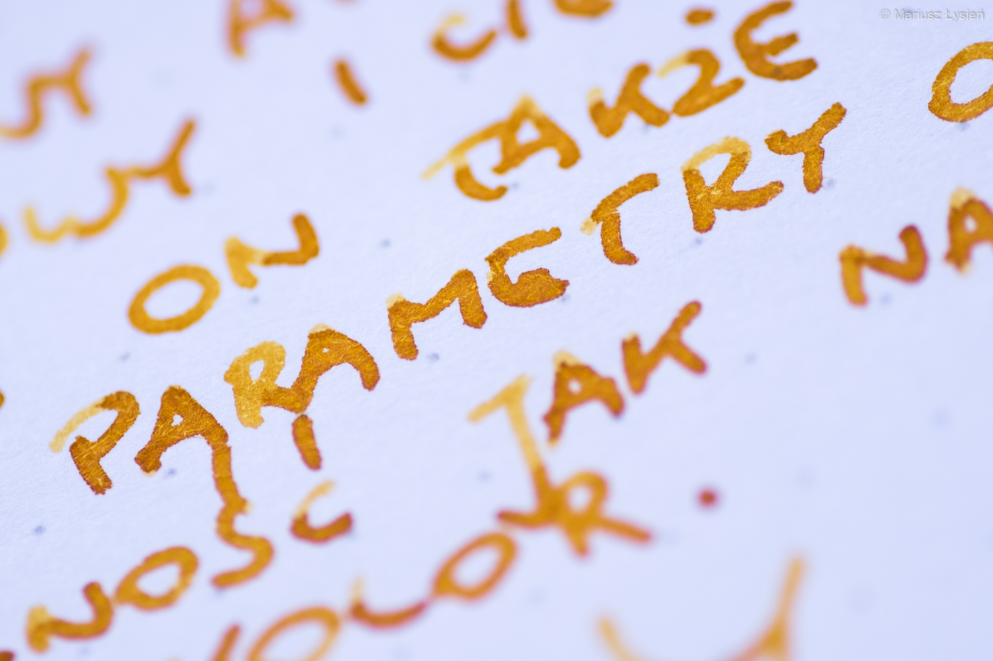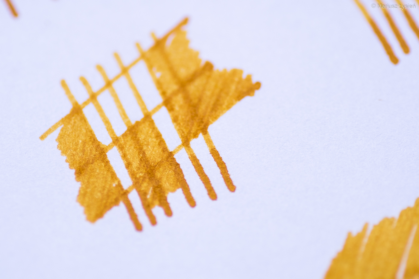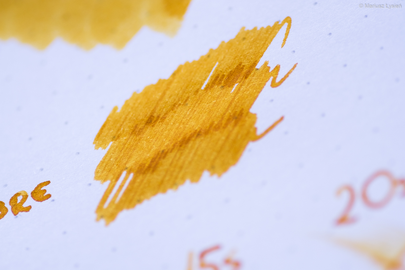 Barwa faktycznie jest pomarańczowo-brązowa. W cieńszych stalówkach kolor przełamuje się w stronę ciemnożółtego z domieszką pomarańczy. Kolor prezentuje się na papierze ciekawie. Nasycenie jest bardzo dobre.