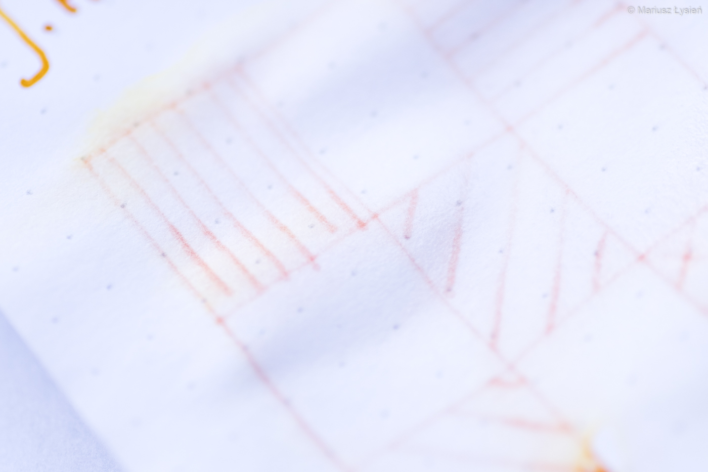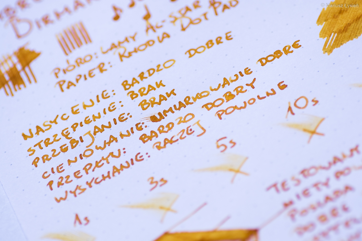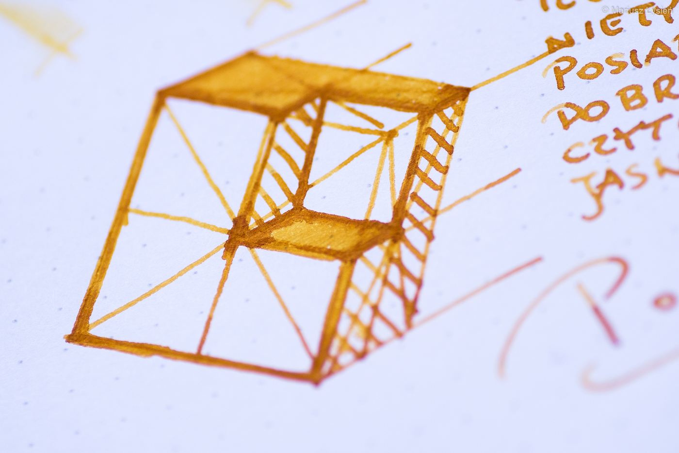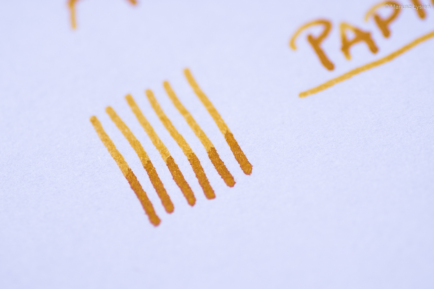 Barwa faktycznie jest pomarańczowo-brązowa. W cieńszych stalówkach kolor przełamuje się w stronę ciemnożółtego z domieszką pomarańczy. Kolor prezentuje się na papierze ciekawie. Nasycenie jest bardzo dobre.