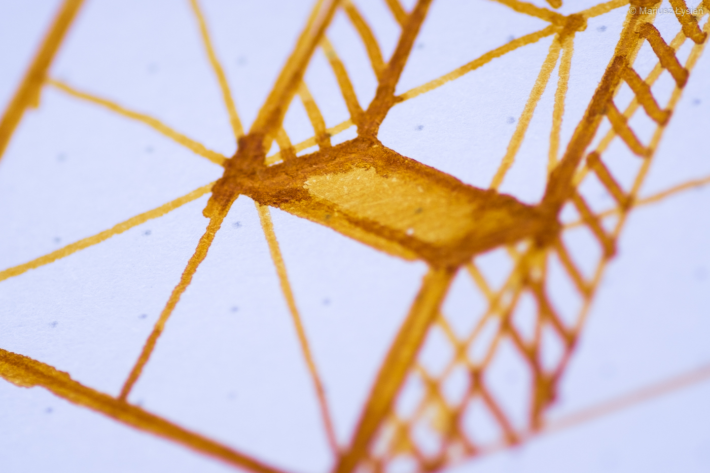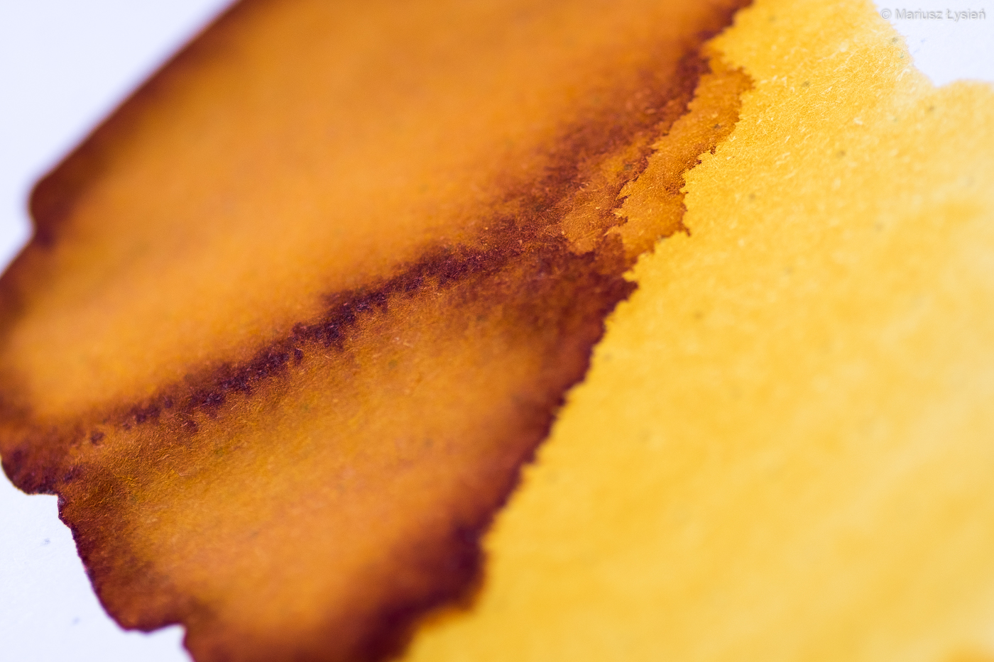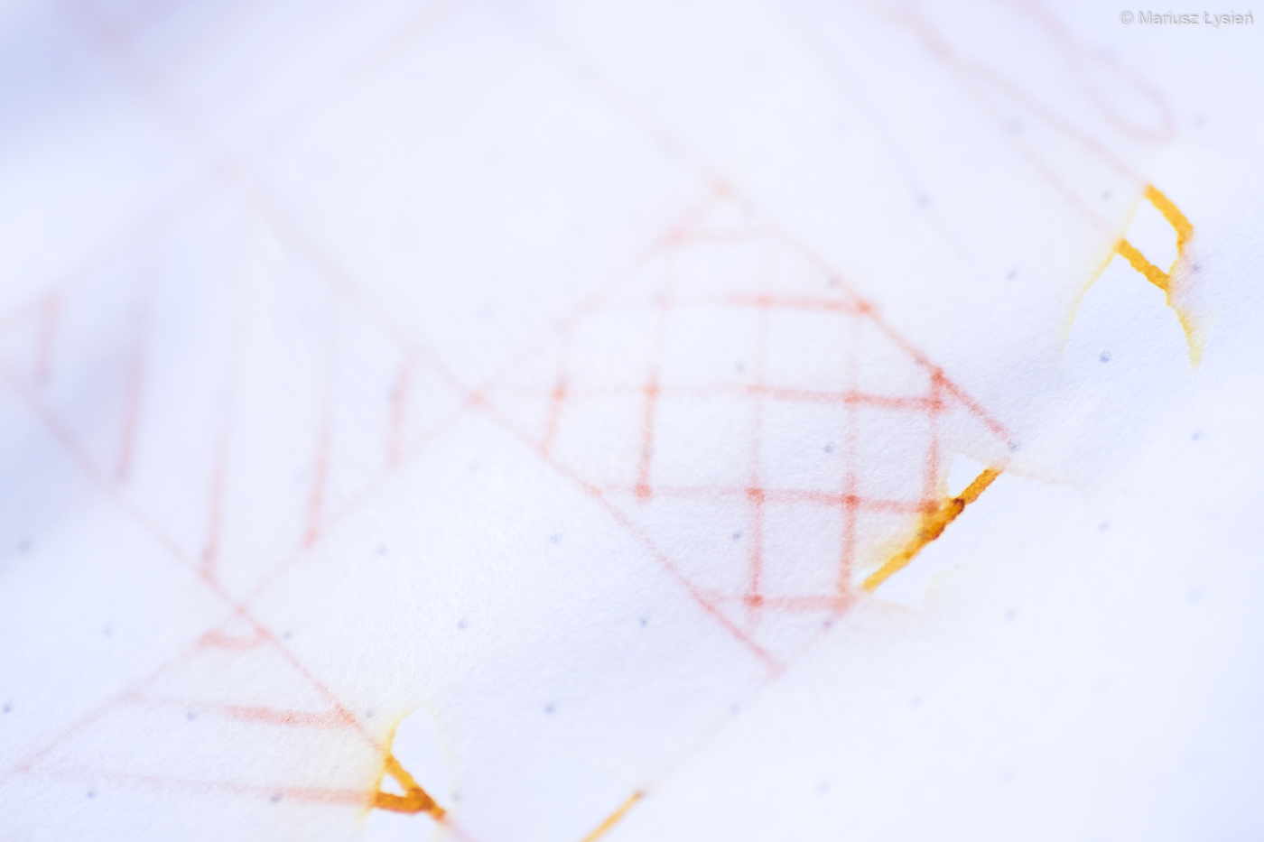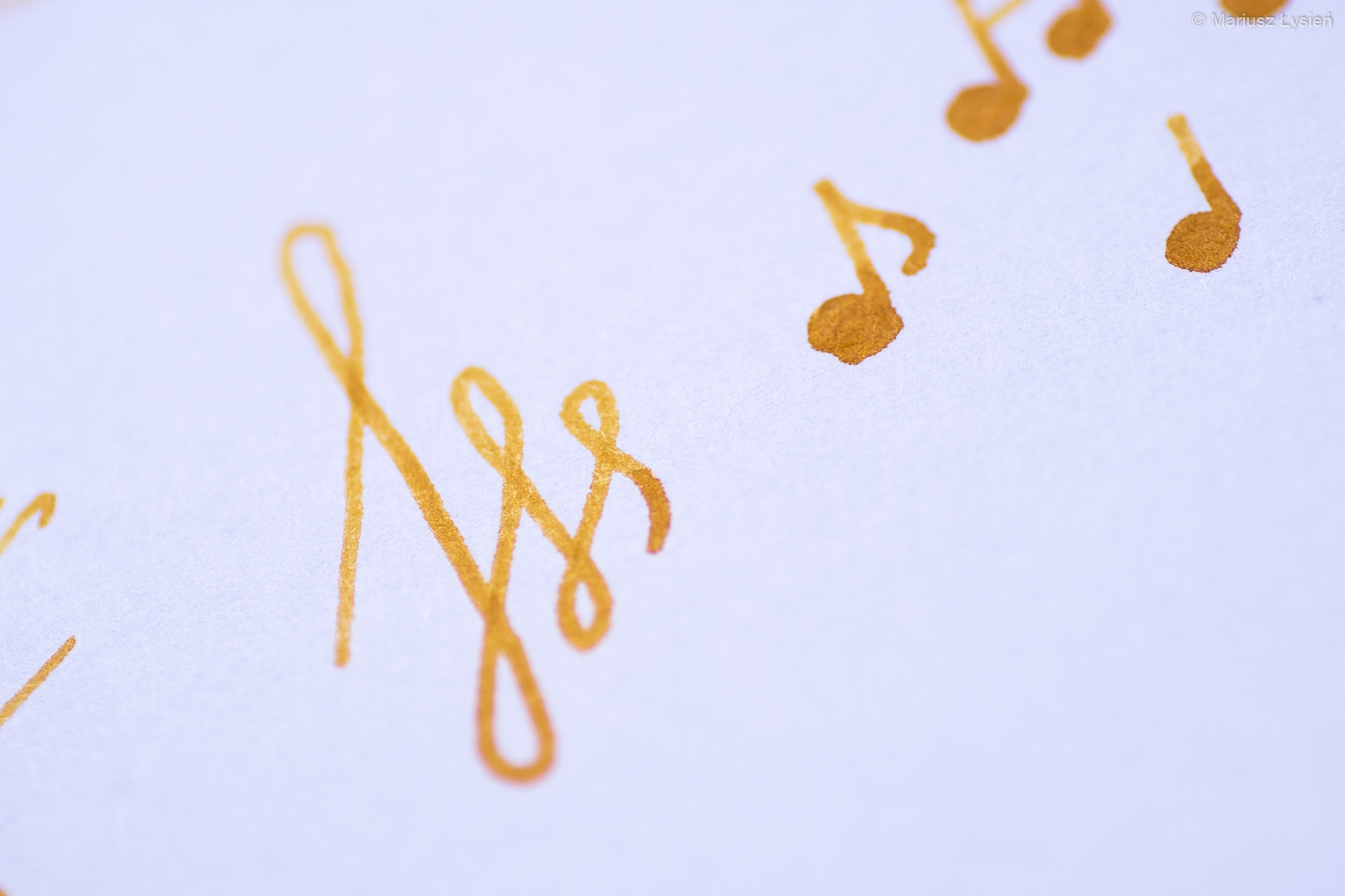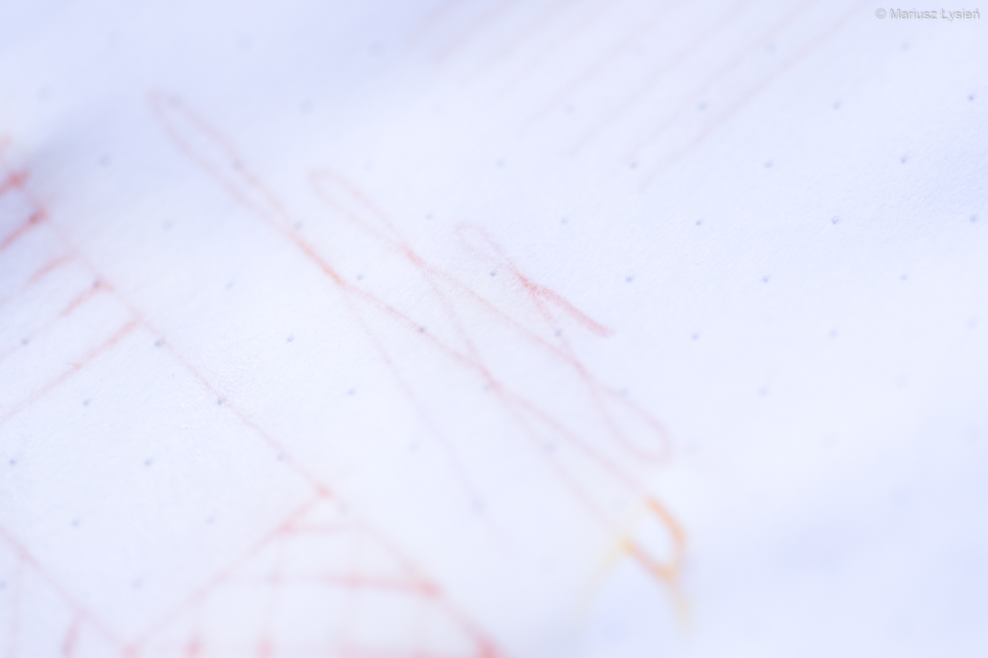 Barwa faktycznie jest pomarańczowo-brązowa. W cieńszych stalówkach kolor przełamuje się w stronę ciemnożółtego z domieszką pomarańczy. Kolor prezentuje się na papierze ciekawie. Nasycenie jest bardzo dobre.