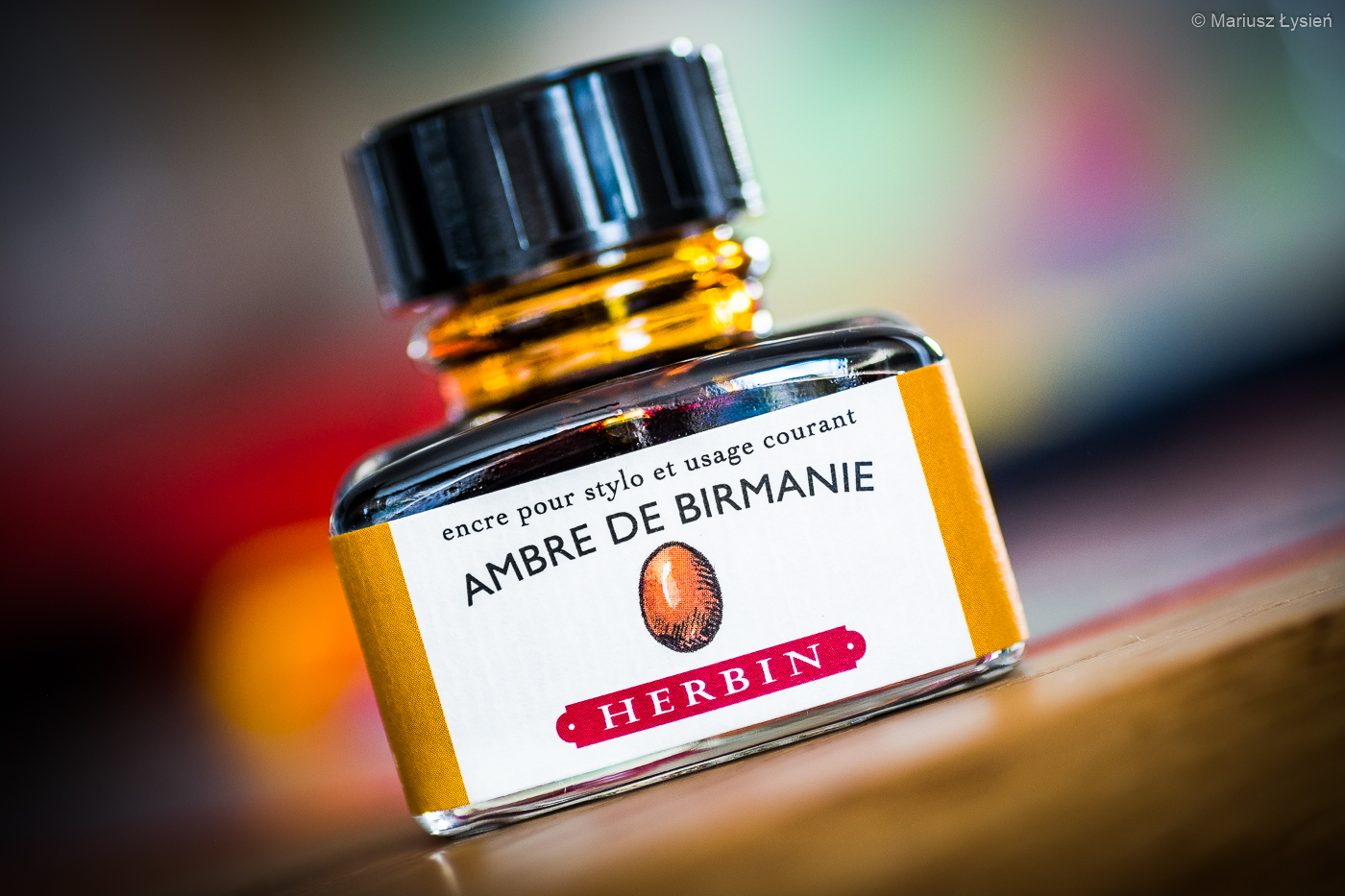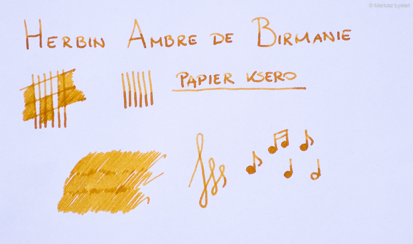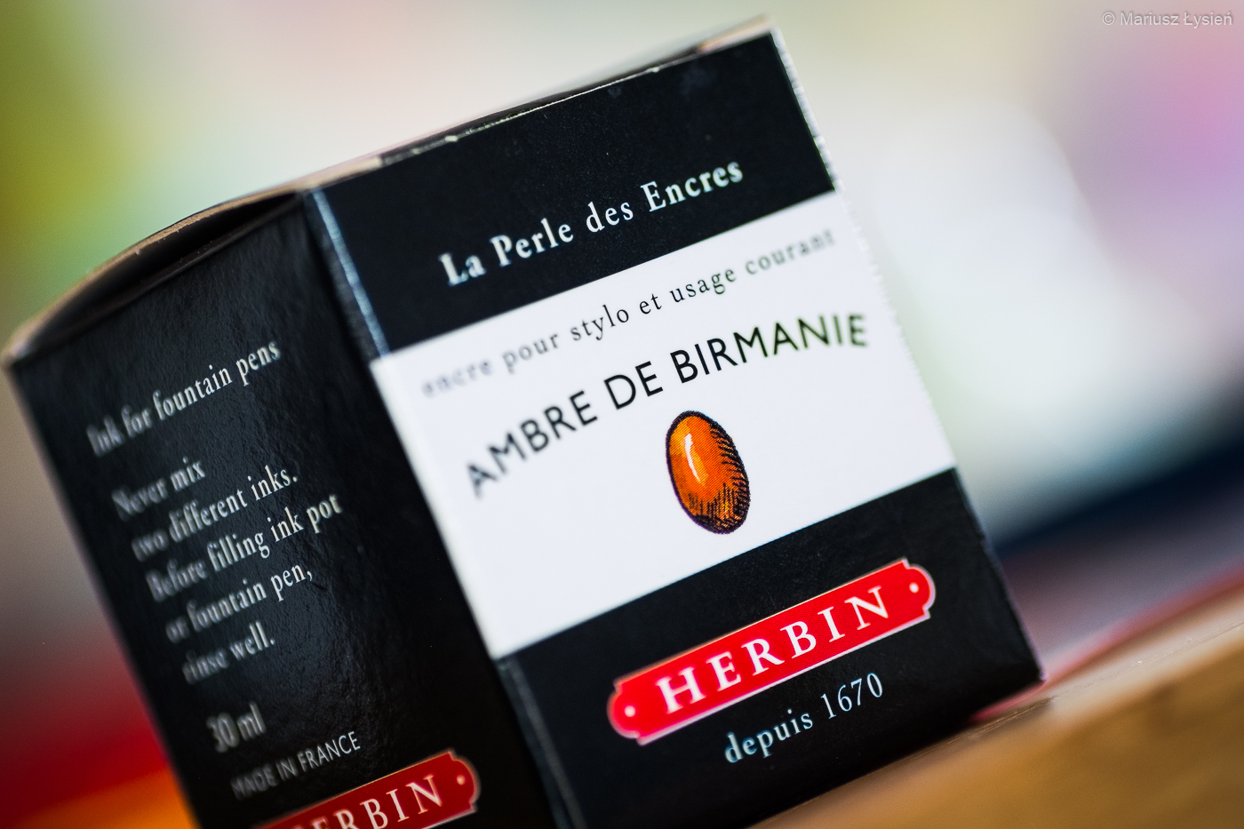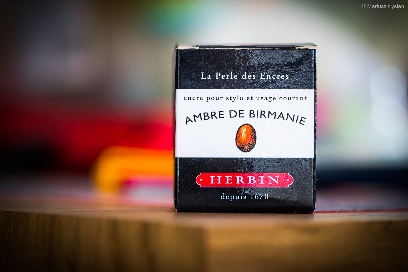 Tytułowy inkaust o nazwie – Ambre de Birmanie (w wolnym tłumaczeniu oznacza „birmański bursztyn”) sugeruje kolor pomarańczowo-brązowy. Jest to zresztą odcień będący już długo w ofercie firmy Herbin, co sugeruje, że jest on często wybierany przez klientów.