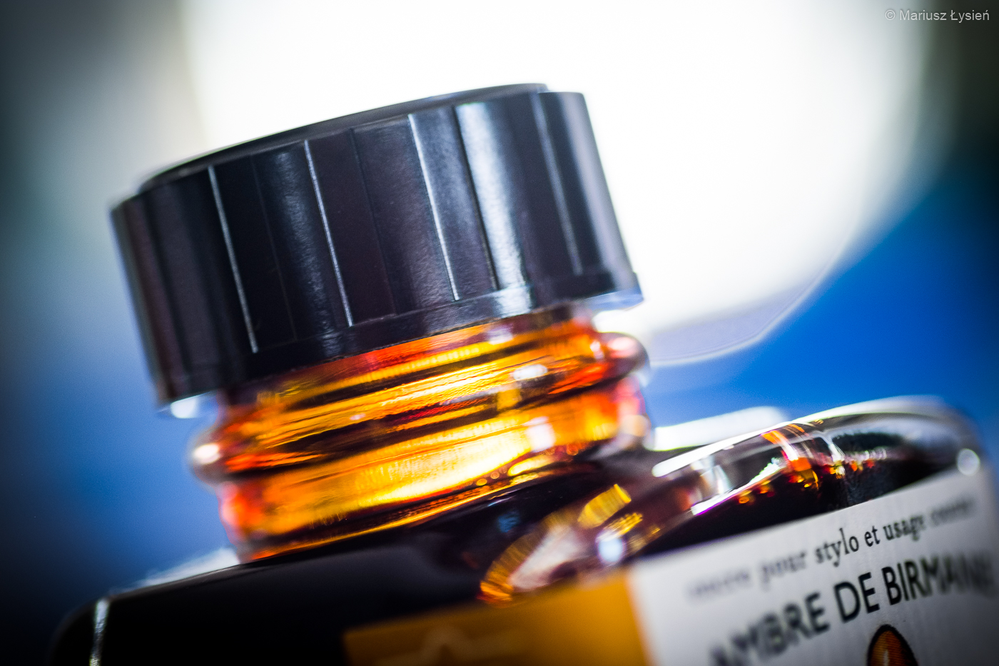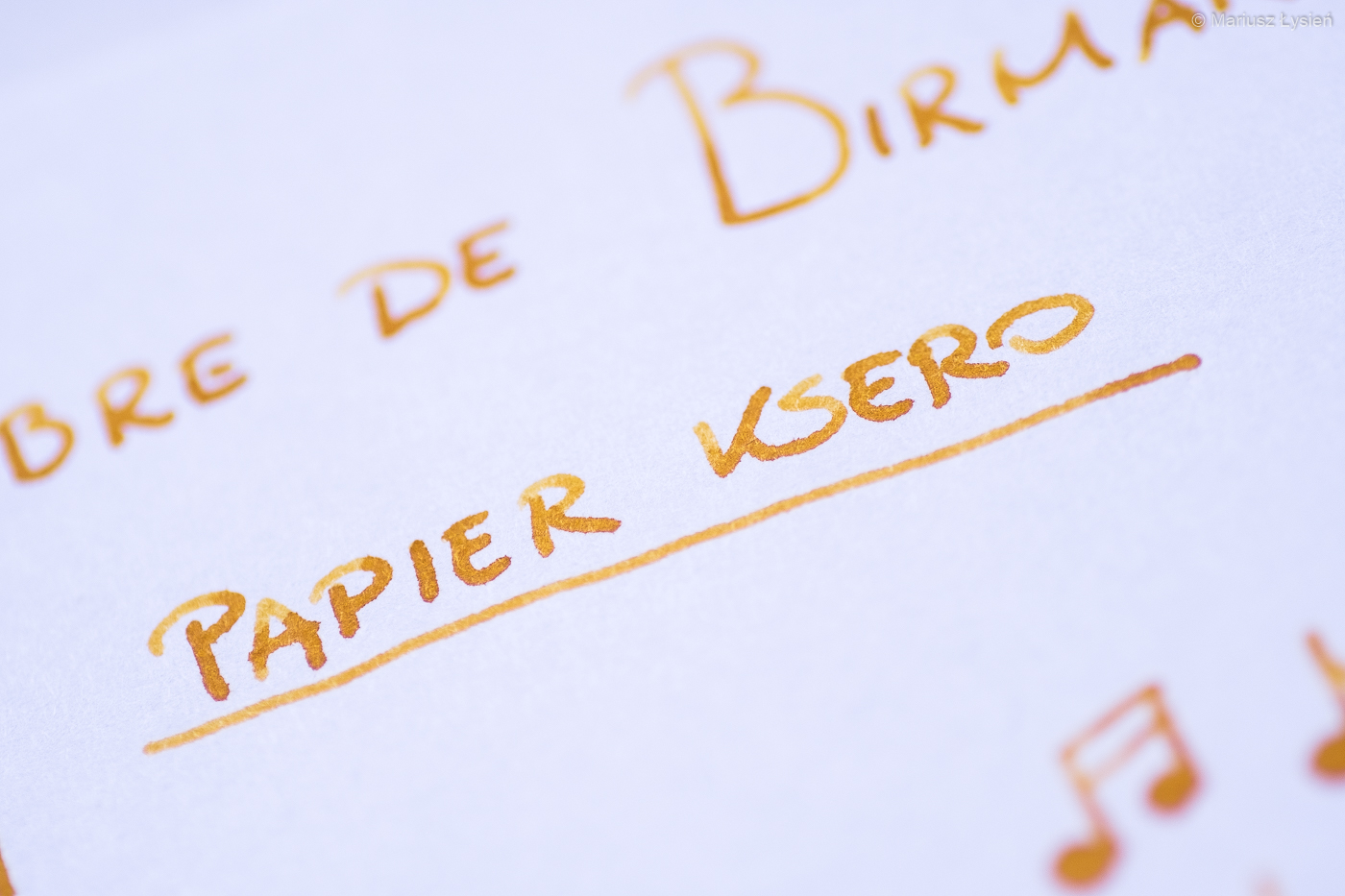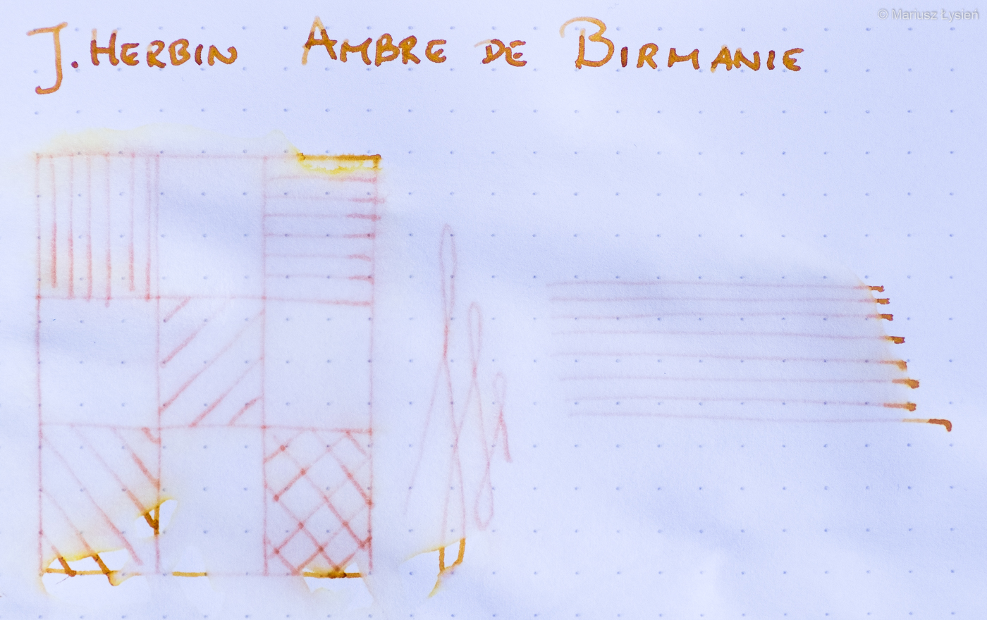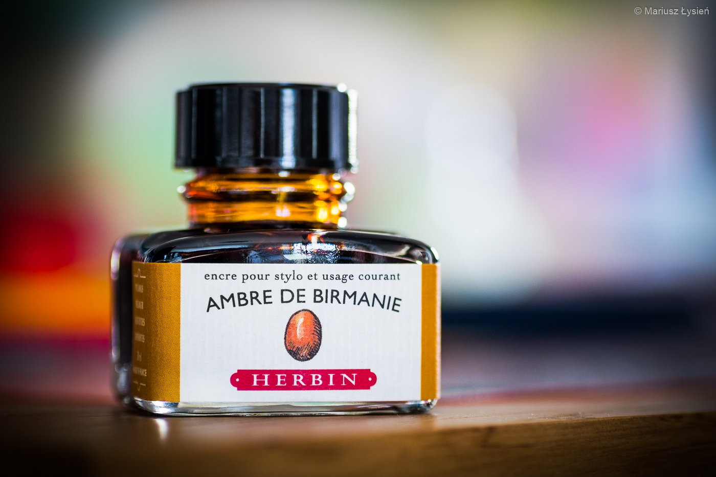 Tytułowy inkaust o nazwie – Ambre de Birmanie (w wolnym tłumaczeniu oznacza „birmański bursztyn”) sugeruje kolor pomarańczowo-brązowy. Jest to zresztą odcień będący już długo w ofercie firmy Herbin, co sugeruje, że jest on często wybierany przez klientów.