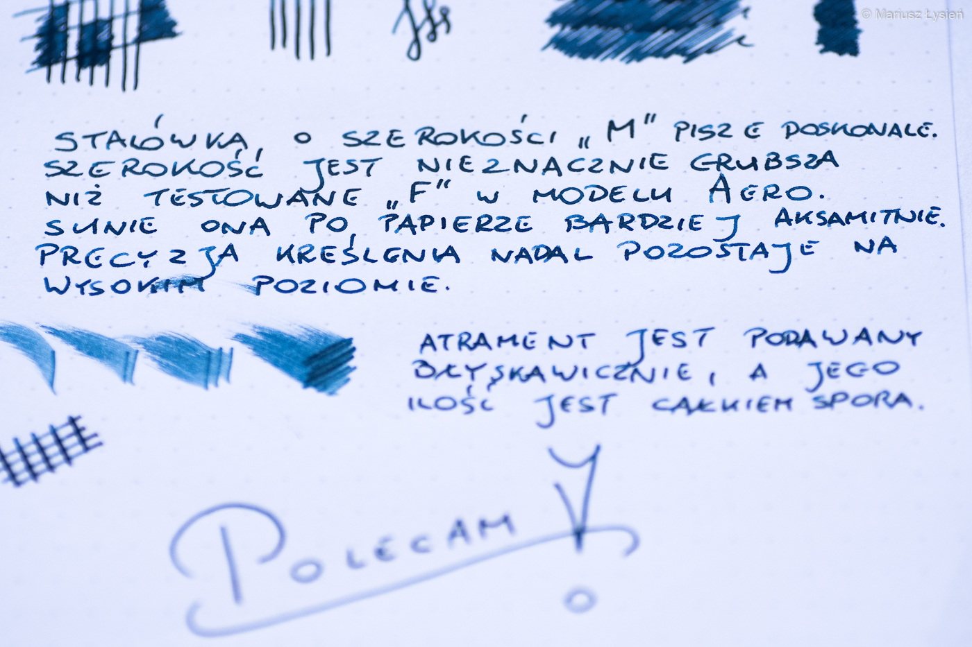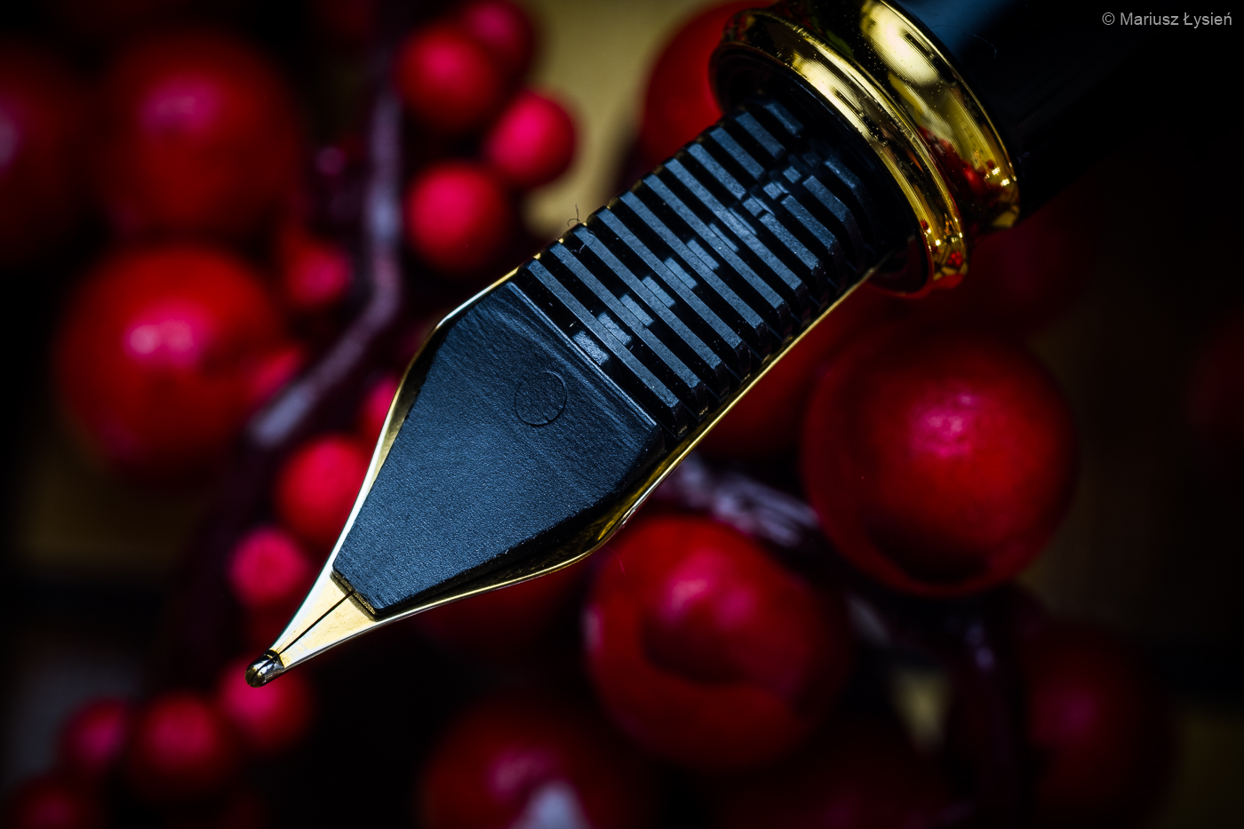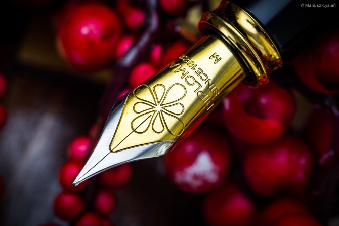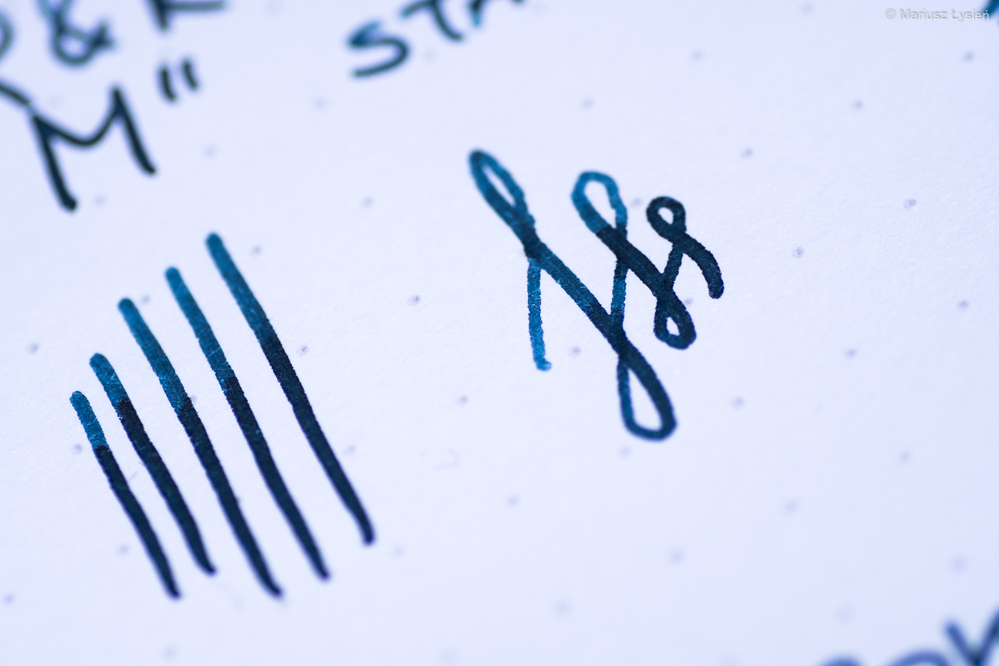 Dwukolorowa stalówka prezentuje się z pewnością atrakcyjnie. Została ona wykonana ze stali nierdzewnej. W testowanym egzemplarzu zamontowano szerokość „M”, która jest tylko nieznacznie szersza od testowanej niedawno „F” w modelu Aero. Wspomniane „M” sunie jednak znacznie gładziej po powierzchni papieru i przyznam, że pozytywnie zaskoczyła mnie praca tej stalówki. „Gładko” nie oznacza w tym przypadku „bez charakteru” – w każdym razie jest to z pewnością stalówka dla osób, które preferują nieco bardziej wypolerowane ziarno, które w tym przypadku idzie w parze z całkiem obfitym podawaniem cieczy na papier. Jest to po prostu świetna stalówka i trudno znaleźć choćby jedną rzecz, którą bym w niej poprawił.