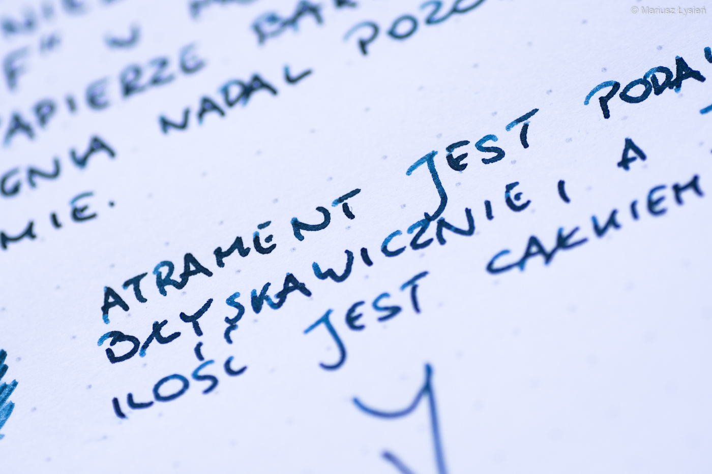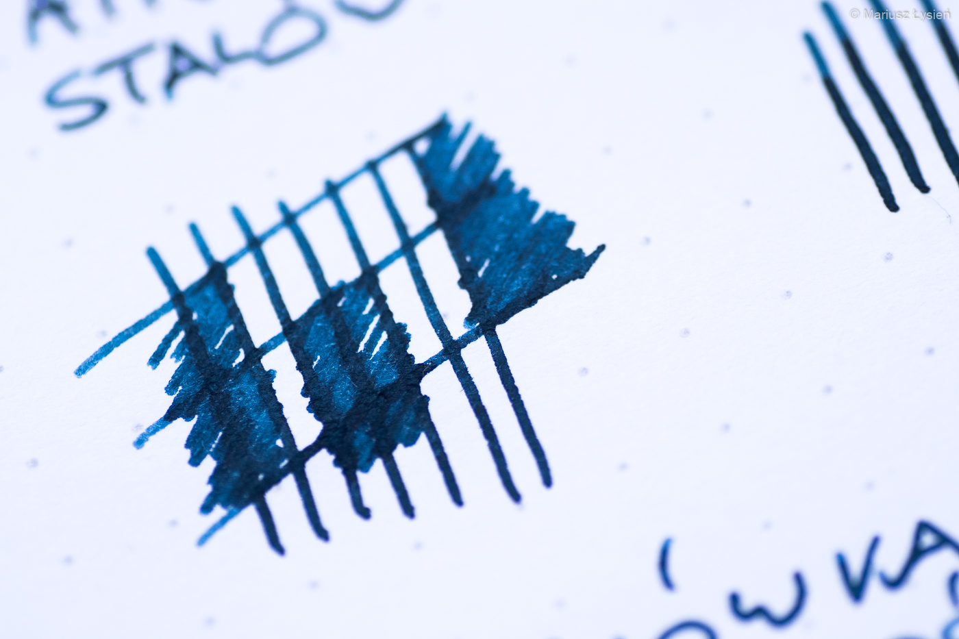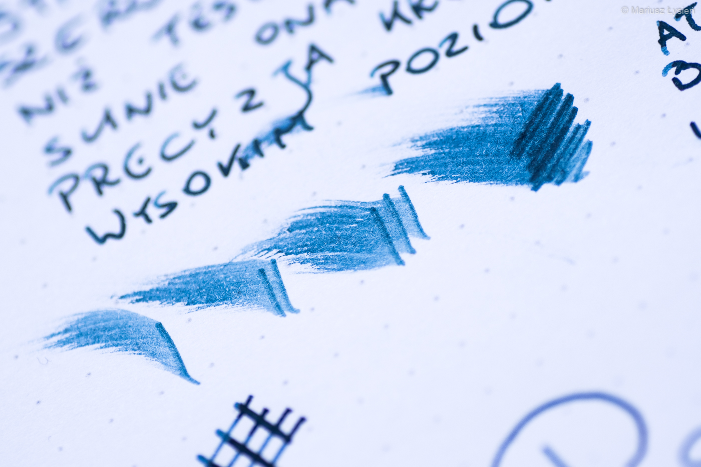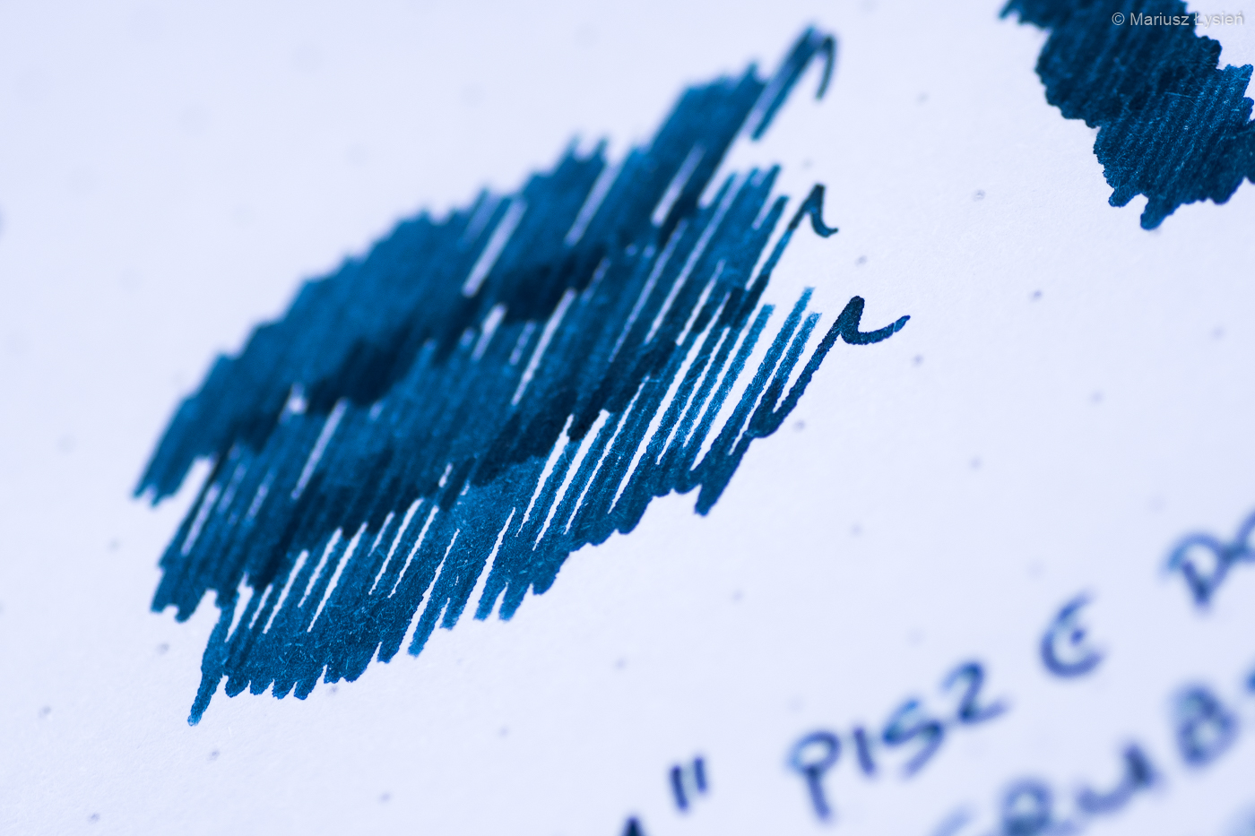 Dwukolorowa stalówka prezentuje się z pewnością atrakcyjnie. Została ona wykonana ze stali nierdzewnej. W testowanym egzemplarzu zamontowano szerokość „M”, która jest tylko nieznacznie szersza od testowanej niedawno „F” w modelu Aero. Wspomniane „M” sunie jednak znacznie gładziej po powierzchni papieru i przyznam, że pozytywnie zaskoczyła mnie praca tej stalówki. „Gładko” nie oznacza w tym przypadku „bez charakteru” – w każdym razie jest to z pewnością stalówka dla osób, które preferują nieco bardziej wypolerowane ziarno, które w tym przypadku idzie w parze z całkiem obfitym podawaniem cieczy na papier. Jest to po prostu świetna stalówka i trudno znaleźć choćby jedną rzecz, którą bym w niej poprawił.