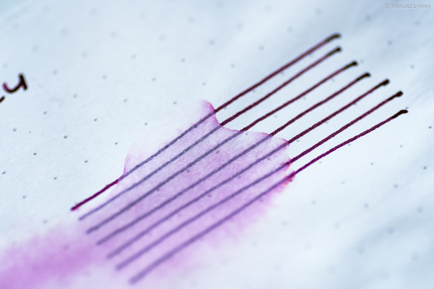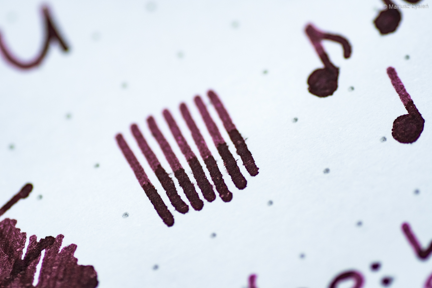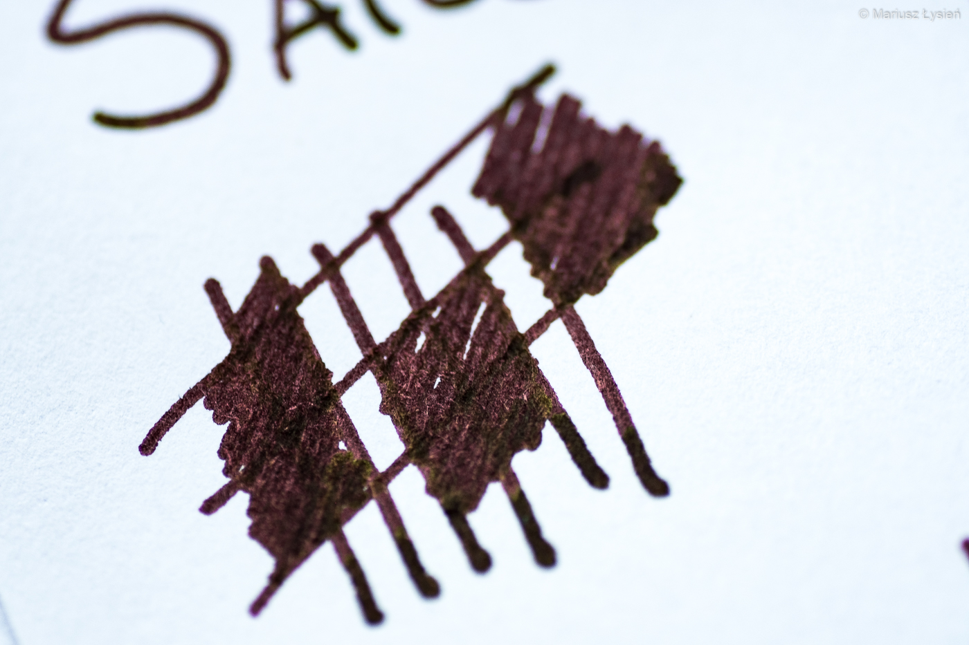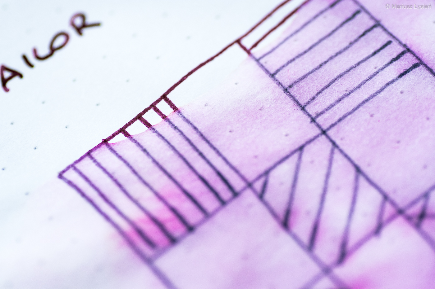 Cieniowanie jest bardzo dobre – nawet pomimo stosunkowo ciemnej kolorystyki jest ono wyraźnie widoczne. Przepływ jest doskonały – stalówka pióra napełnionego tym atramentem sunie po powierzchni papieru jak po aksamicie. Pod tym względem atrament należy do czołówki – niemniej Sailor przyzwyczaił nas już do tego, że przepływ w ich atramentach jest doskonały.