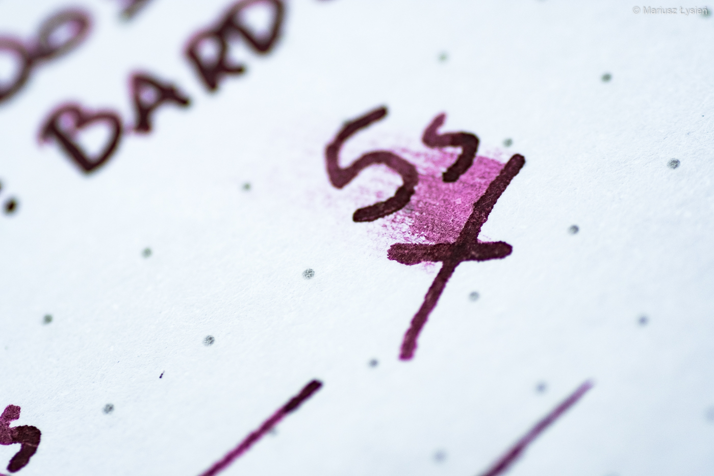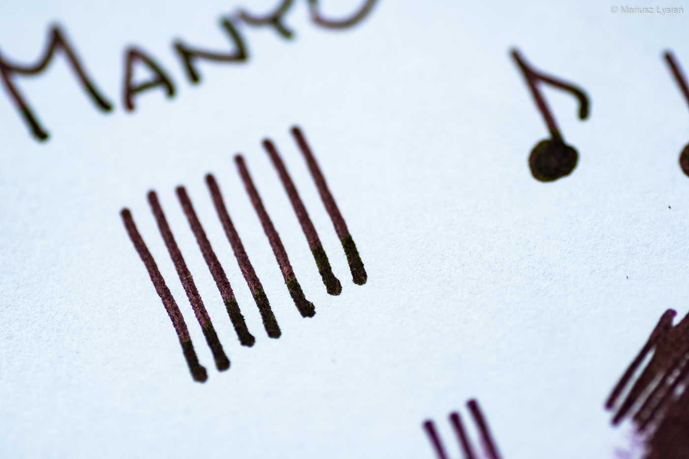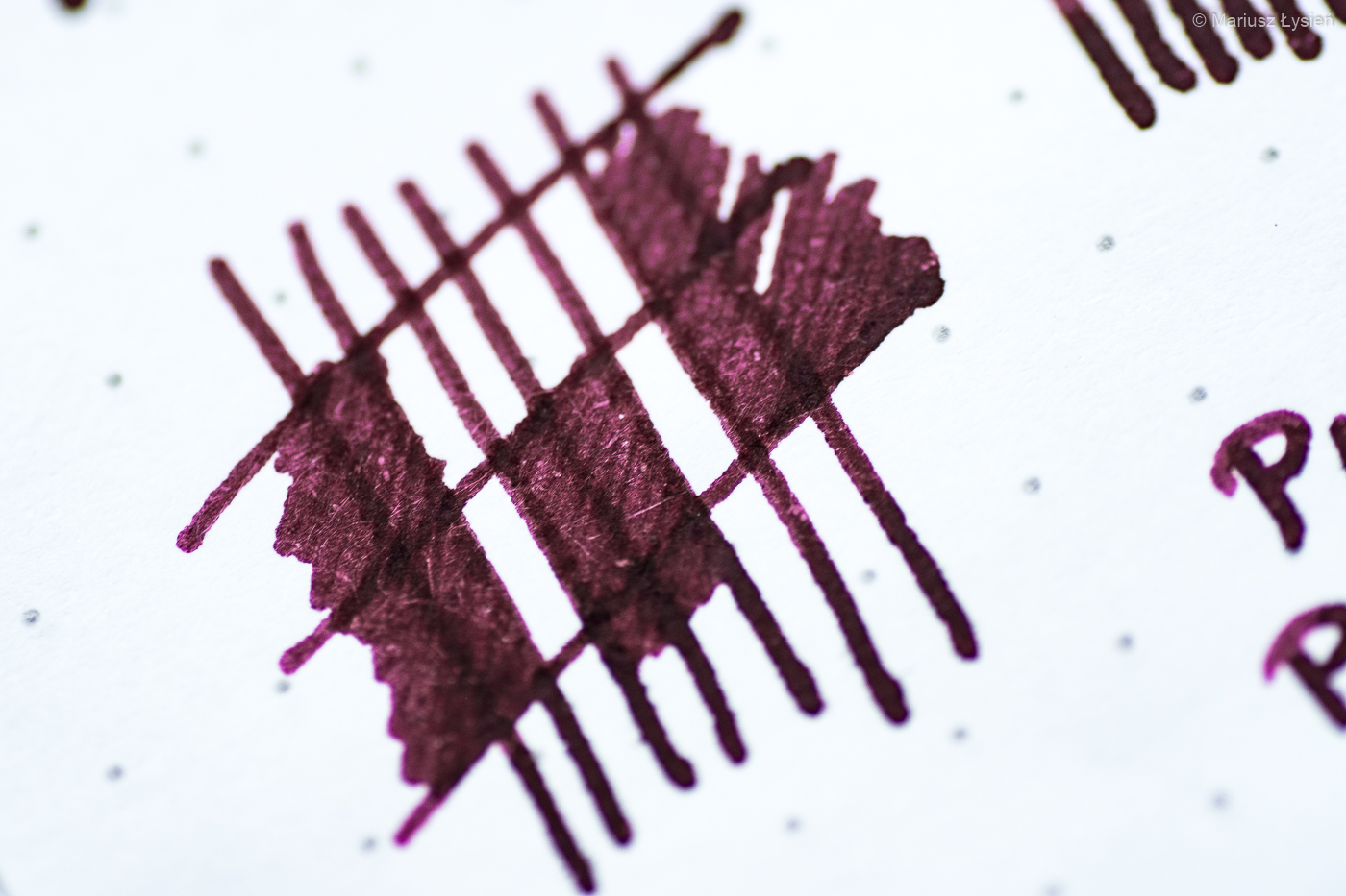 Cieniowanie jest bardzo dobre – nawet pomimo stosunkowo ciemnej kolorystyki jest ono wyraźnie widoczne. Przepływ jest doskonały – stalówka pióra napełnionego tym atramentem sunie po powierzchni papieru jak po aksamicie. Pod tym względem atrament należy do czołówki – niemniej Sailor przyzwyczaił nas już do tego, że przepływ w ich atramentach jest doskonały.