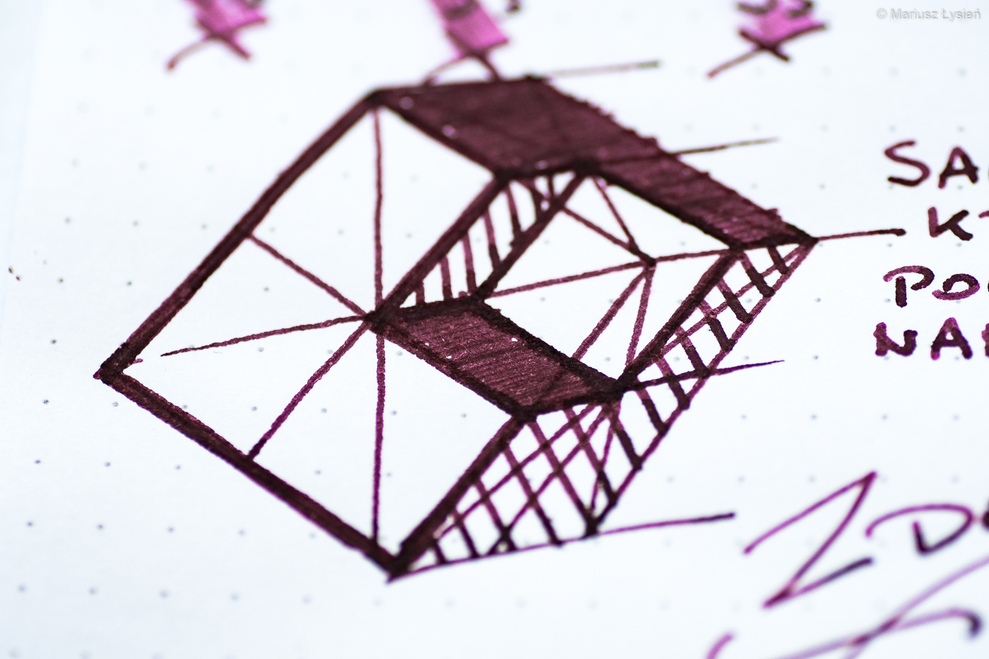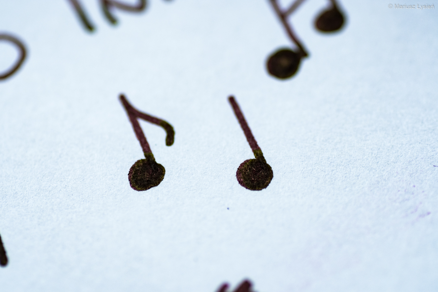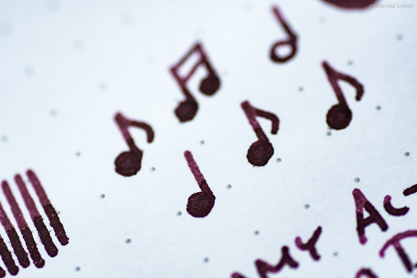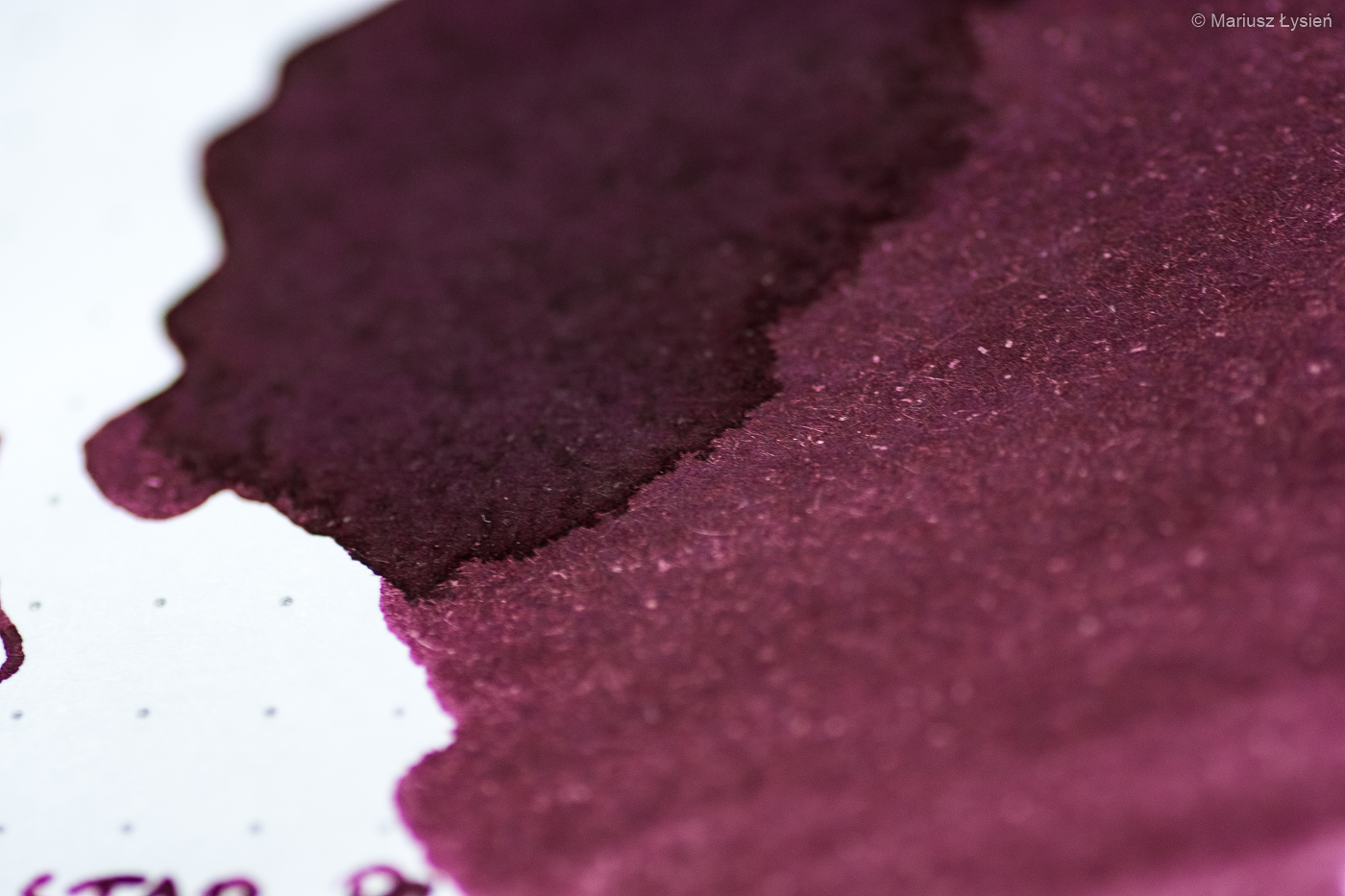 Cieniowanie jest bardzo dobre – nawet pomimo stosunkowo ciemnej kolorystyki jest ono wyraźnie widoczne. Przepływ jest doskonały – stalówka pióra napełnionego tym atramentem sunie po powierzchni papieru jak po aksamicie. Pod tym względem atrament należy do czołówki – niemniej Sailor przyzwyczaił nas już do tego, że przepływ w ich atramentach jest doskonały.