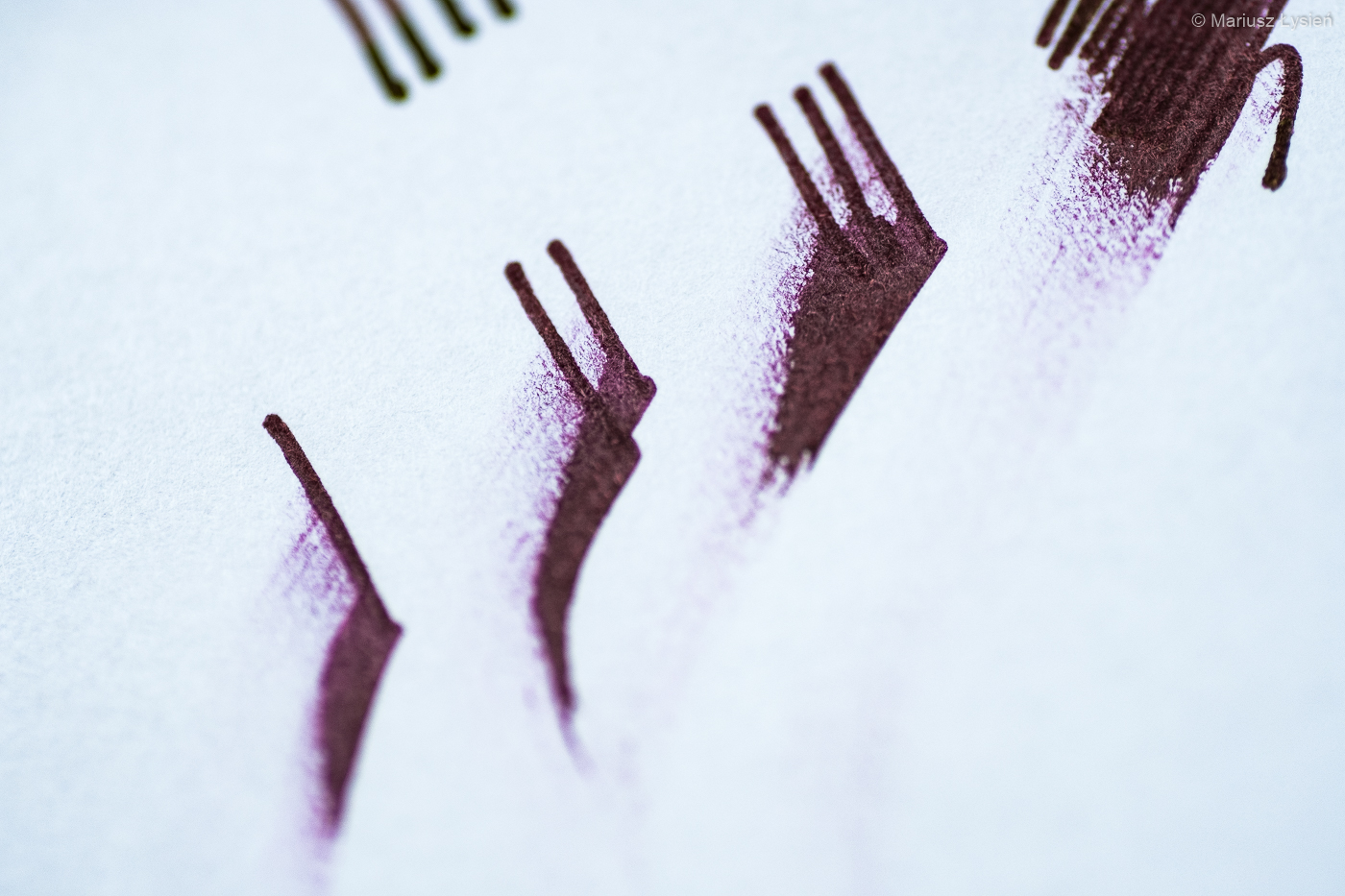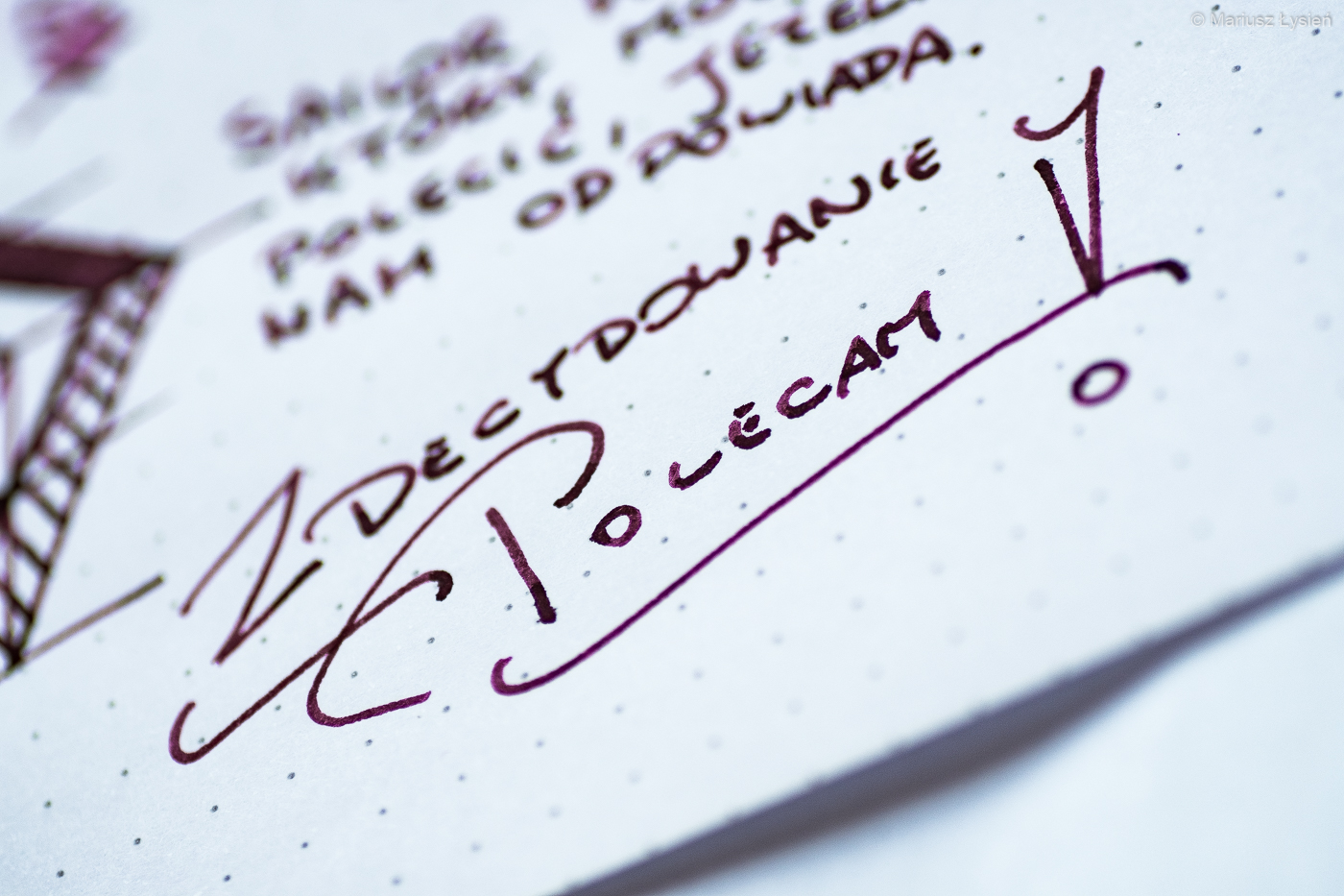 Bardzo pozytywnym zaskoczeniem jest czas wysychania – po nieco ponad 5 sekundach mamy już suchy tekst. Przy założeniu, że piszemy szeroką i mokrą stalówką, jest to wynik rewelacyjny.