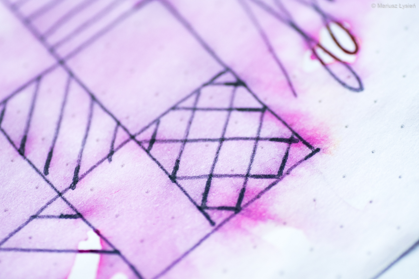 Wodoodporność również wypada świetnie. Woda co prawda wypłukuje purpurowy barwnik, jednak na papierze pozostaje bardzo wyraźna, ciemno-grafitowa baza, dzięki której bez trudu odczytamy treść zapisanych notatek.