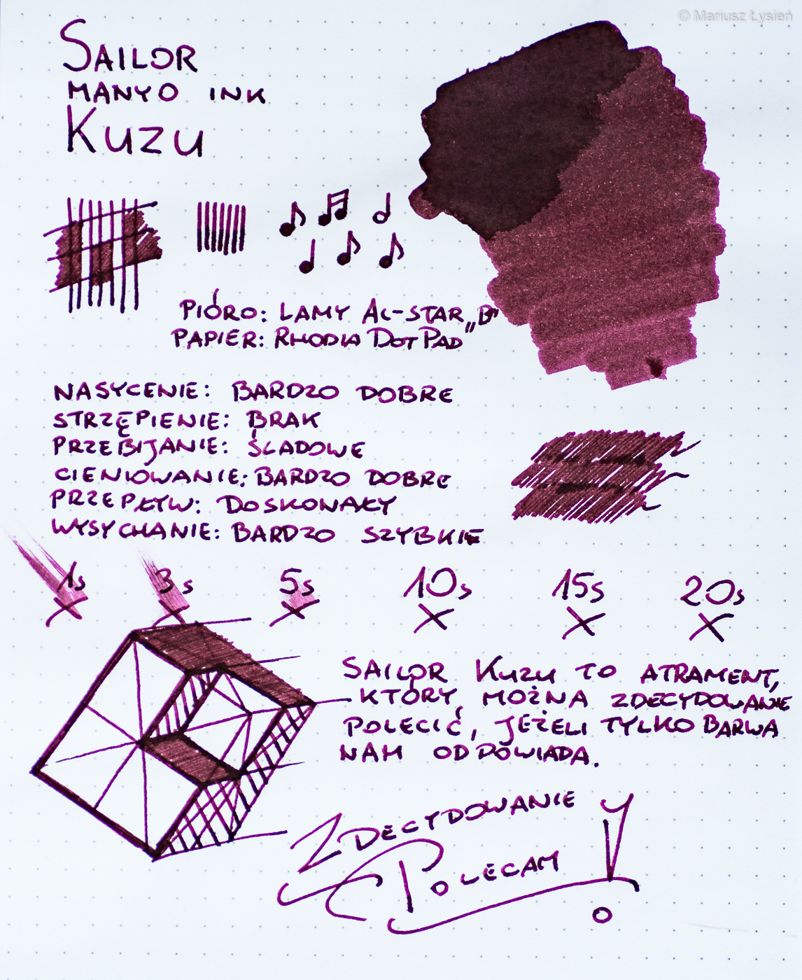 Sailor Manyo Ink – Kuzu to atrament, który zdecydowanie polecam – zarówno miłośnikom tego typu barw, jak i wszystkim, którzy chcieliby ich spróbować. Warto dodać Kuzu do własnej kolekcji atramentów – szczególnie jeżeli zależy nam na atramencie, który nie tylko ma doskonale parametry i szybko schnie, ale ma też odpowiednio dużą wodoodporność.