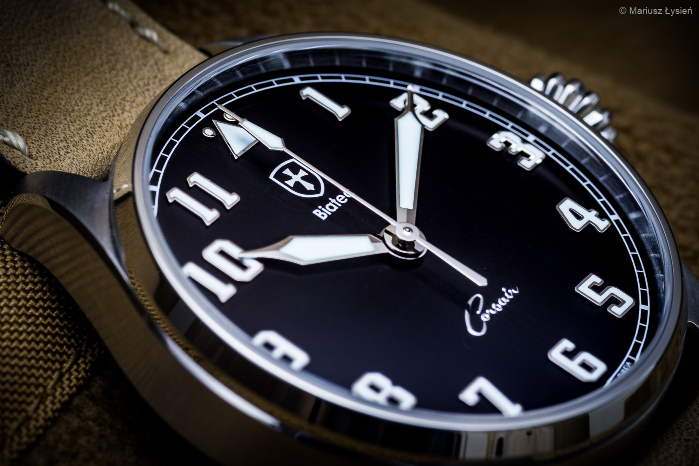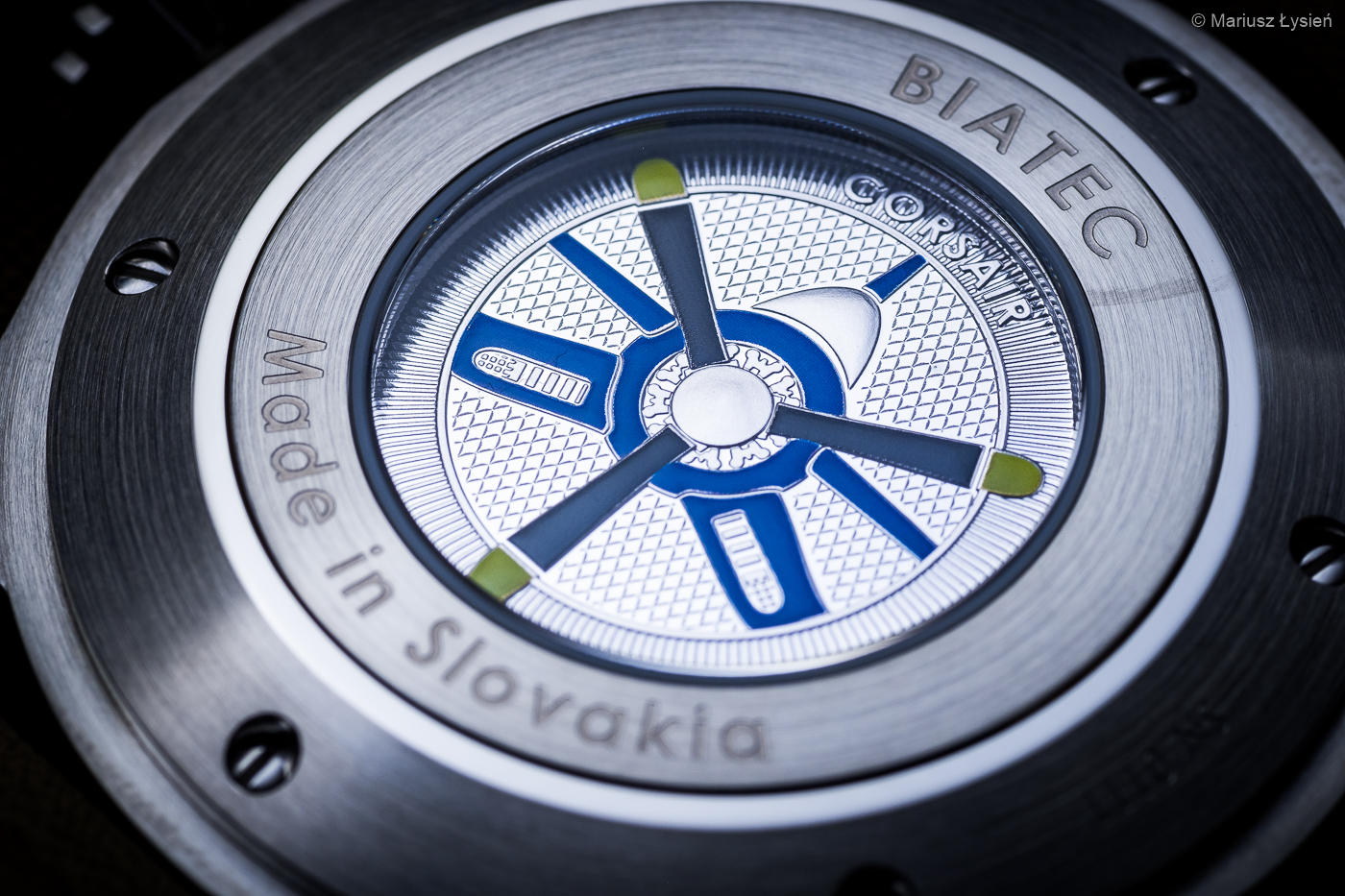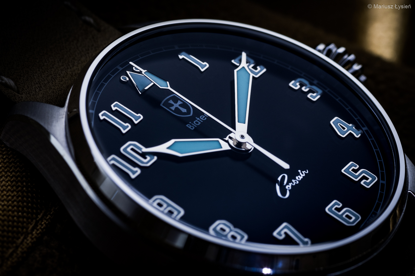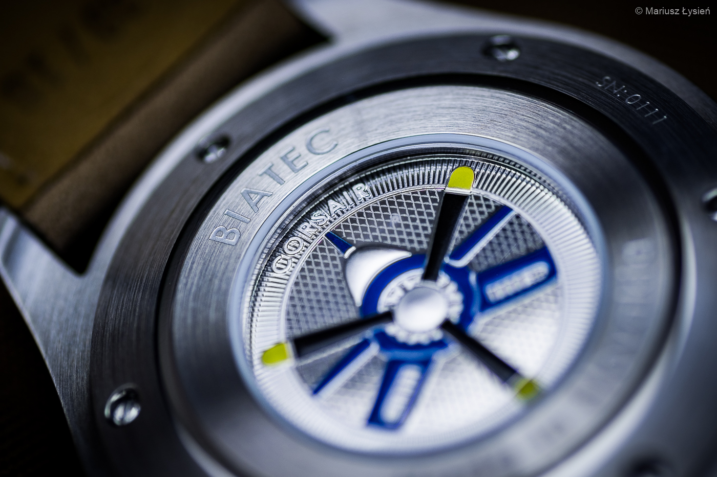 Biatec Corsair CS01F to bardzo interesujący zegarek typu „pilot”. Projekt jest dokładnie taki jakiego oczekiwalibyśmy po czasomierzu o tej stylistyce – jest prosto i przejrzyści. Miłym akcentem jest fakt, że na przykład cyferblat nie jest kopią innych projektów, co zdarza się wielu producentom, którzy momentami nieco zbyt mocno inspirują się pierwowzorem. Tył zegarka również prezentuje się doskonale. Cieszy także dbałość o jakość wykonania – wszystkie elementy zostały wycięte i oszlifowane bardzo dobrze, dzięki czemu nawet oglądając je pod dużym powiększeniem nie znajdziemy niedoróbek. Tarcza czy wskazówki również są idealnie czyste, co wbrew pozorom nie jest standardem. W cenie 1380 Euro uważam, że jest to z pewnością jedna z najciekawszych propozycji – dla mnie byłaby wręcz faworytem w wyborze zegarka typu „pilot” we wspomnianym budżecie.