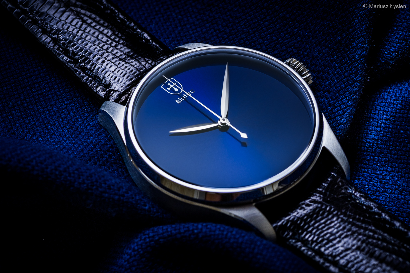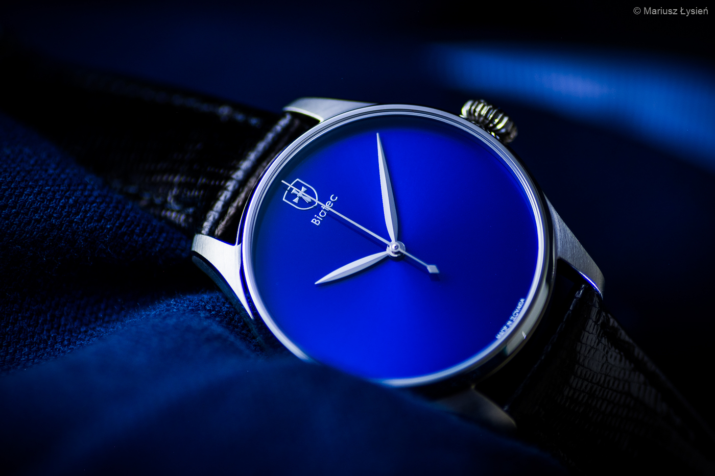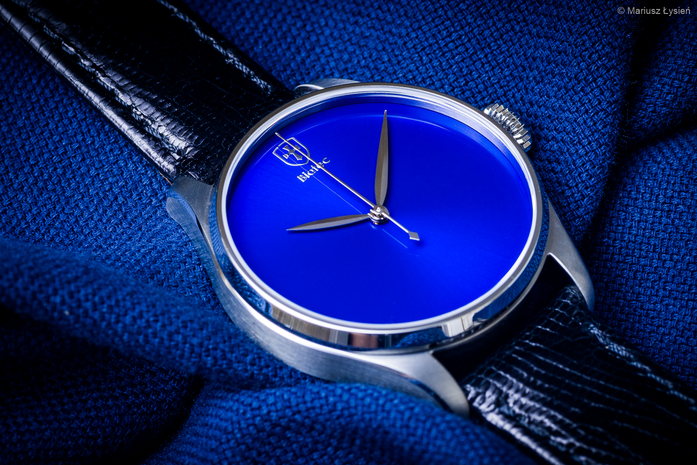 O cyferblacie nie można napisać zbyt wiele, poza tym, że prezentuje się zjawiskowo. Szafirowo-niebieska powierzchnia została dodatkowo ozdobiona szlifem słonecznym. Centralnie osadzone wskazówki prezentują się wyśmienicie, połyskując delikatnie nad urzekającą głębią koloru. Na cyferblacie umieszczono wyłącznie logo producenta oraz informację o kraju produkcji zegarka. Nie znajdziemy tutaj żadnych indeksów godzinowych czy też minutowych. Pierwsze wrażenie jest specyficzne – ma się wrażenie, że zegarek będzie trudny w codziennym użytkowaniu. Przez pierwszych kilka sekund miałem nawet myśl „piękny, ale jak tego używać?”. Po chwili jednak nasz umysł adaptuje się do takiej sytuacji i podświadomie zaczynamy odczytywać czas – oczywiście w pewnym przybliżeniu. Z pewnością nie jest to czasomierz mogący zastąpić nam na przykład stoper. Uczciwie jednak muszę przyznać, że do codziennego użytkowania precyzja jest wystarczająca.