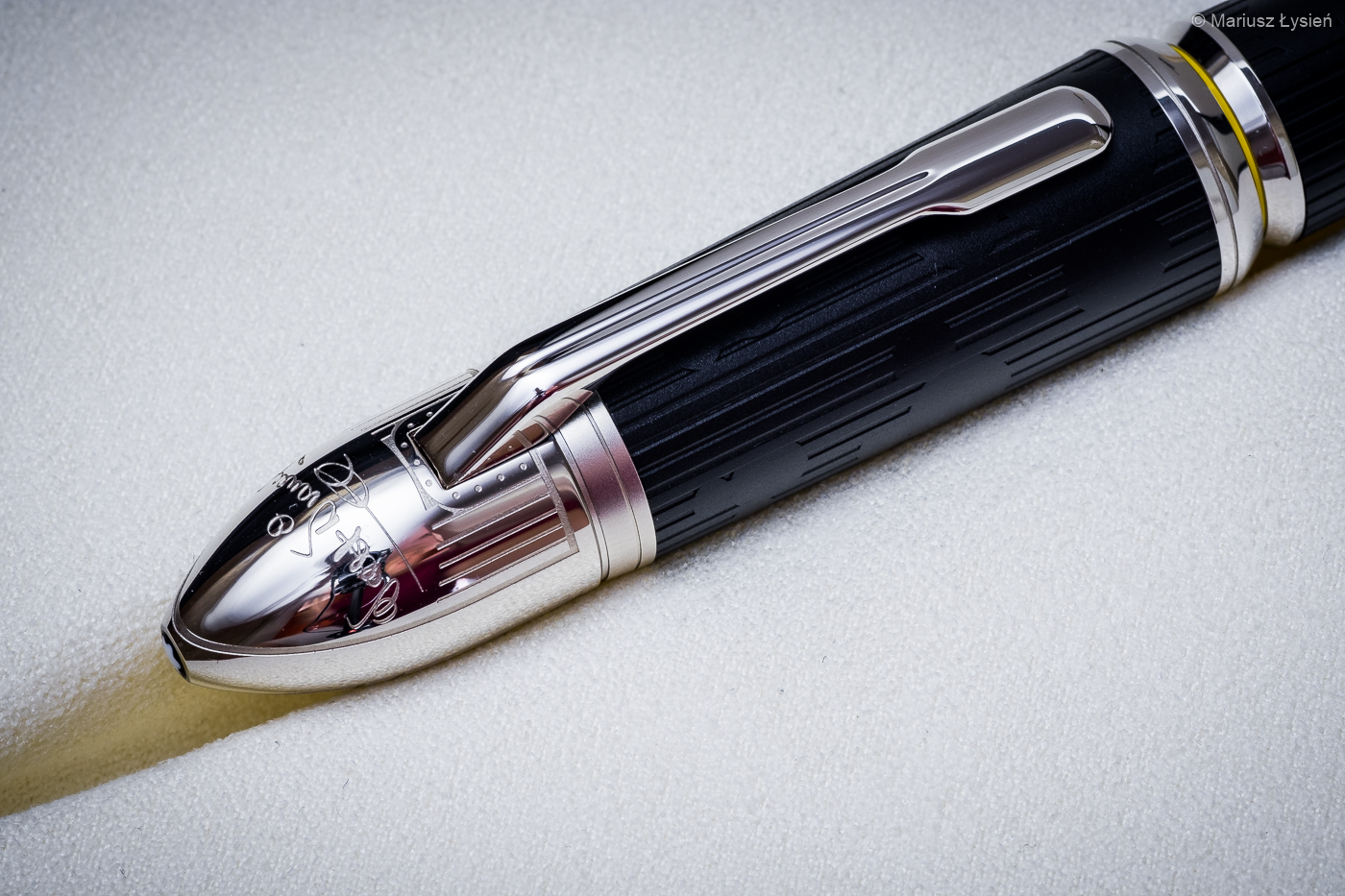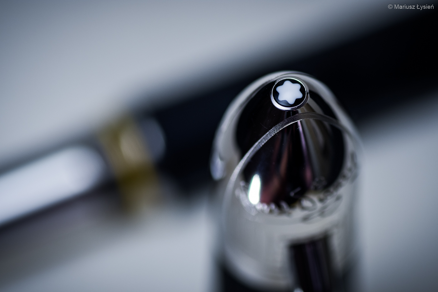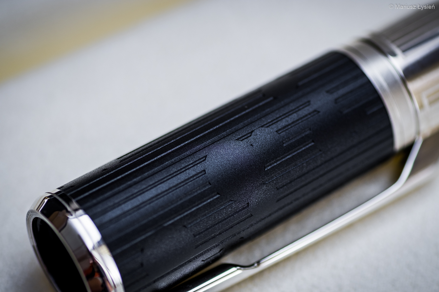 Klips jest przyjemnie elastyczny. Zakres ruchu tego elementu jest optymalnie dobrany – nie powinniśmy trafić na notes, którego oprawa przekroczyłaby graniczną wartość ruchu klipsa. Sprężyna wewnątrz sprawia, że klips łatwo odgiąć, a jednocześnie trzyma on pióro całkiem pewnie. Na szczycie skuwki umieszczono logo producenta – zaskakujący jest jednak jego rozmiar. Jest to chyba najmniejsze logo MB jakie widzieliśmy do tej pory na szczycie skuwki pióra.