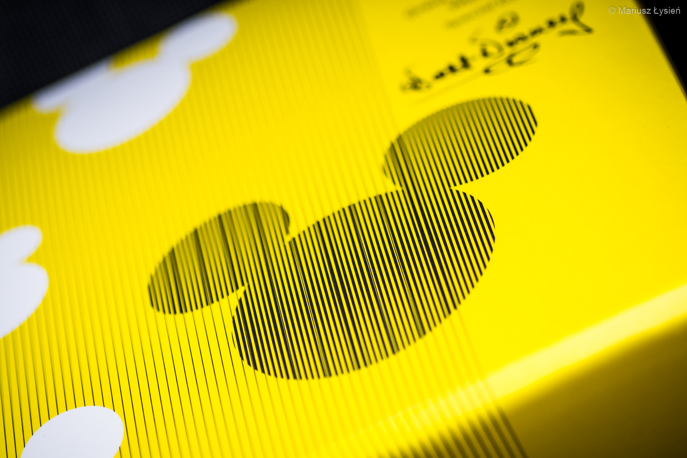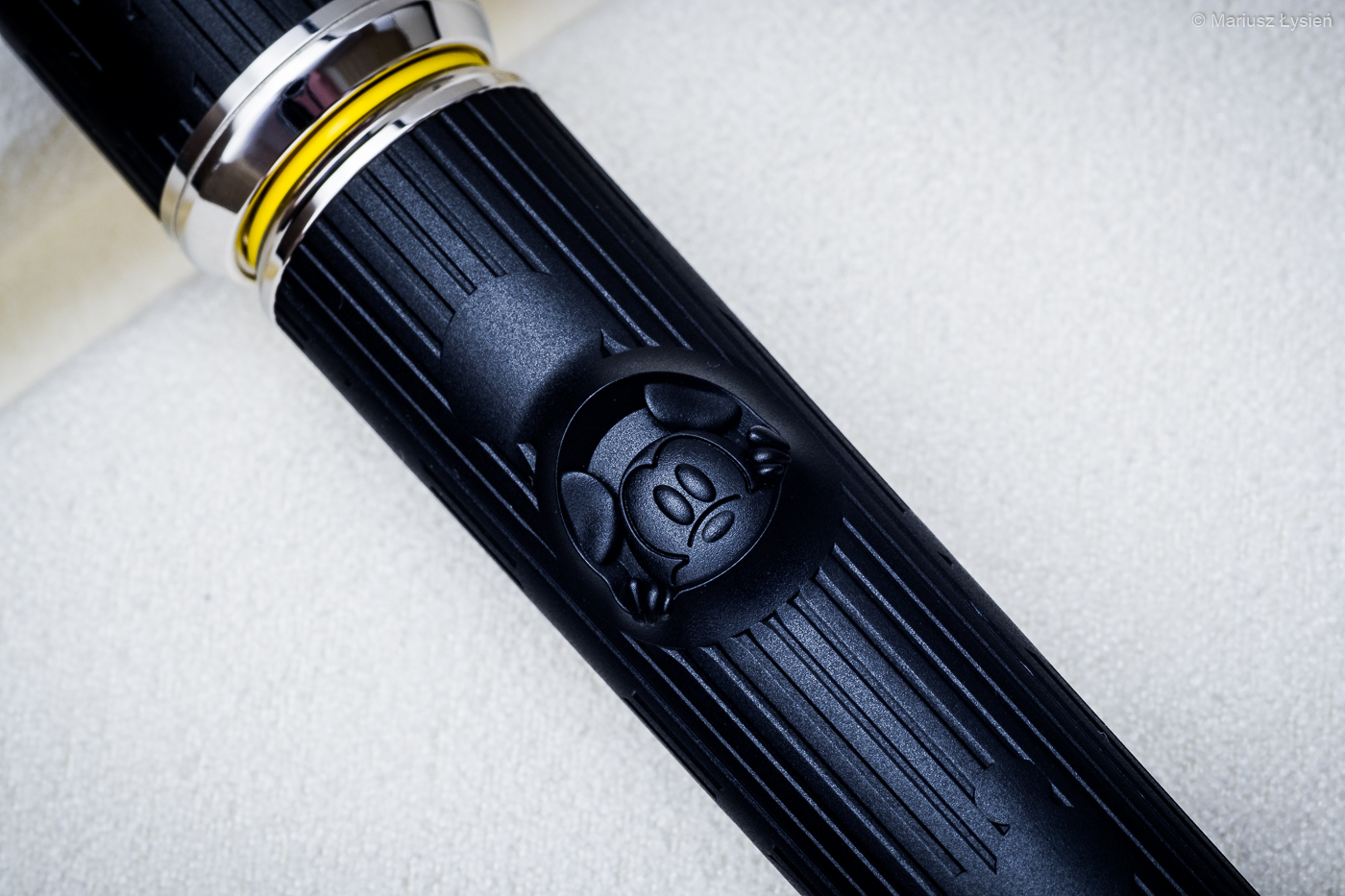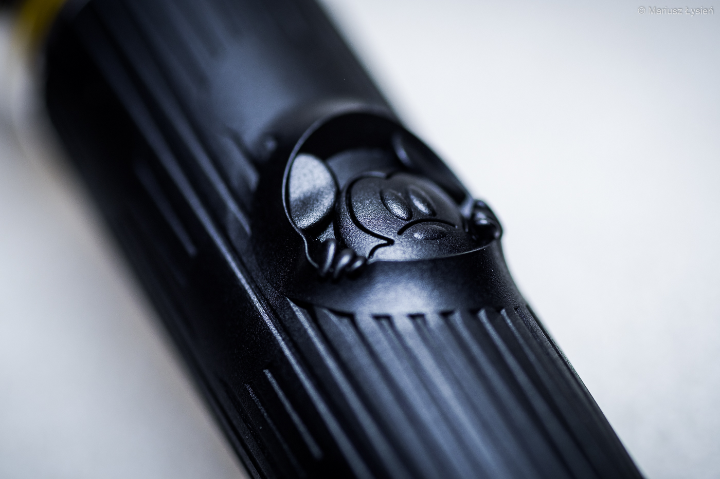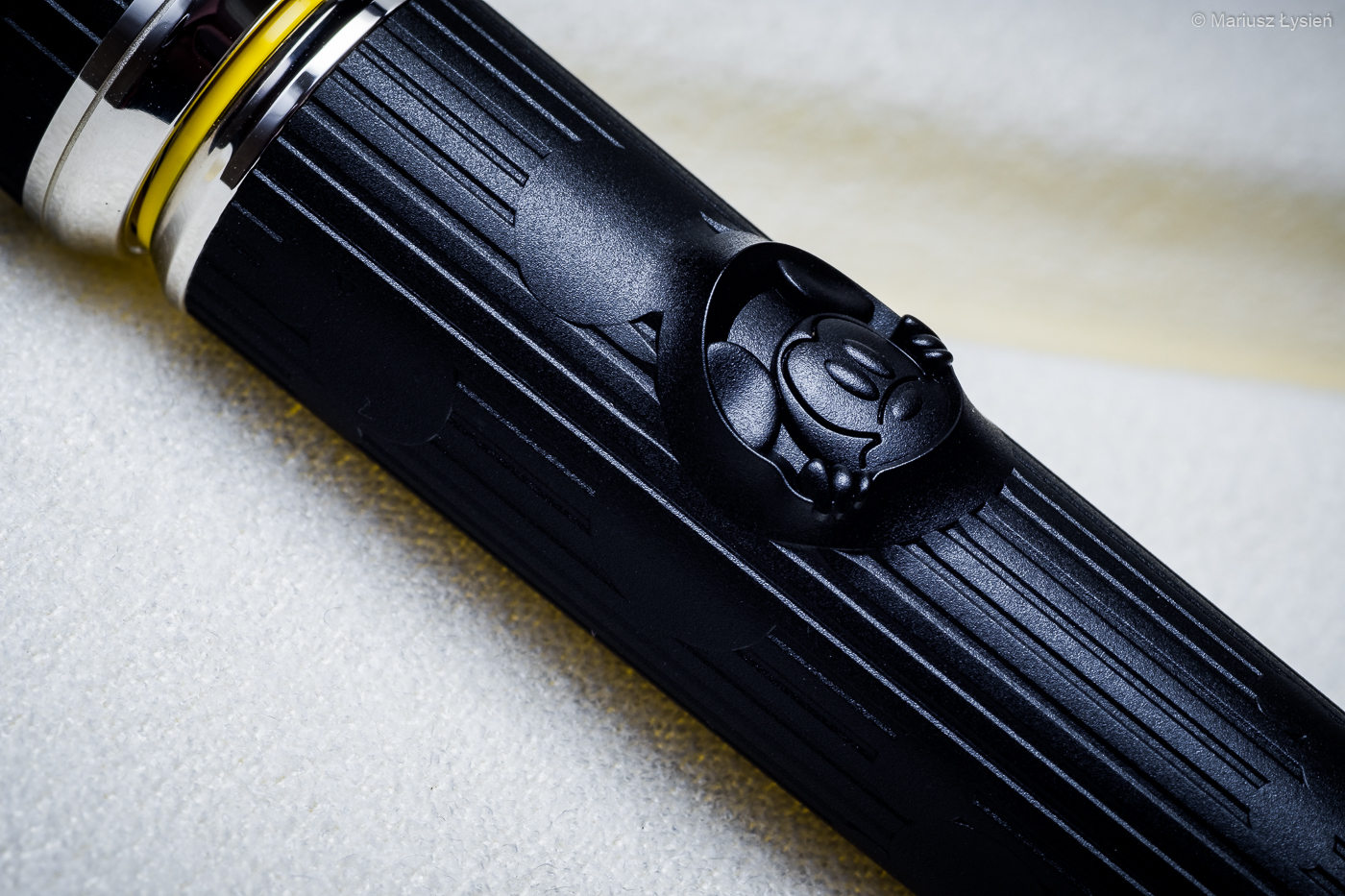 Jeżeli chodzi o opis specyfikacji technicznej, to opisywaliśmy ją TUTAJ. Jeżeli chodzi jednak o wrażenie jakie sprawia pióro, to oglądane z większej odległości prezentuje się bardzo elegancko. Srebrno-czarny, podłużny kształt nie zdradza zbyt wielu detali, które widoczne są dopiero przy oglądaniu przyboru z bliska. Z bliska zresztą nie traci nic ze swojej elegancji, a dodatkowe detale wzbogacają odbiór wizualny. Powierzchnia żywicy jest matowa i przyjemna w dotyku. Wzdłuż skuwki oraz korpusu umieszczono liczne podłużnie ułożone pasy, które przenikają się z licznymi podobiznami Myszki Miki. Na korpusie umieszczono także ciekawy akcent – wyglądającą z wnętrza pióra Myszkę Miki. Początkowo byłem nieco sceptyczny do tego rozwiązania, ale okazuje się, że detale te nie są zbyt nachalne – głównie przez jednobarwną kolorystykę. Dwa kolorowe pierścienie inspirowane barwami Myszki Miki doskonale ożywiają całą kompozycję.