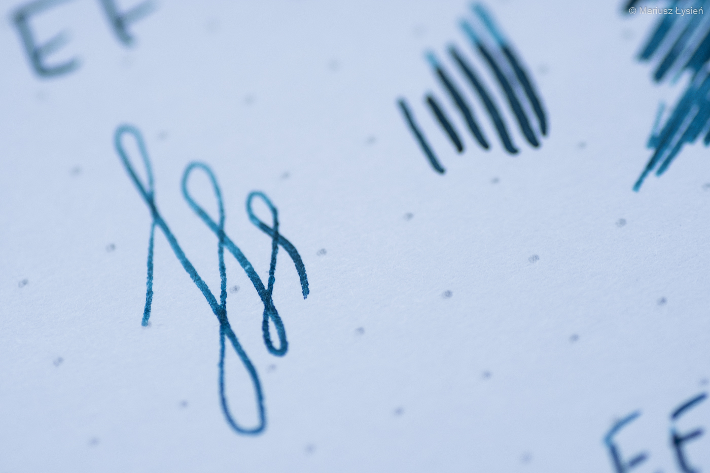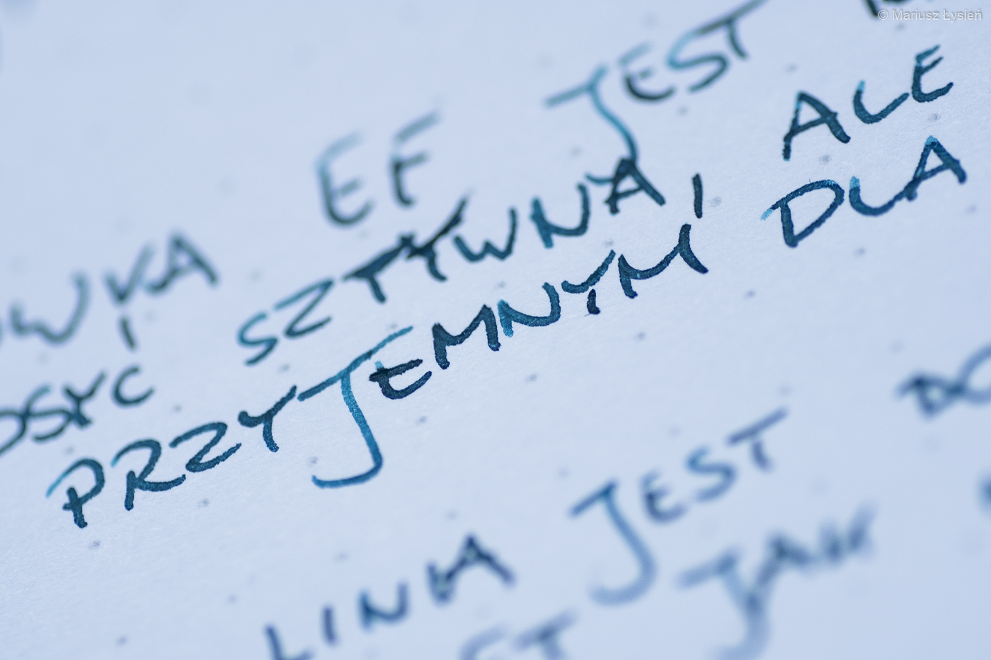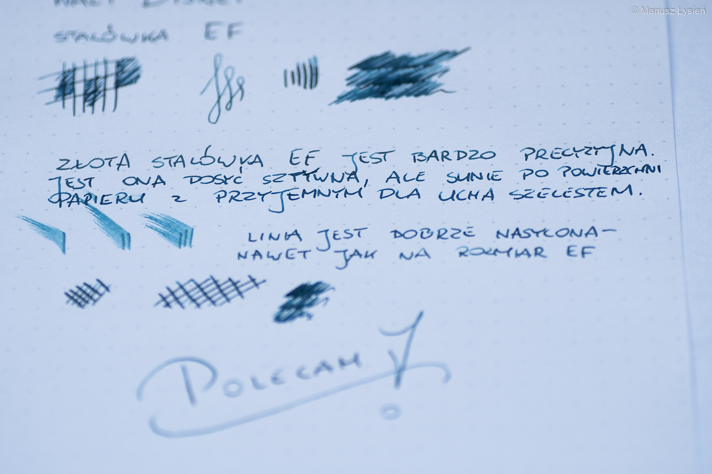 Na stalówce również umieszczono podobiznę Myszki Miki. Stalówka wykonana z 14 karatowego złota nie jest zbyt elastyczna, jednak oferuje bardzo dużą precyzję – szczególnie, że w piórze zamontowano stalówkę o szerokości EF. Pomimo tak niewielkiej szerokości linii, kreska pozostająca na papierze jest dobrze nasycona. Osobiście preferuję stalówki oferujące szerszą linię, jednak zawsze wspominam, że EF firmy Montblanc jest jedną z niewielu EF jakimi mógłbym pisać. Żona jest ze stalówki zadowolona, lecz ona preferuje głównie EF.