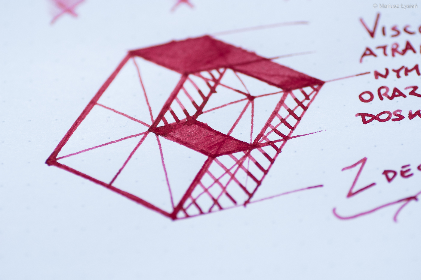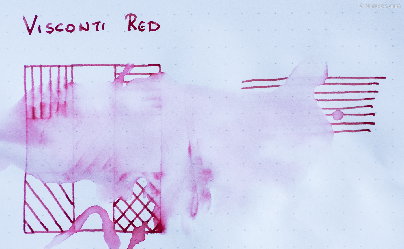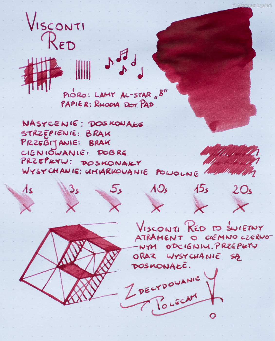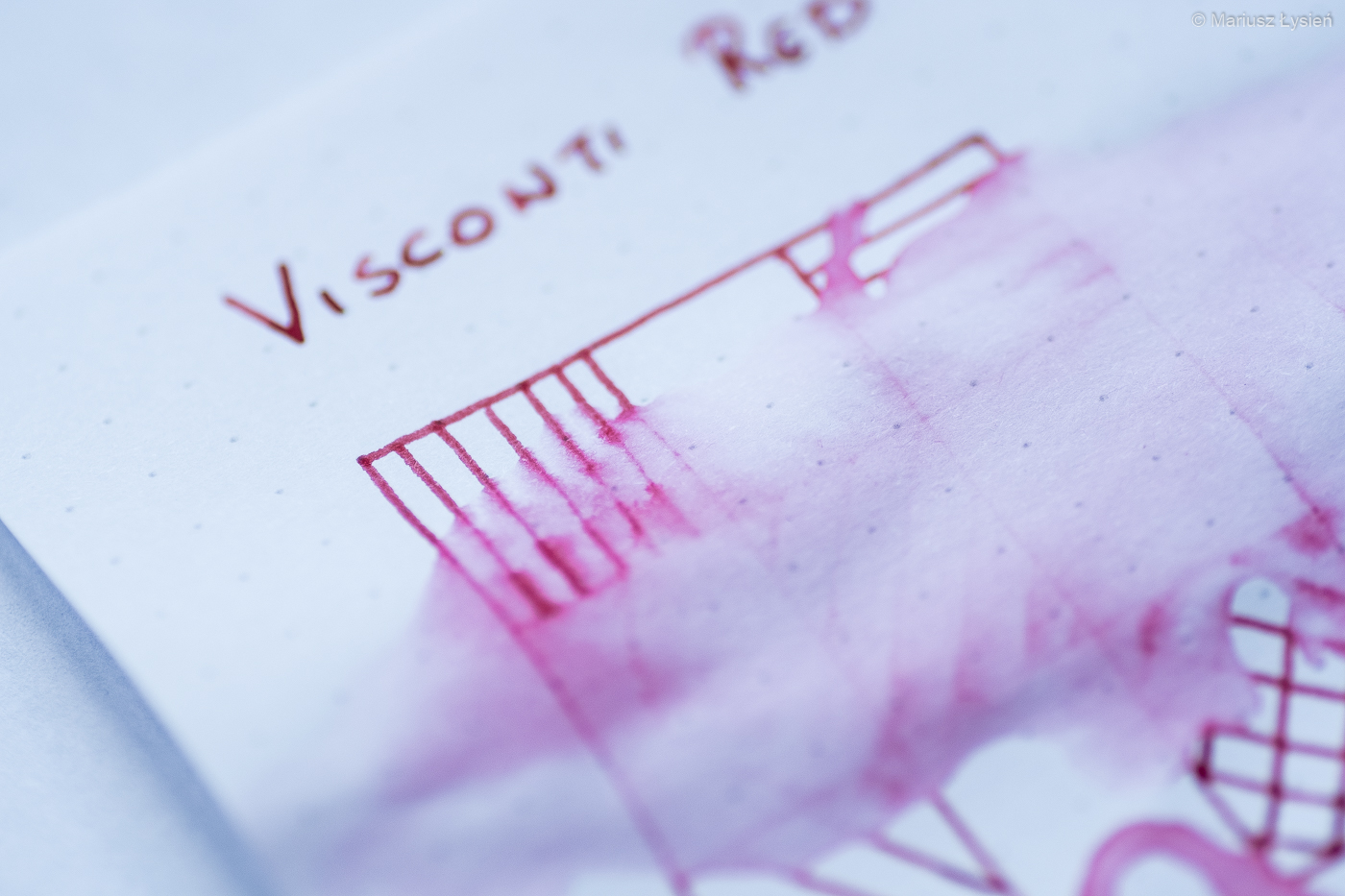 Visconti Red to bardzo dobry czerwony atrament. Zdecydowanie polecam go także osobom, które poszukują czerwonego atramentu, który wpada w lekko burgundowy odcień. Cieszy mnie fakt, że Visconti nie tylko stworzyło ciekawą formę kałamarza, ale że powrócono do użycia szkła. Zawartość oczywiście też jest jak najbardziej godna uwagi. Przyznam, że po kolorze czerwonym, chciałbym przyjrzeć się bliżej niebieskiemu i turkusowemu.