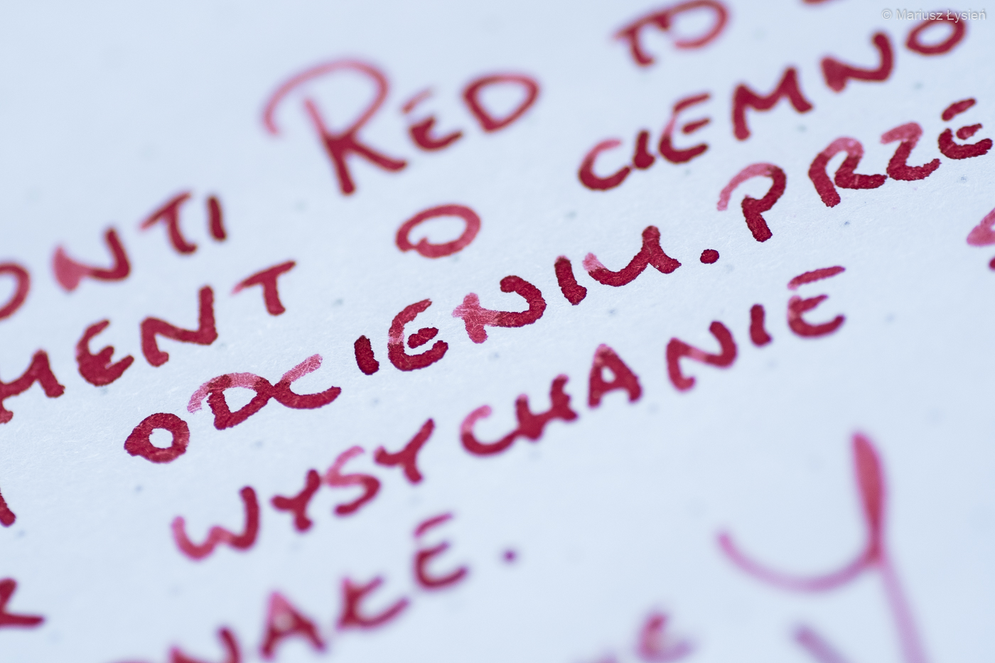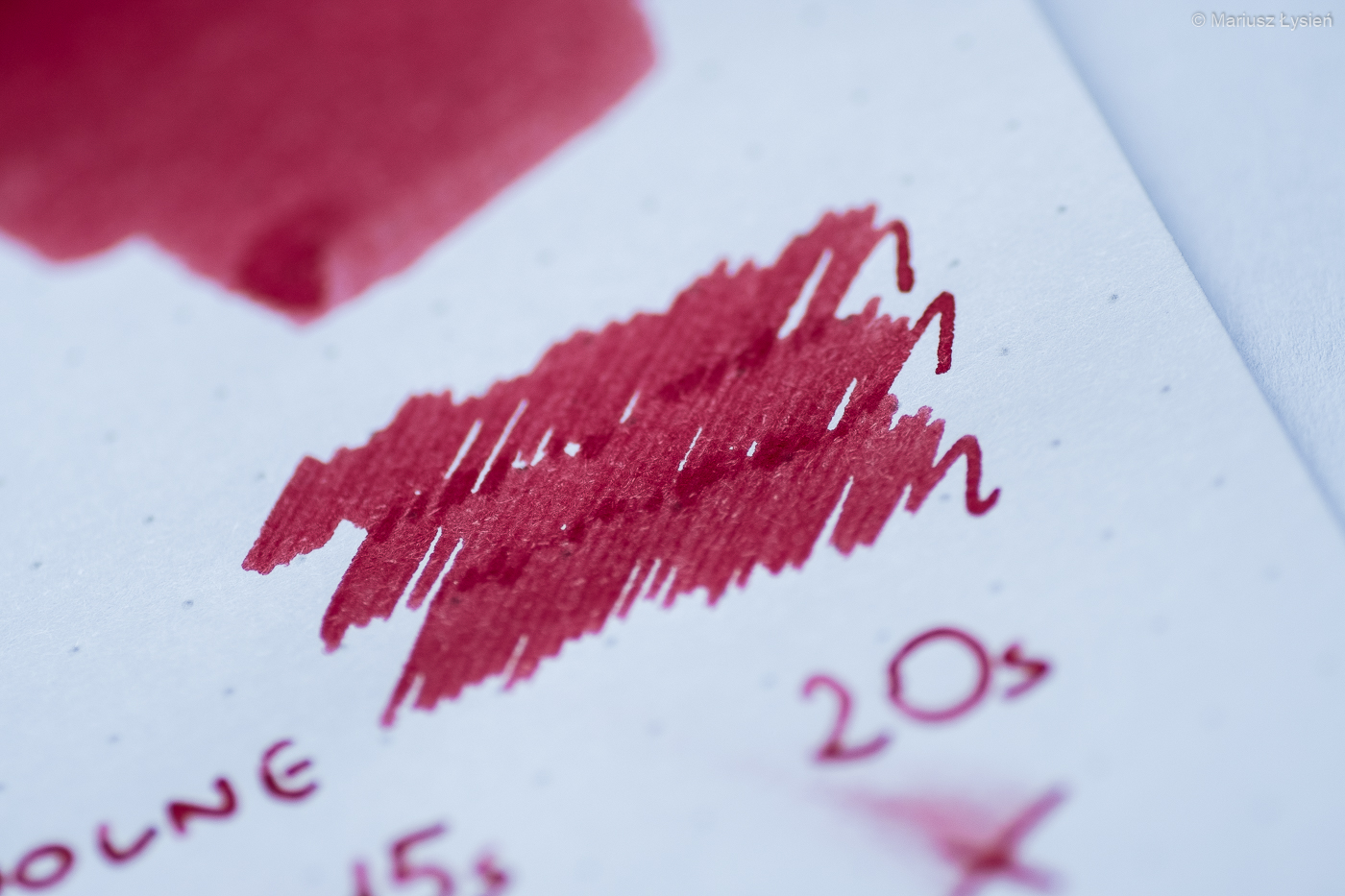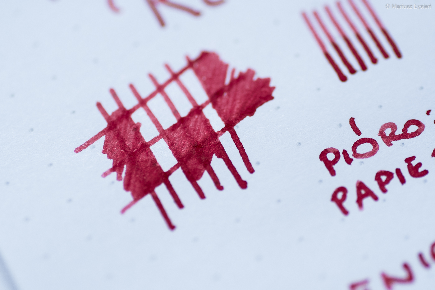 Nasycenie jest doskonałe. Kolor jest na papierze bardzo wyraźny, co przekłada się na bardzo dobrą czytelność tekstu sporządzanego przy użyciu tytułowego atramentu. Czerwony kolor został lekko przełamany burgundową nutą. Kolor ten na papierze prezentuje się elegancko.