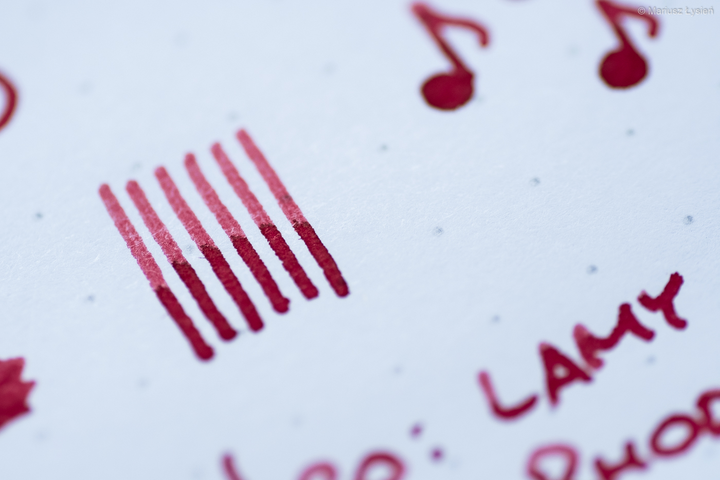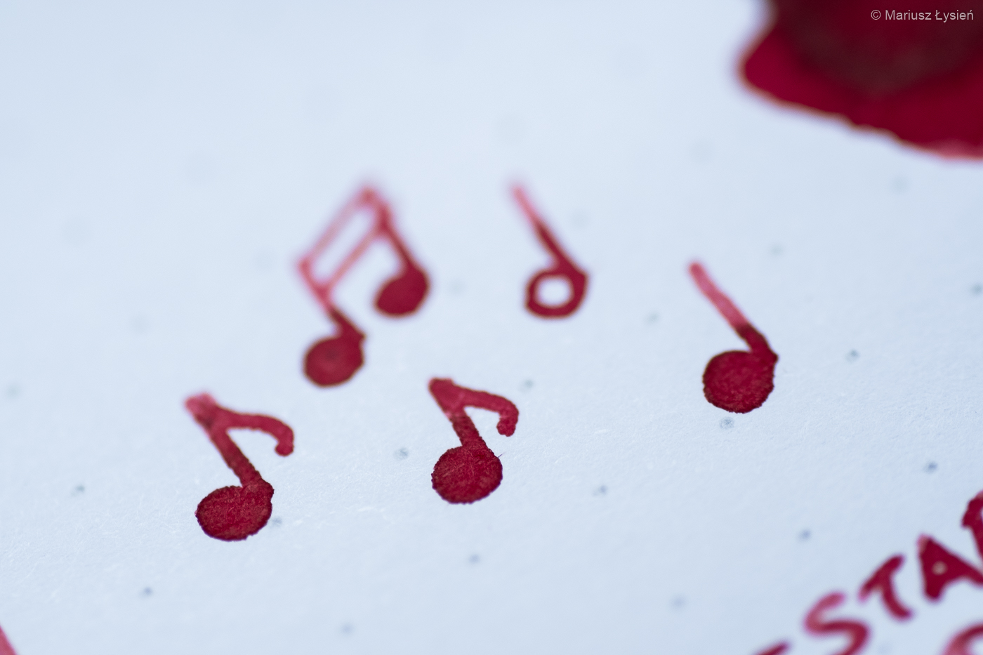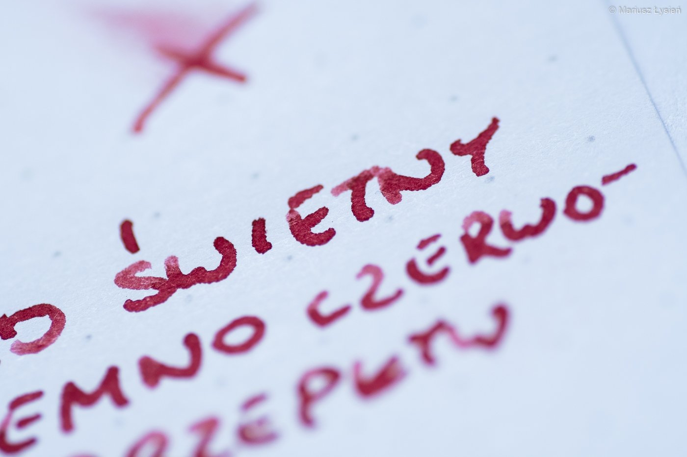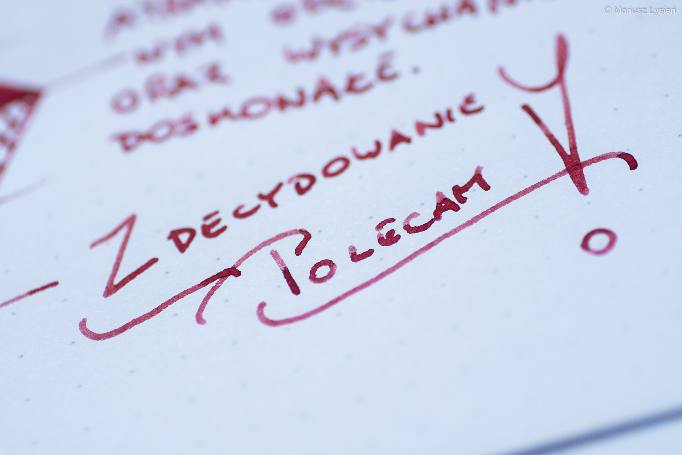 Nasycenie jest doskonałe. Kolor jest na papierze bardzo wyraźny, co przekłada się na bardzo dobrą czytelność tekstu sporządzanego przy użyciu tytułowego atramentu. Czerwony kolor został lekko przełamany burgundową nutą. Kolor ten na papierze prezentuje się elegancko.