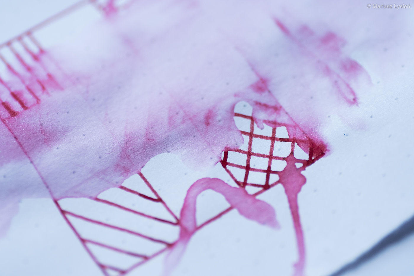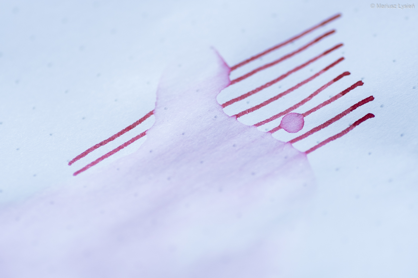 Przepływ jest doskonały. Stalówka jest wzorowo nawilżana – do podawania cieczy również nie można mieć najmniejszych zastrzeżeń. Pod względem przepływu atrament plasuje się w czołówce. Czas wysychania jest raczej długi, jednak to częsta przypadłość czerwonych atramentów, które w dodatku nie sprawiają wrażenia suchych.