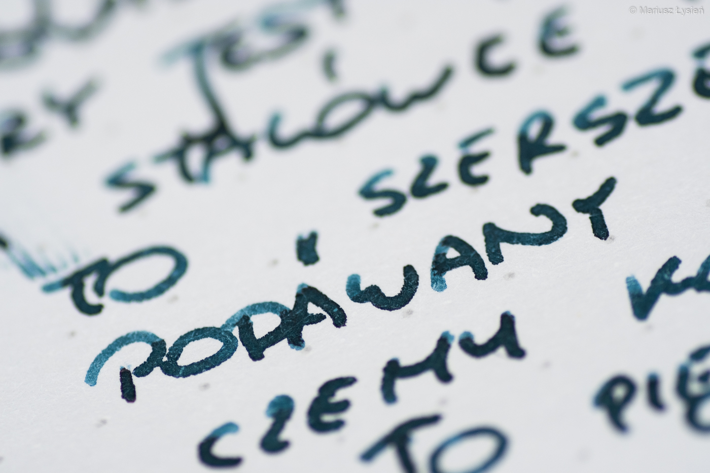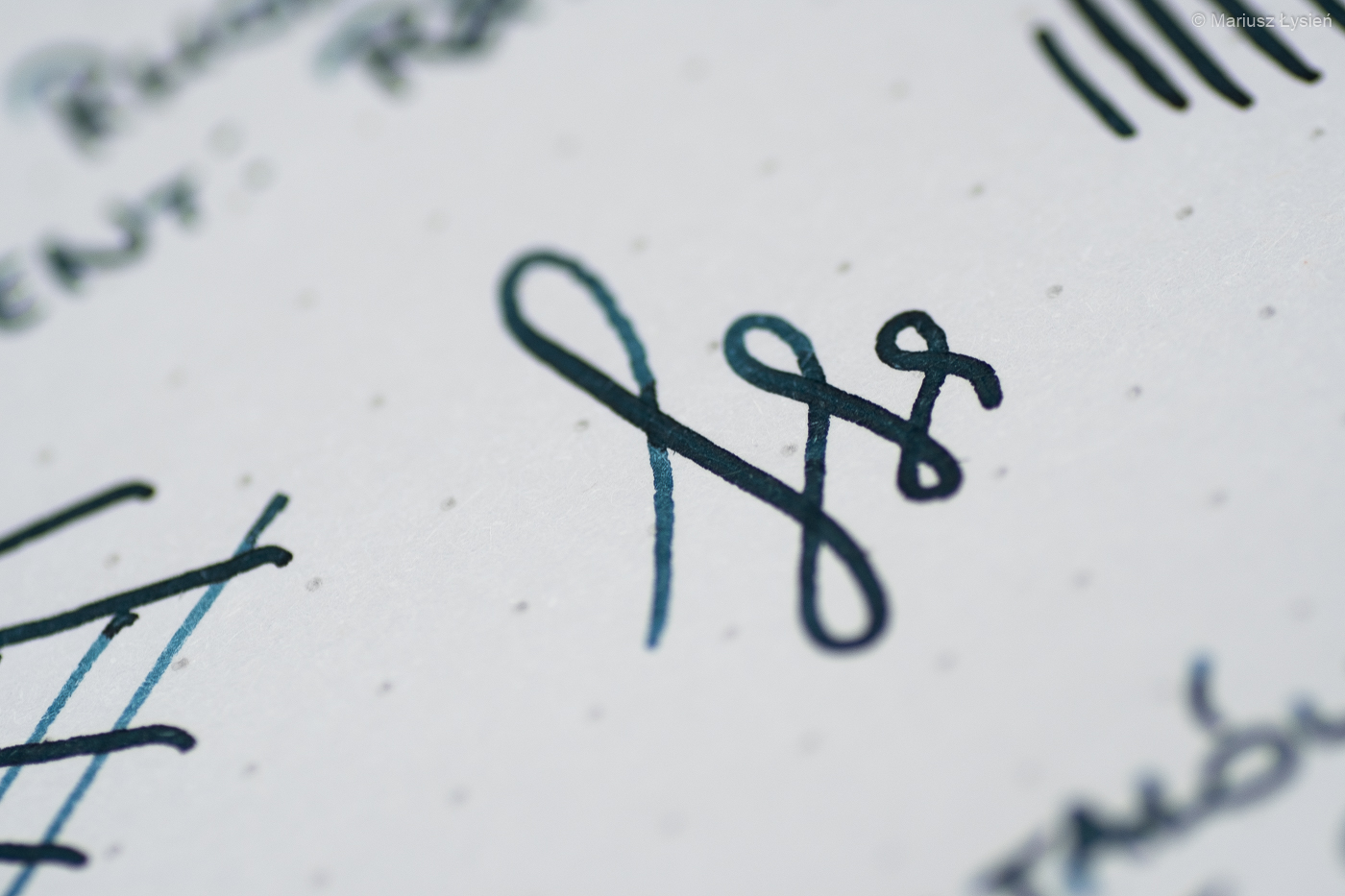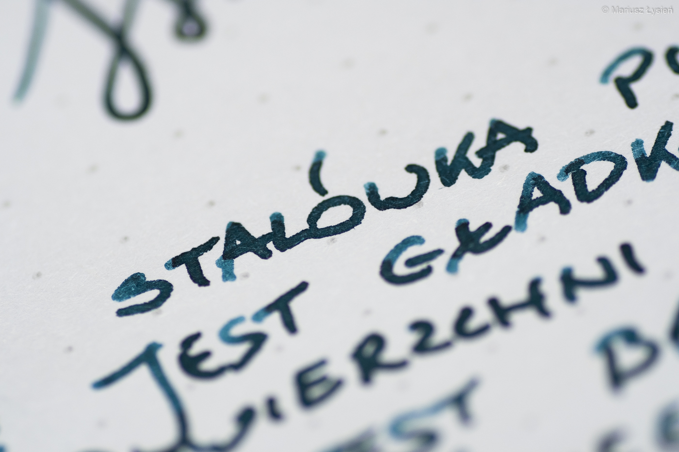 Stalówka została wykonana ze stali nierdzewnej, a jej powierzchnię pokryto powłoką galwaniczną. Stylistyka tego elementu również jest niezwykle prosta – na jej jednokolorowej powierzchni odnajdziemy jedynie stosunkowo płytki grawerunek logo, nazwy producenta czy nazwy miasta, które chyba skupia większą ilość producentów piór niż jakiekolwiek inne. Ten oszczędny w wyrazie stylistycznym zabieg sprawia, że wydaje nam się, że to będzie po prostu poprawnie działająca stalówka. Otóż nie – ta stalówka pisze po prostu fenomenalnie. Sunie ona po papierze z delikatnym, szlachetnym szelestem w sposób lekko aksamitny. Dodatkowo, jak na stalówkę wykonaną ze stali, możliwe jest uzyskanie co prawda niewielkiej ale jednak, różnicy grubości linii w zależności od siły nacisku. Atrament jest podawany raczej obficie, co również idealnie wpisuje się w moje preferencje. Ogólnie właściwości piśmiennicze zaskoczyły mnie niezwykle pozytywnie.