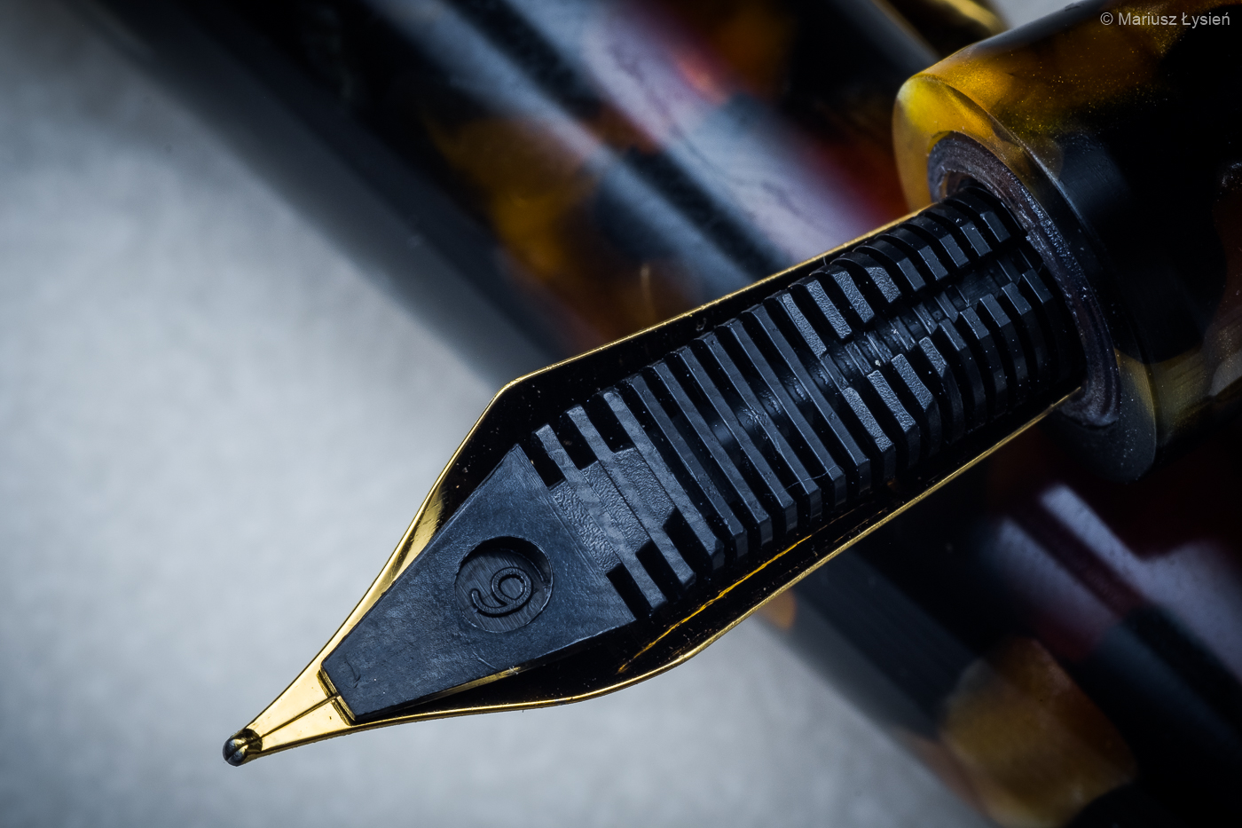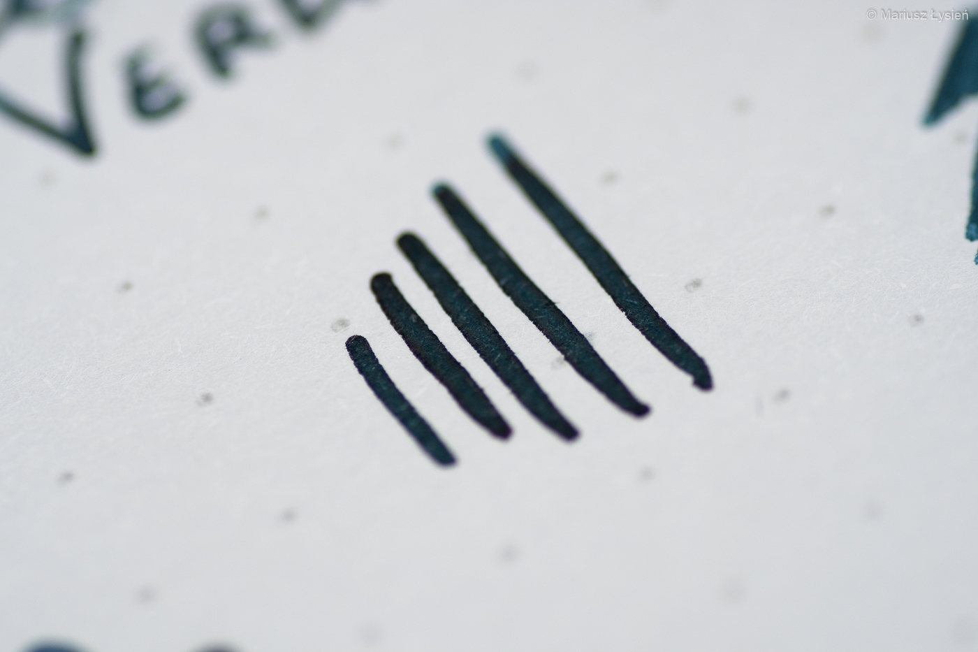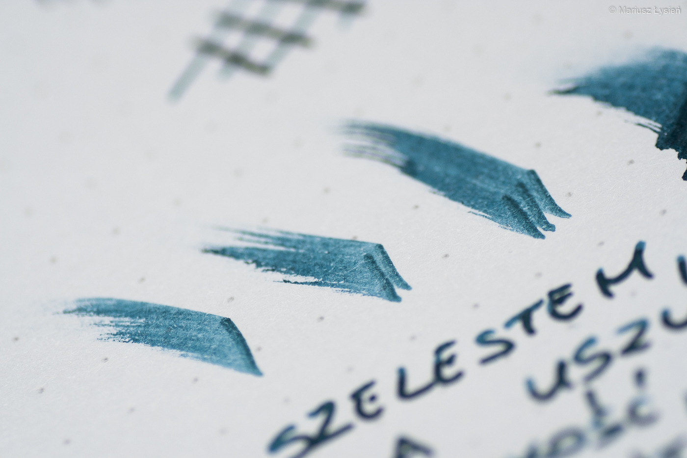 Stalówka została wykonana ze stali nierdzewnej, a jej powierzchnię pokryto powłoką galwaniczną. Stylistyka tego elementu również jest niezwykle prosta – na jej jednokolorowej powierzchni odnajdziemy jedynie stosunkowo płytki grawerunek logo, nazwy producenta czy nazwy miasta, które chyba skupia większą ilość producentów piór niż jakiekolwiek inne. Ten oszczędny w wyrazie stylistycznym zabieg sprawia, że wydaje nam się, że to będzie po prostu poprawnie działająca stalówka. Otóż nie – ta stalówka pisze po prostu fenomenalnie. Sunie ona po papierze z delikatnym, szlachetnym szelestem w sposób lekko aksamitny. Dodatkowo, jak na stalówkę wykonaną ze stali, możliwe jest uzyskanie co prawda niewielkiej ale jednak, różnicy grubości linii w zależności od siły nacisku. Atrament jest podawany raczej obficie, co również idealnie wpisuje się w moje preferencje. Ogólnie właściwości piśmiennicze zaskoczyły mnie niezwykle pozytywnie.