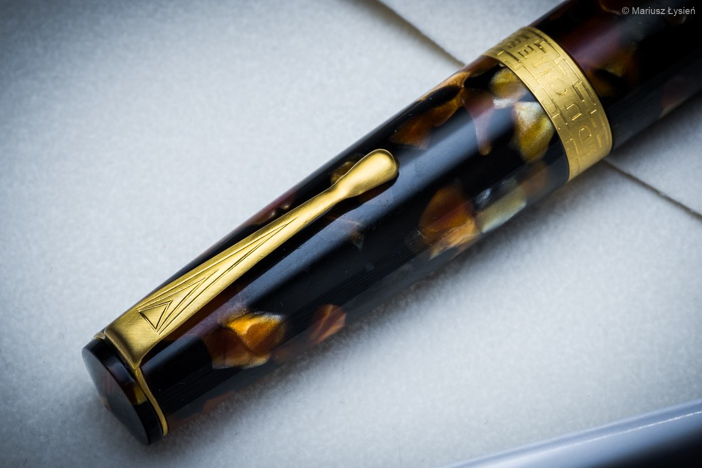 Materiał z którego wykonano pióro prezentuje się estetycznie i jest przyjemny w dotyku. Na uwagę zasługuje ciekawa kolorystyka, która w moim odczuciu być może średnio koreluje z określeniem fabrycznej nazwy koloru tj. Tan Brown, ale za to prezentuje się bardzo atrakcyjnie. Ciemną barwę żywicy przelatają delikatnie połyskujące wstawki, które dodatkowo uzupełniają transparentne fragmenty, które łatwo przeoczyć w pierwszym momencie. Na korpusie wygrawerowano nazwę producenta oraz logo, które nawiązuje do korony.